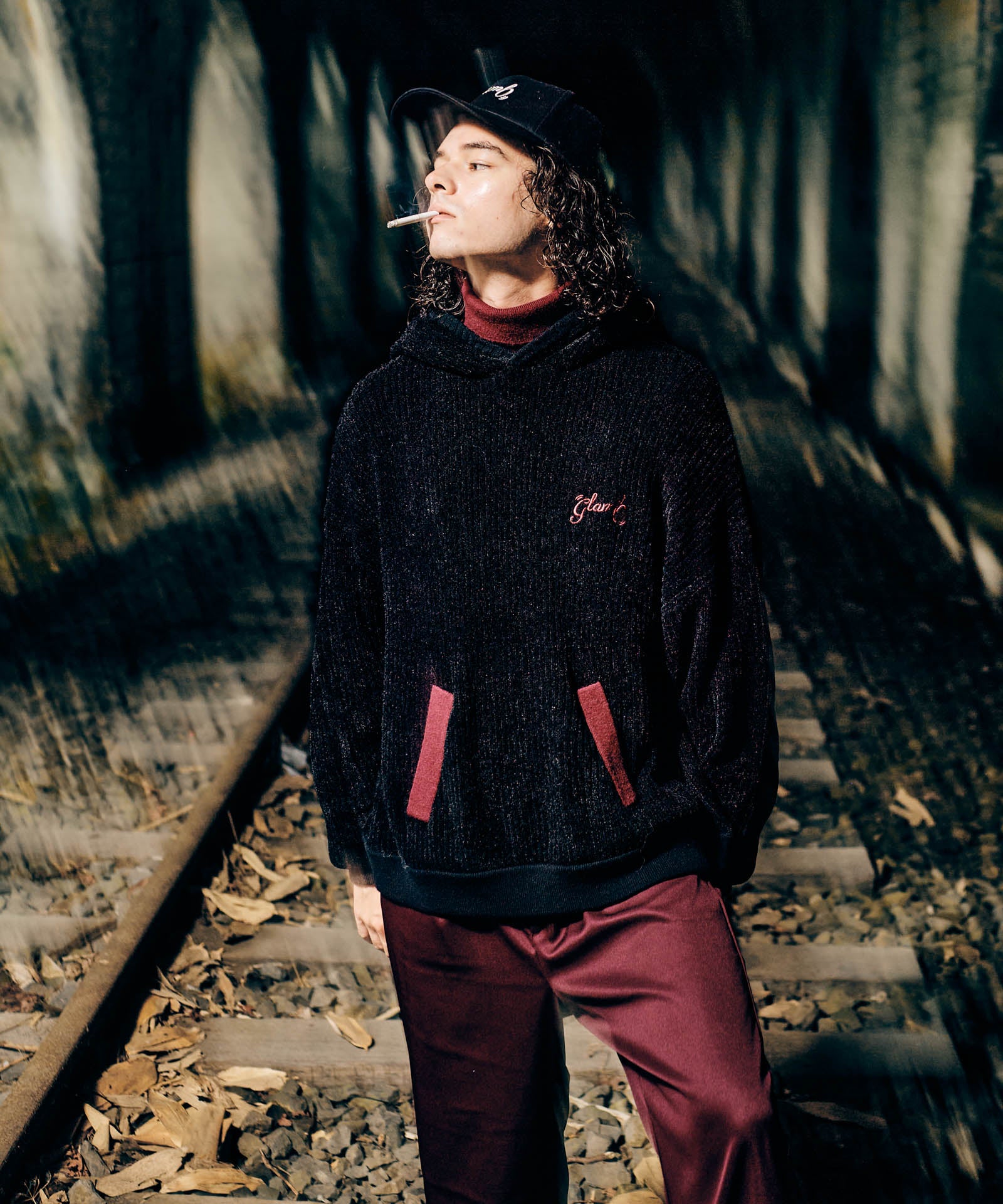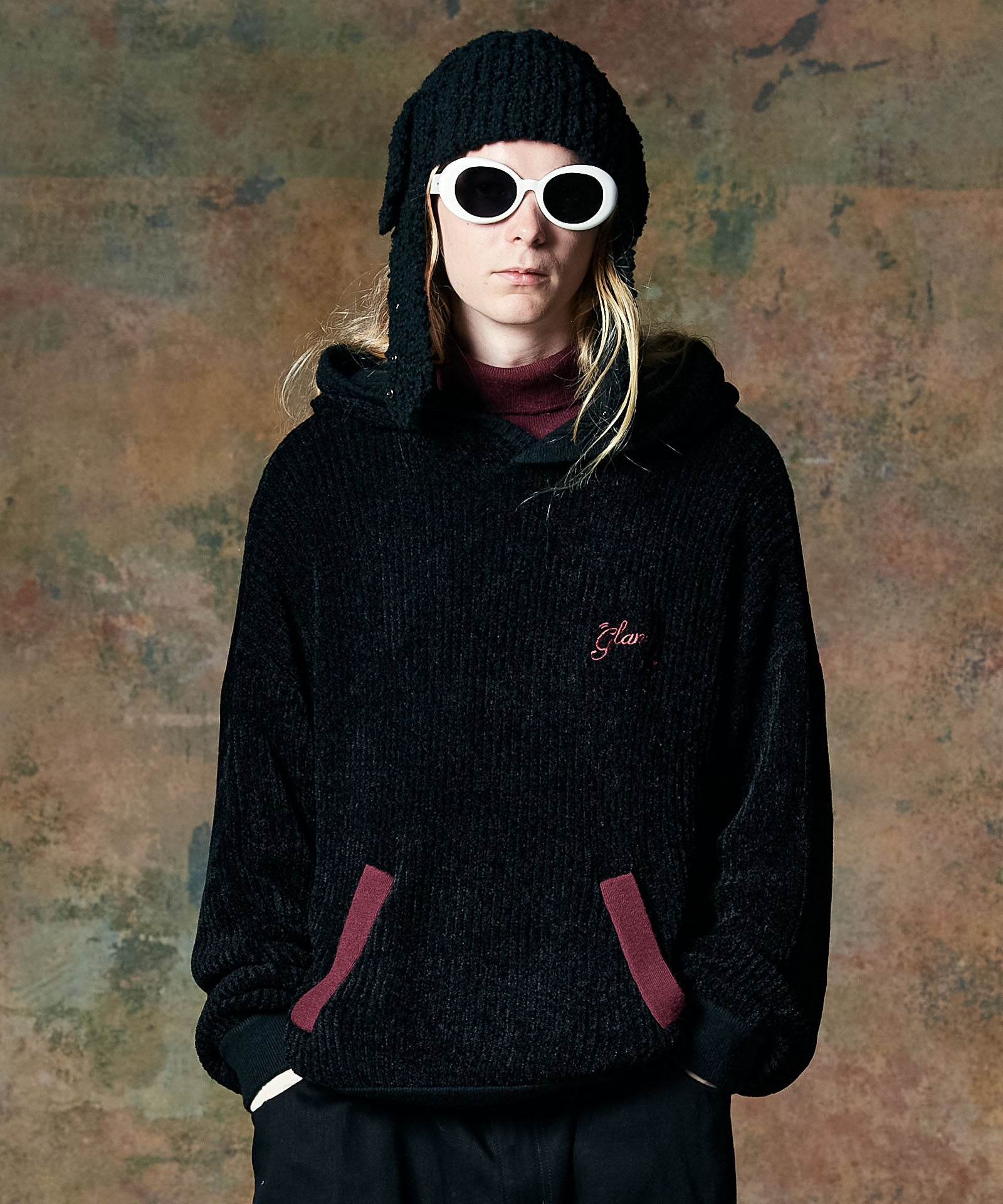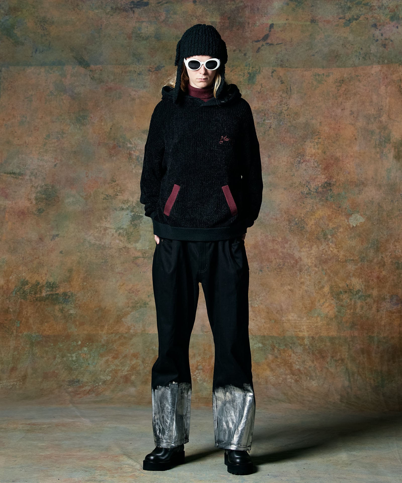 glambが得意とするフェイクレイヤードフーディを巧みなニッティングで構築したNeck Layered Knit Hoodie。ベロアモールをリブ編みにしたガーメントはブランケットのようにソフトな肌触り。艶やかな素材感とオーバーサイズボディのボリューム感が相まってリュクスな佇まいを生み出します。そこに留まらないブランドならではのディテールワークはフード内側にフェイクパーツであしらったタートルネック。そのディテールが際立つようネックと玉縁ポケットは配色使いを施し、リラックスとエレガンスが同居する1枚となりました。