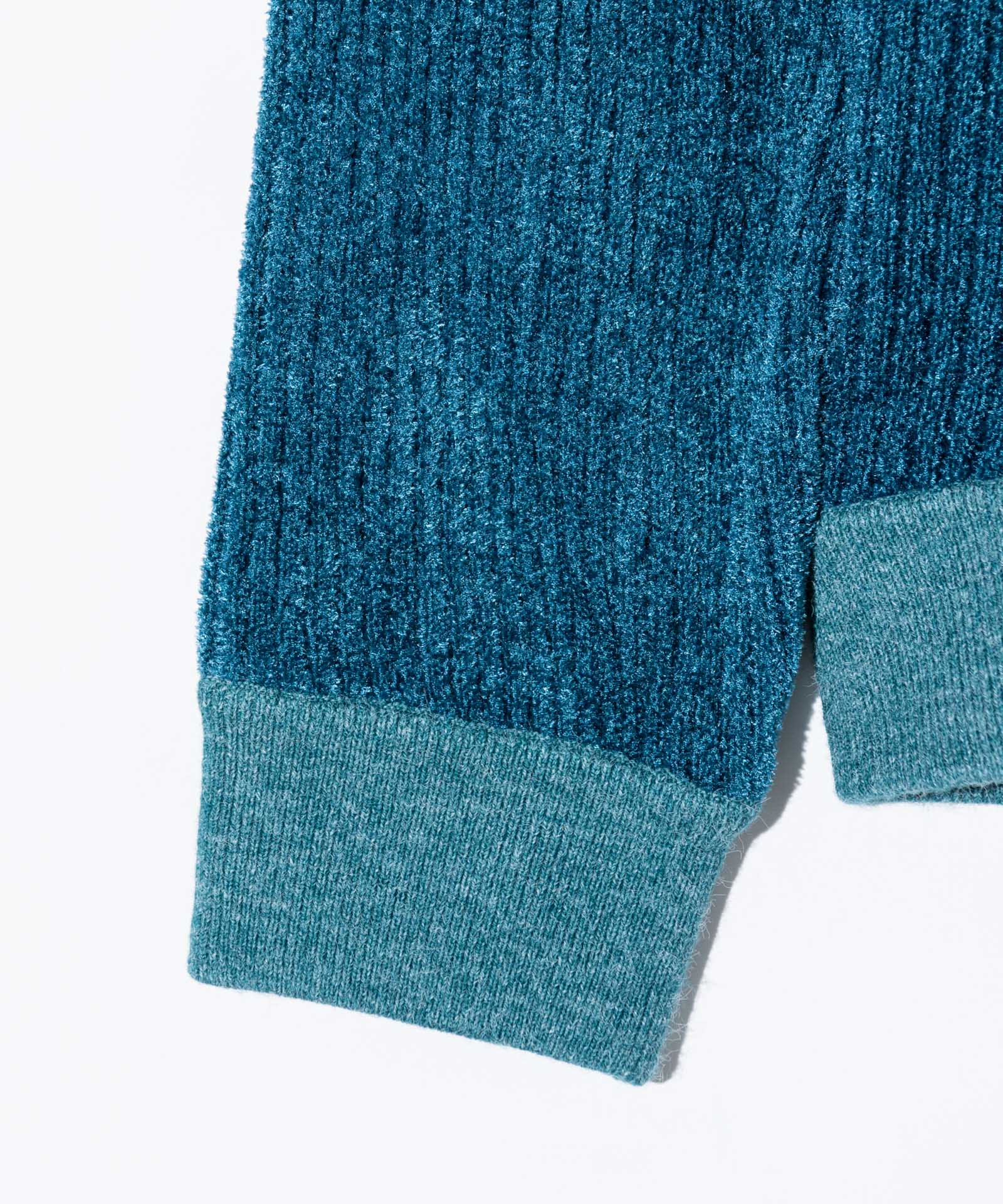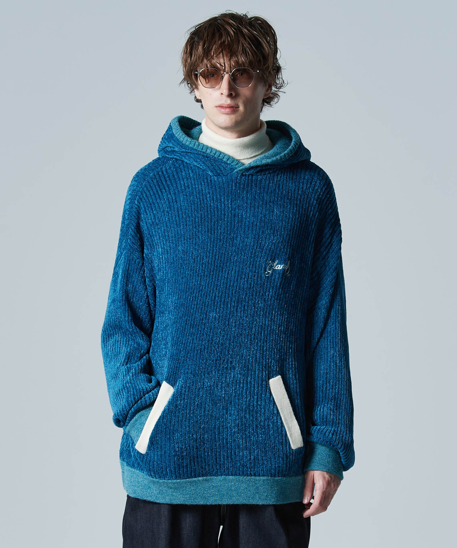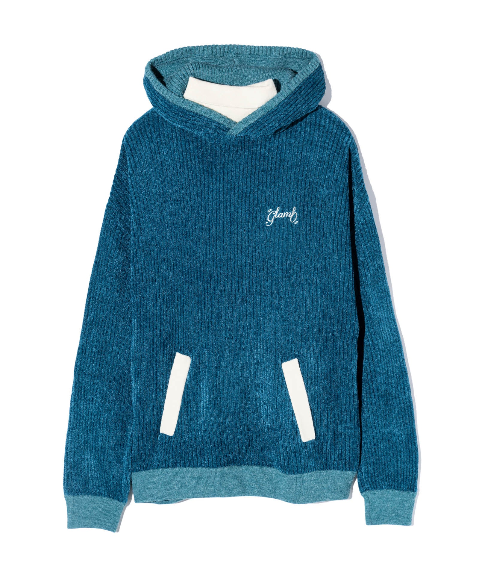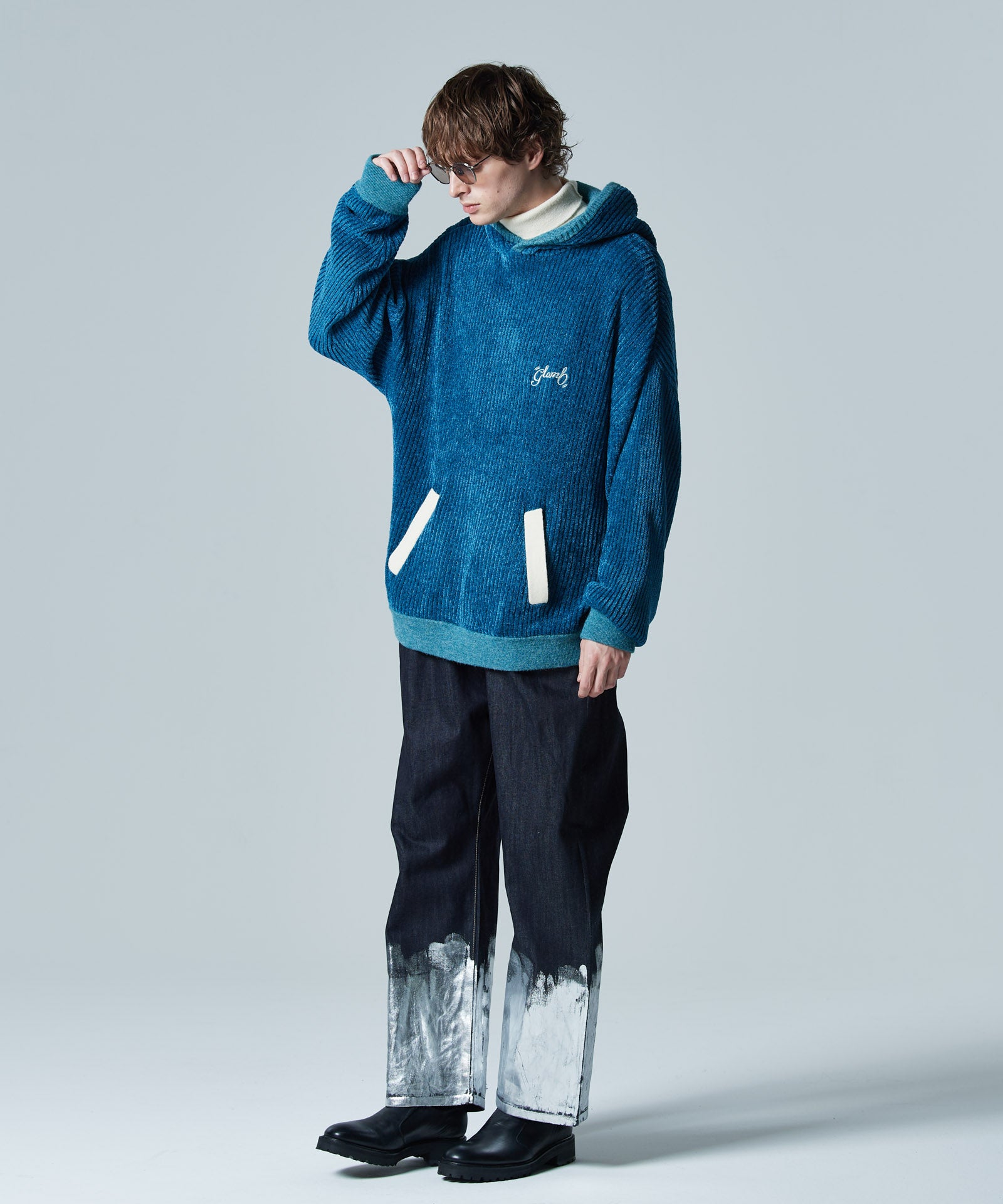 glambが得意とするフェイクレイヤードフーディを巧みなニッティングで構築したNeck Layered Knit Hoodie。ベロアモールをリブ編みにしたガーメントはブランケットのようにソフトな肌触り。艶やかな素材感とオーバーサイズボディのボリューム感が相まってリュクスな佇まいを生み出します。そこに留まらないブランドならではのディテールワークはフード内側にフェイクパーツであしらったタートルネック。そのディテールが際立つようネックと玉縁ポケットは配色使いを施し、リラックスとエレガンスが同居する1枚となりました。