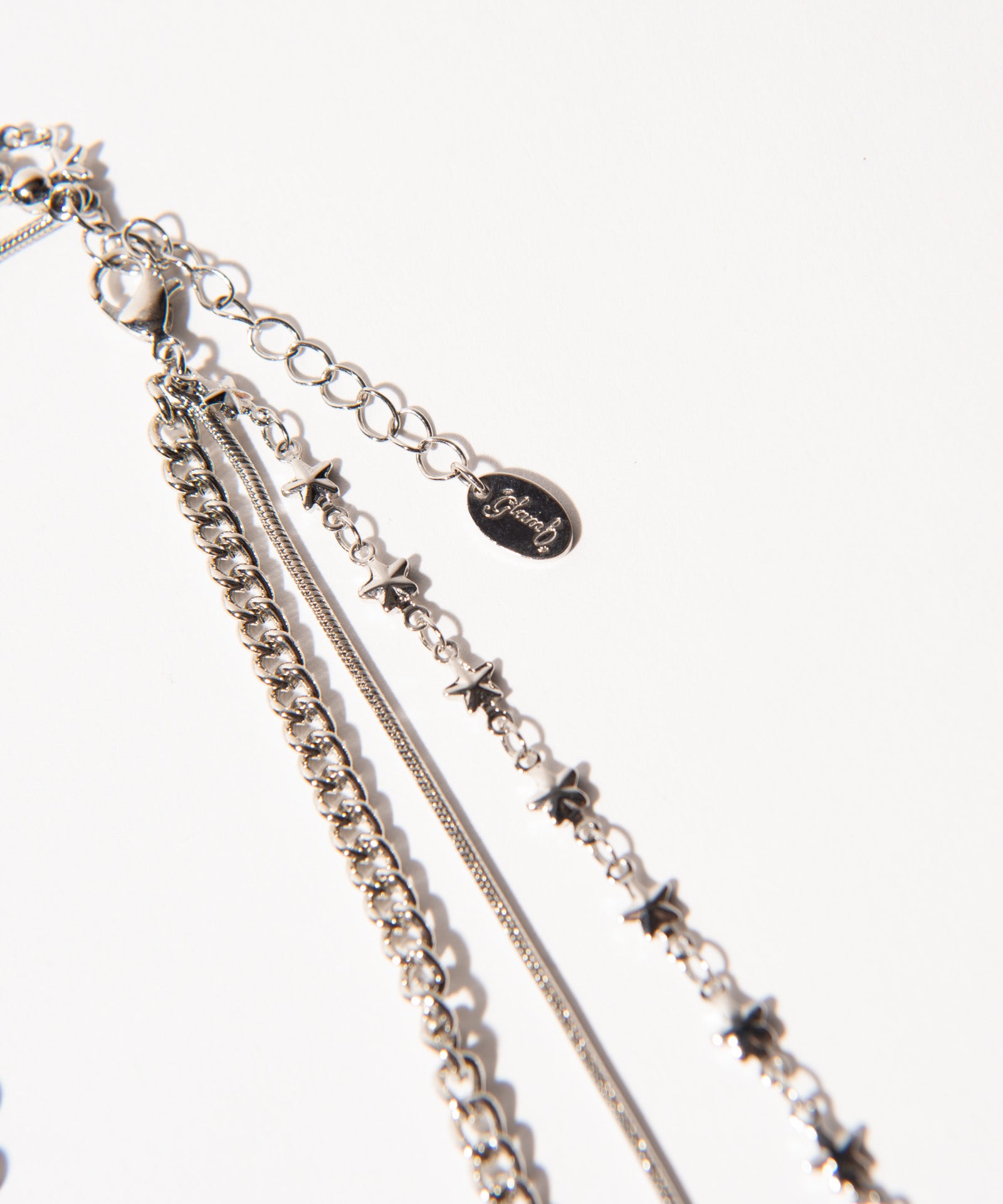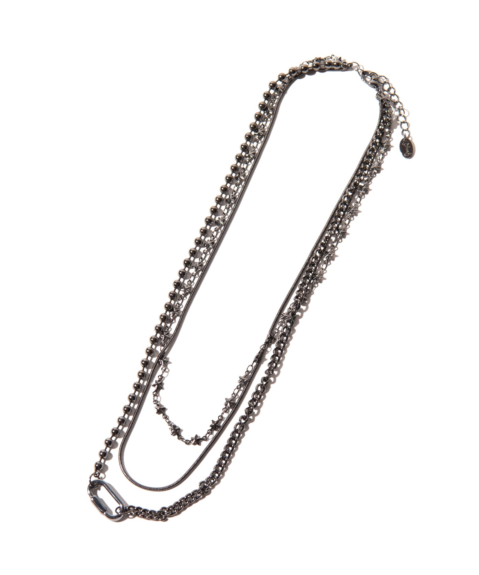 それぞれデザインの異なる3種のネックレスを連ねたTriple Layer Necklace。スターモチーフを繋いだチェーンはフロントのスクリューカラビナがアクセント。さらにボールチェーンとスネークチェーンをセットにしており、重ね付けすれば無骨さと繊細さが同居するエッジィなムードを演出します。