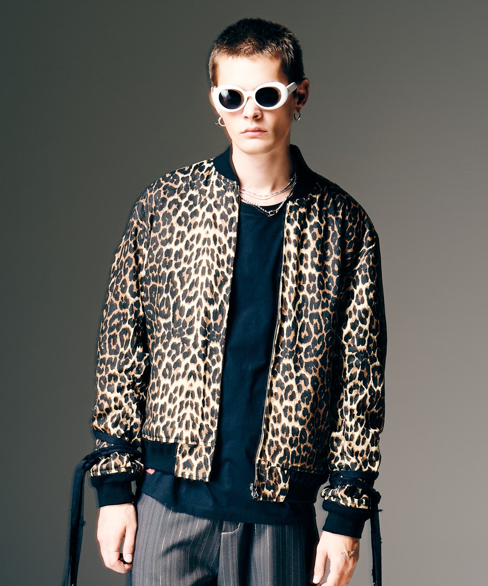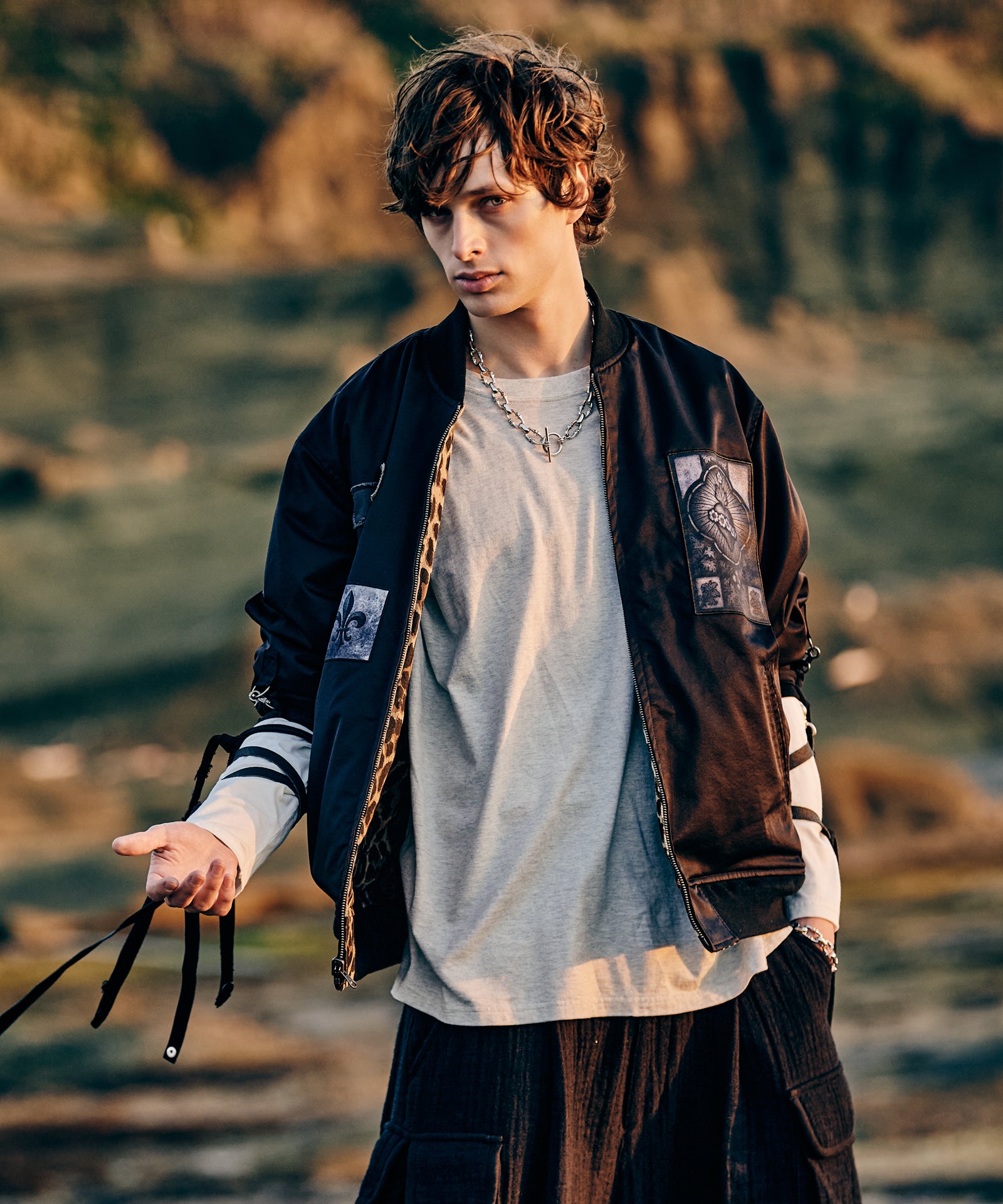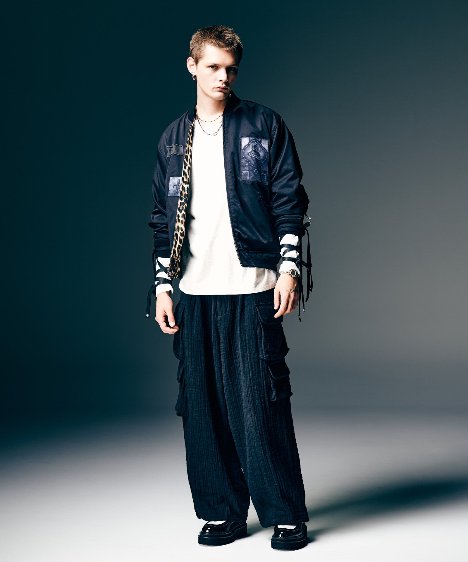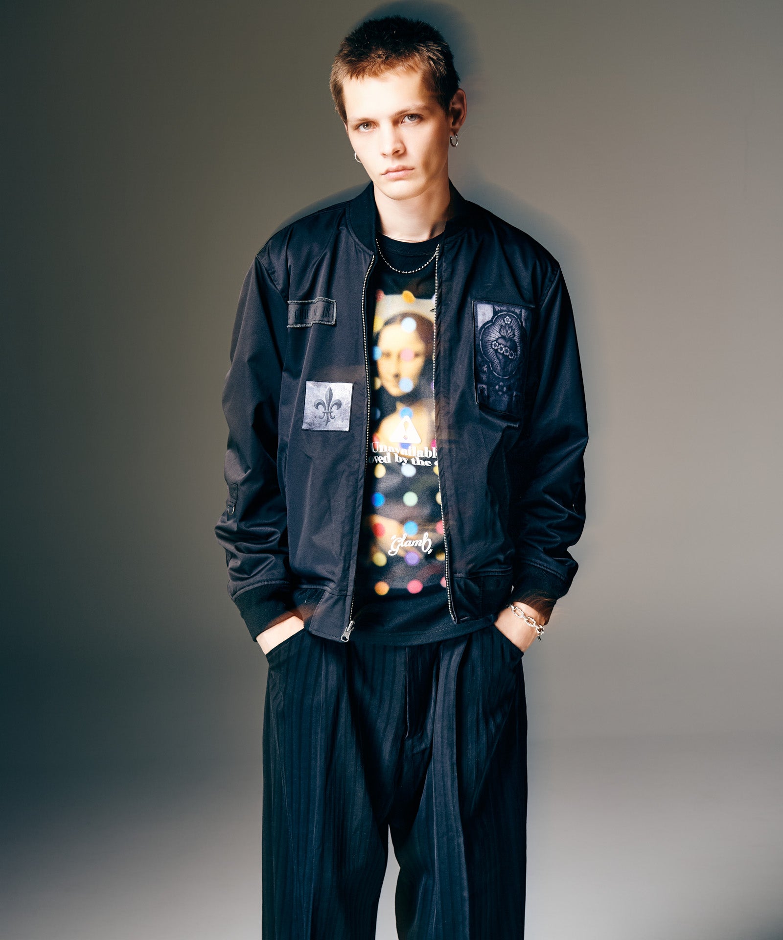 “Shadow of the Wind”をコレクションテーマに掲げた今季のglambのリリカルな世界観をミリタリーウェアに掛け合わせたBlow Reversible Bomber Jacket。ワイドシルエットのボディは宗教画や紋章の当て布を身頃の前後にパッチ。柄の中には音楽にまつわるモチーフをさりげなく隠し込んだglambらしいグラフィックワークが発揮されています。そこにあしらわれた今季のシーズンディテールが左右の袖口のDカンに繋がれるロングテープ。袖口に巻き付けたボンデージ的なアレンジもブランドからの提案です。逆面にはカラーバリエーションごとに異なるテキスタイルを使用。総柄使いのLeopardとCamoに加え、立体的なフリンジがランダムに覗くBlackもラインナップします。ボディはリバーシブルとなっており、袖口のDカンも両面に用意。ボディの2WAYとロングテープのアレンジを掛け合わせ、幅広いスタイリングを形作ることのできる1着となっております。