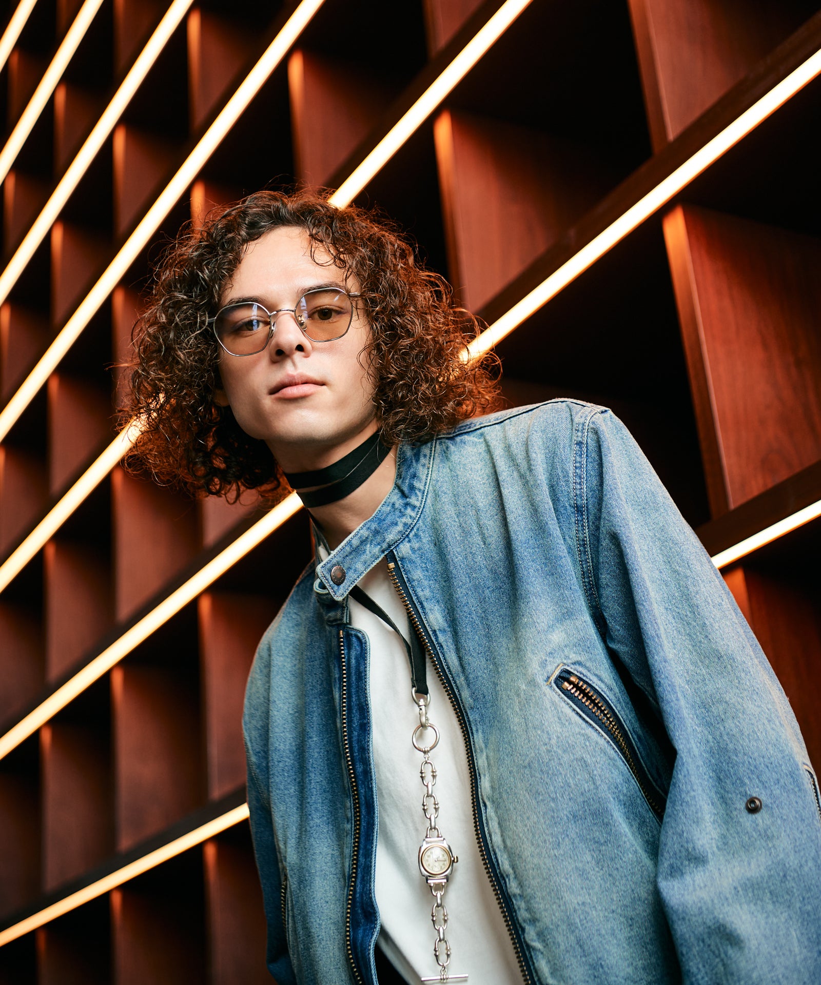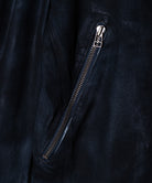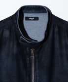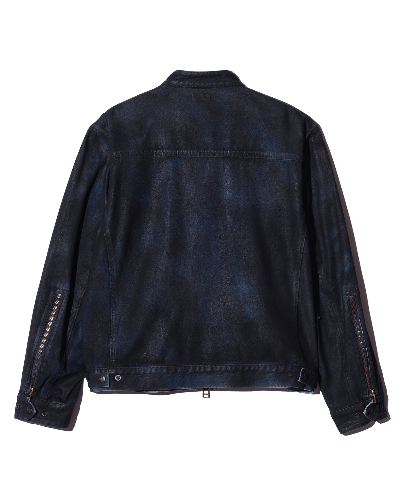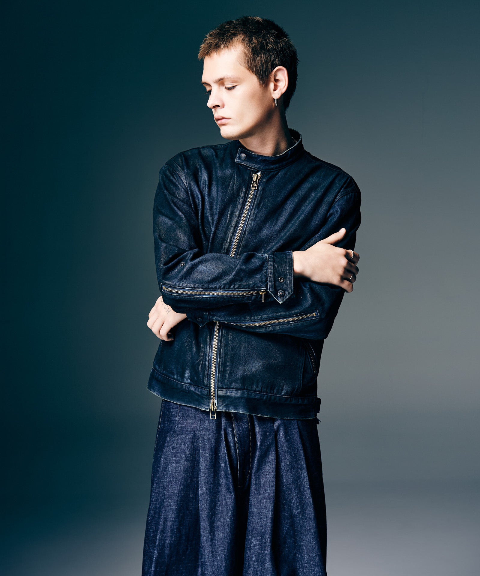コンパクトなシルエットの中にライダースとデニムというglambの美学を詰め込んだDenim Riders Jacket。ショートレングスにまとめられたレギュラーシルエットのボディはシングルタイプのバイカー仕様。大ぶりなサイドポケットとフロント、袖口のジップはアンティーク調コッパーカラーのパーツであしらってアクセントにしています。テキスタイルに用いたのは中厚手の10オンスデニム。カラーバリエーションごとに異なる加工も本作の魅力となり、職人が手作業で削りを入れてエイジングしたIndigoに加え、そこにパラフィン加工を施して地の色を残しながらダークにフィニッシュしたBlackの2種をラインナップします。