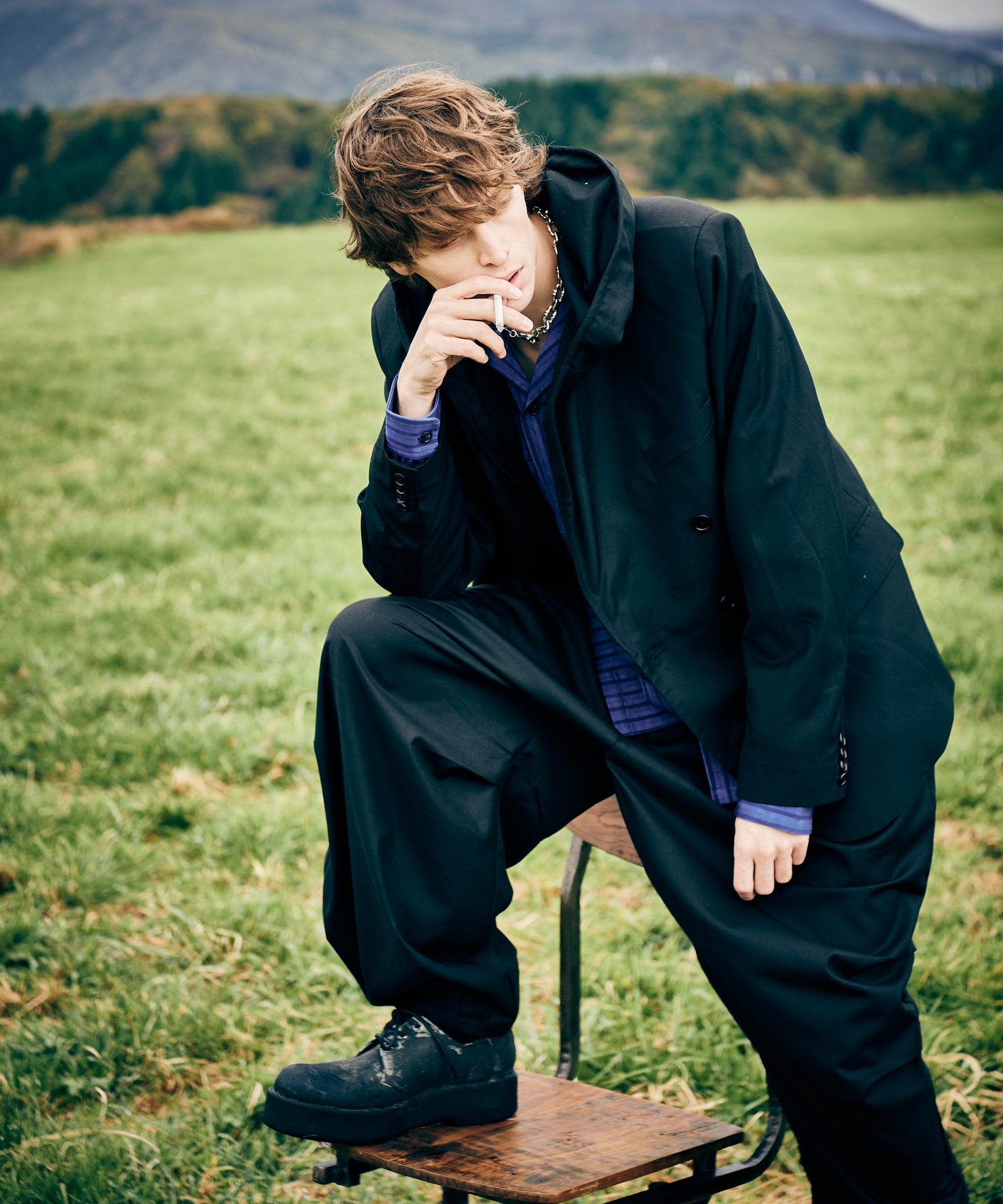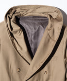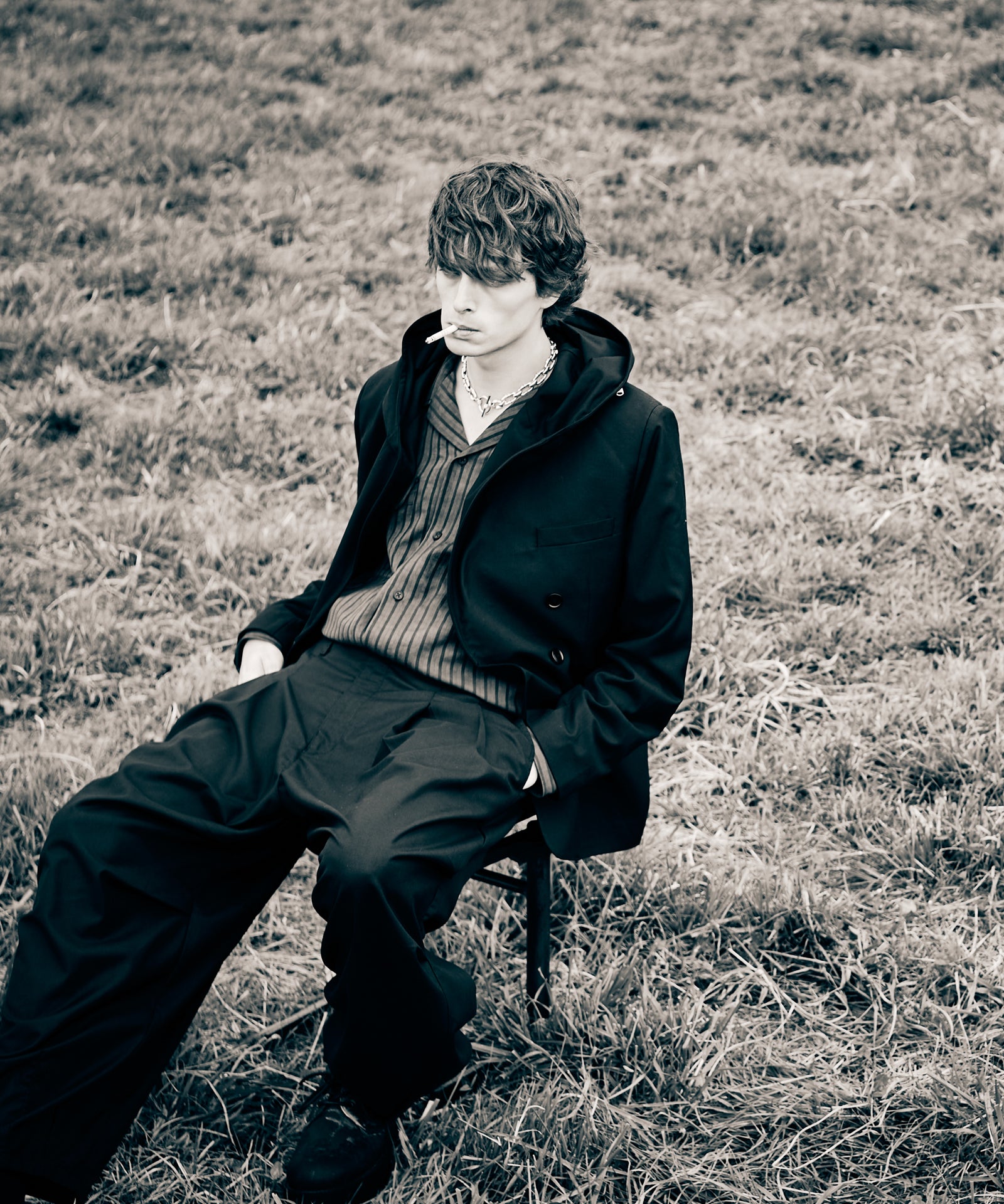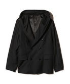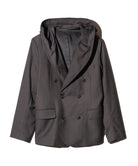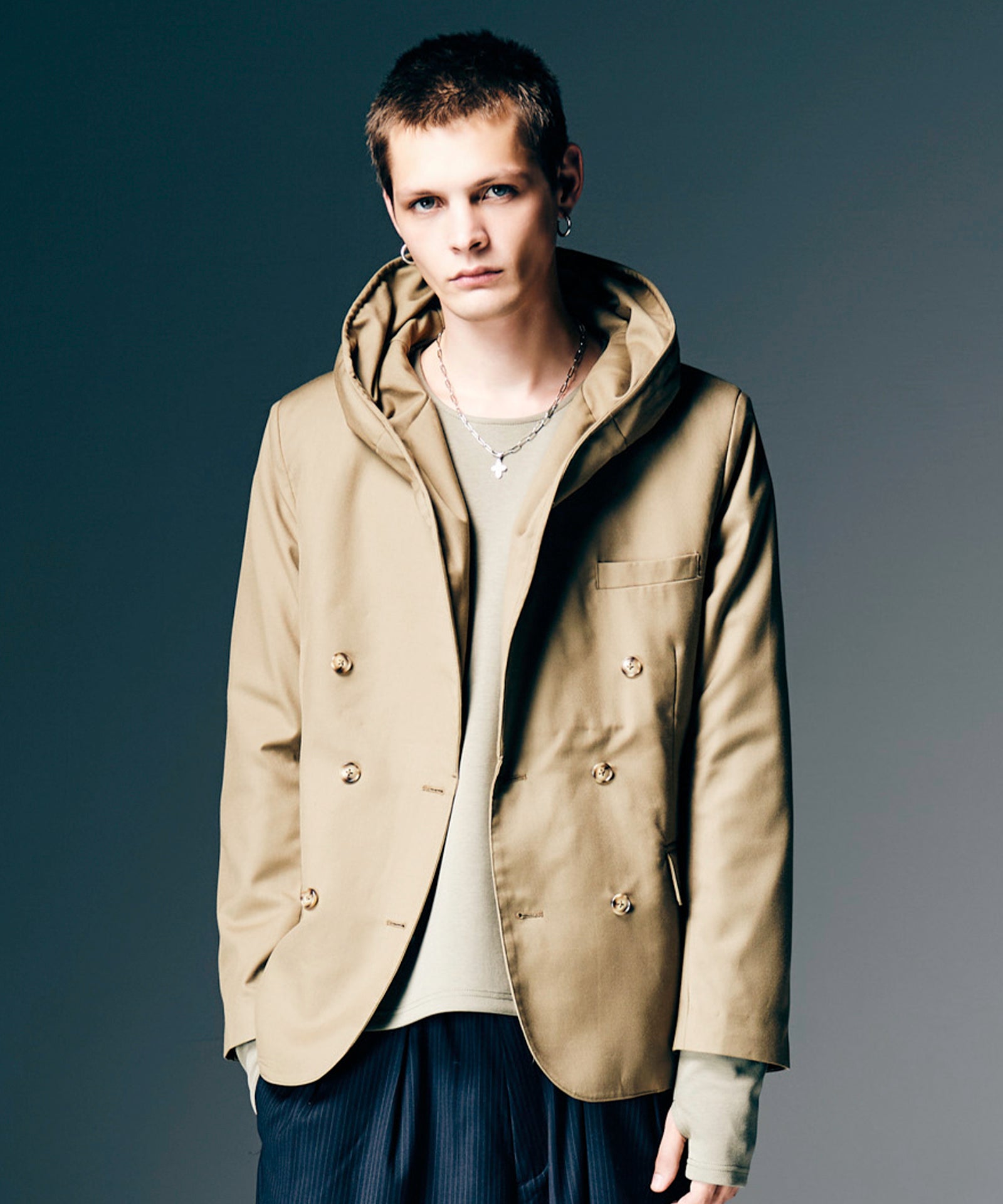 ダブルブレストジャケットに構築的なドレープワークを掛け合わせ、ドレスとストリートを融合したCarol Tailored Jacket。胸元から首回りを立体的に取り囲む襟のデザインはglambの定番ディテールである"Carol"。ボリュームある首元は裏側のジップを開けることでフードに変化、ヴィジュアル的な主張だけでなく機能性を併せ持つディテールとなっています。首元のシルエットを生かすようテキスタイルにはレーヨン混の落ち感あるスーツ生地を使用。ボディは肩パッドや増し芯といった正統なテーラーリングを施しつつ、フードやラペルの縁にはワイヤーを配して独創的な造形をアシストします。