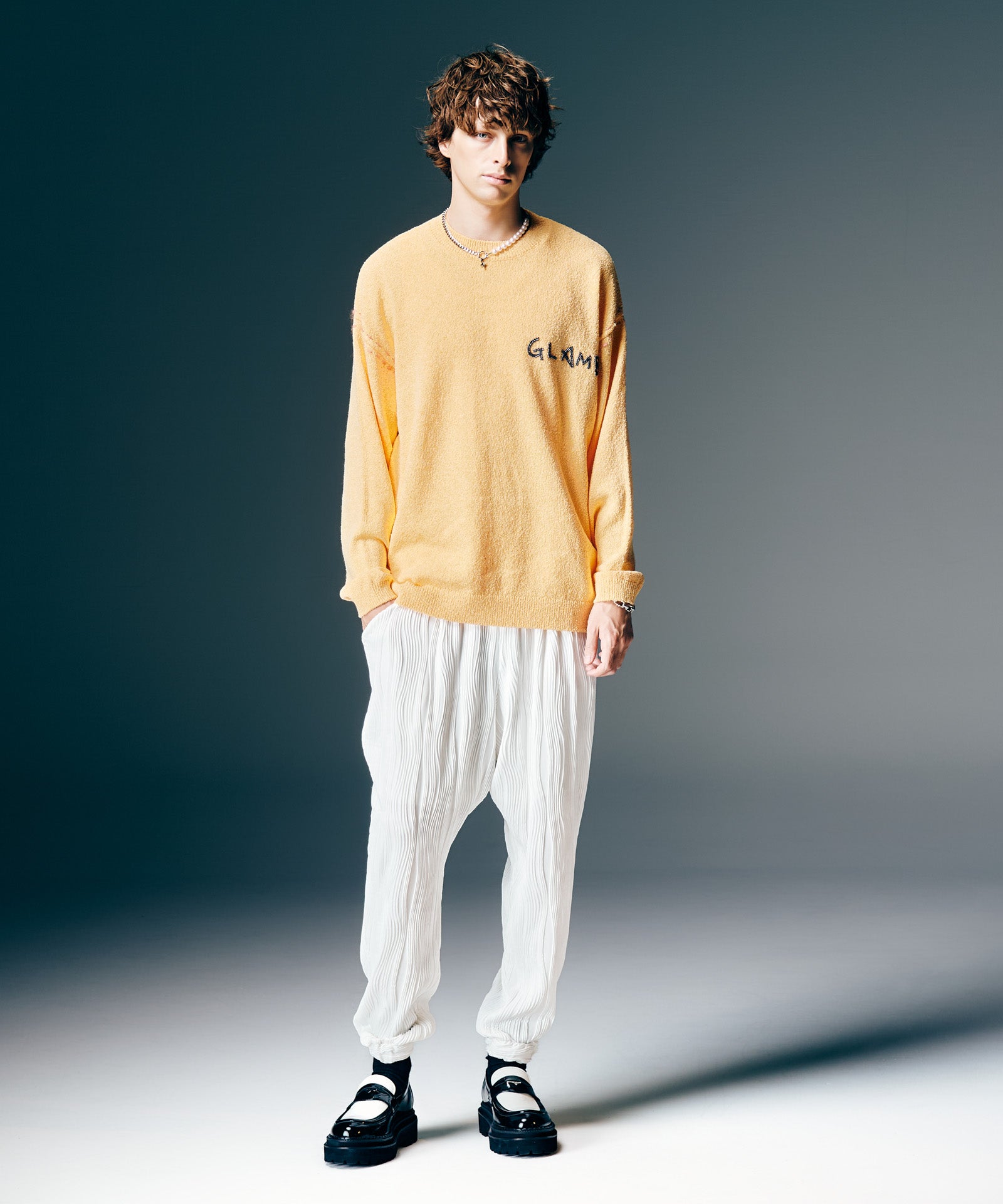 シンプルなプルオーバーニットにクラフトマンシップが息づくHand Beaded Logo Knit。着丈を短めに設けたビッグシルエットのボディは、空気を含みふっくらとした質感のブークレ糸を天竺編みした優しい肌触りが特徴。その胸元に落書き調の輪郭でブランドロゴをビーズ刺繍しました。アームホールは甘い撚りにより温かみある風合いを持つローピング糸でハンドステッチ。バックスタイルでもタグをかたどるように同様のステッチを施し、敢えて糸を垂らすことでグランジのニュアンスを添えました。