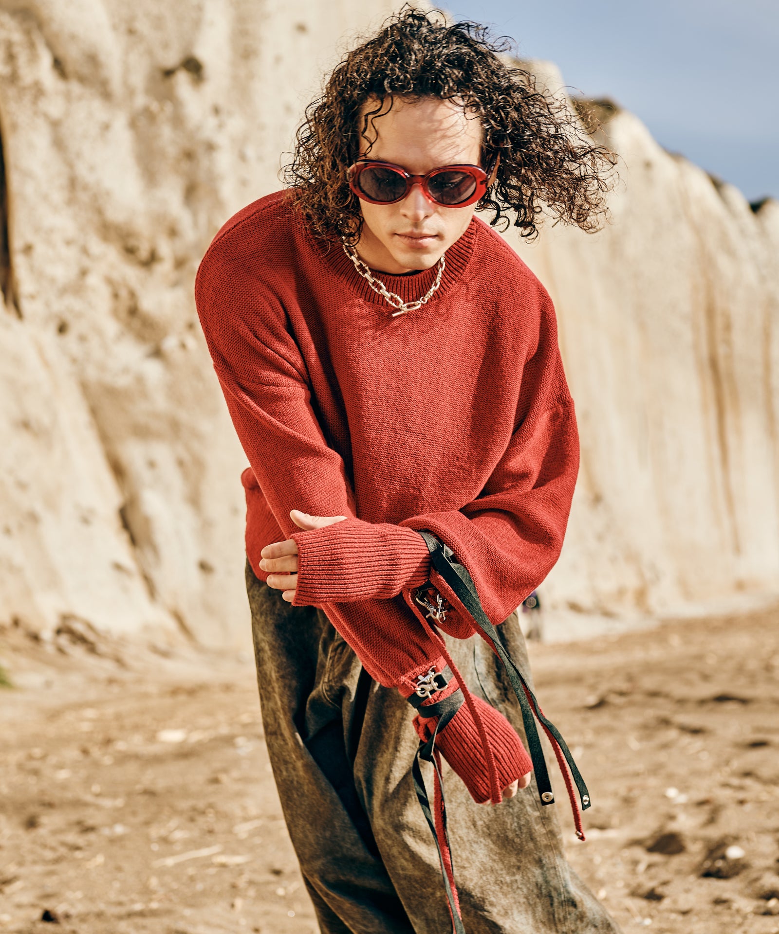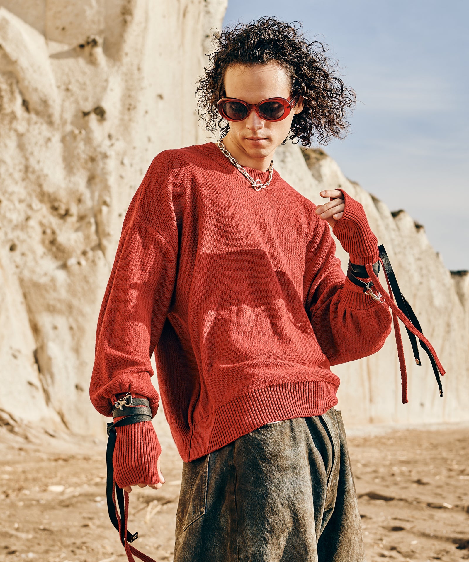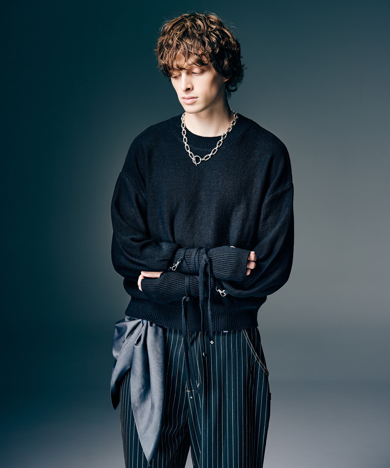 緩急あるシルエットメイキングでプルオーバーニットを再構築したCreed Knitが今季ならではの意匠を備えて登場。ミドルゲージの天竺裏目使いで仕立てたボディは従来よりもショート丈としたボックスシルエット。ロングリブで緩急ある輪郭にまとめたアームは袖口にサムホールを、さらに新たなギミックとしてニットテープを配しました。こちらはそのまま垂らしたり、リブに巻いてロックスタイルにしたりとアレンジが可能。今季のアクセサリーラインで用意されるストラップシリーズ(*)のさらなる重ね付けもブランドからの提案です。 *GB0126/AC04 : Leather Tape Strap、GB0126/AC05 : Charm Chain Strap、GB0126/AC06 : Beads Chain Strap