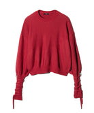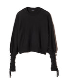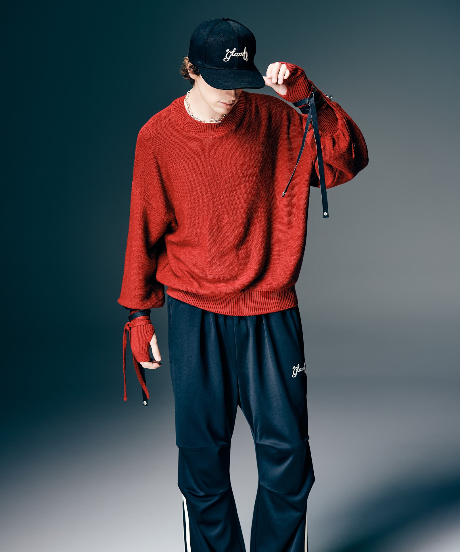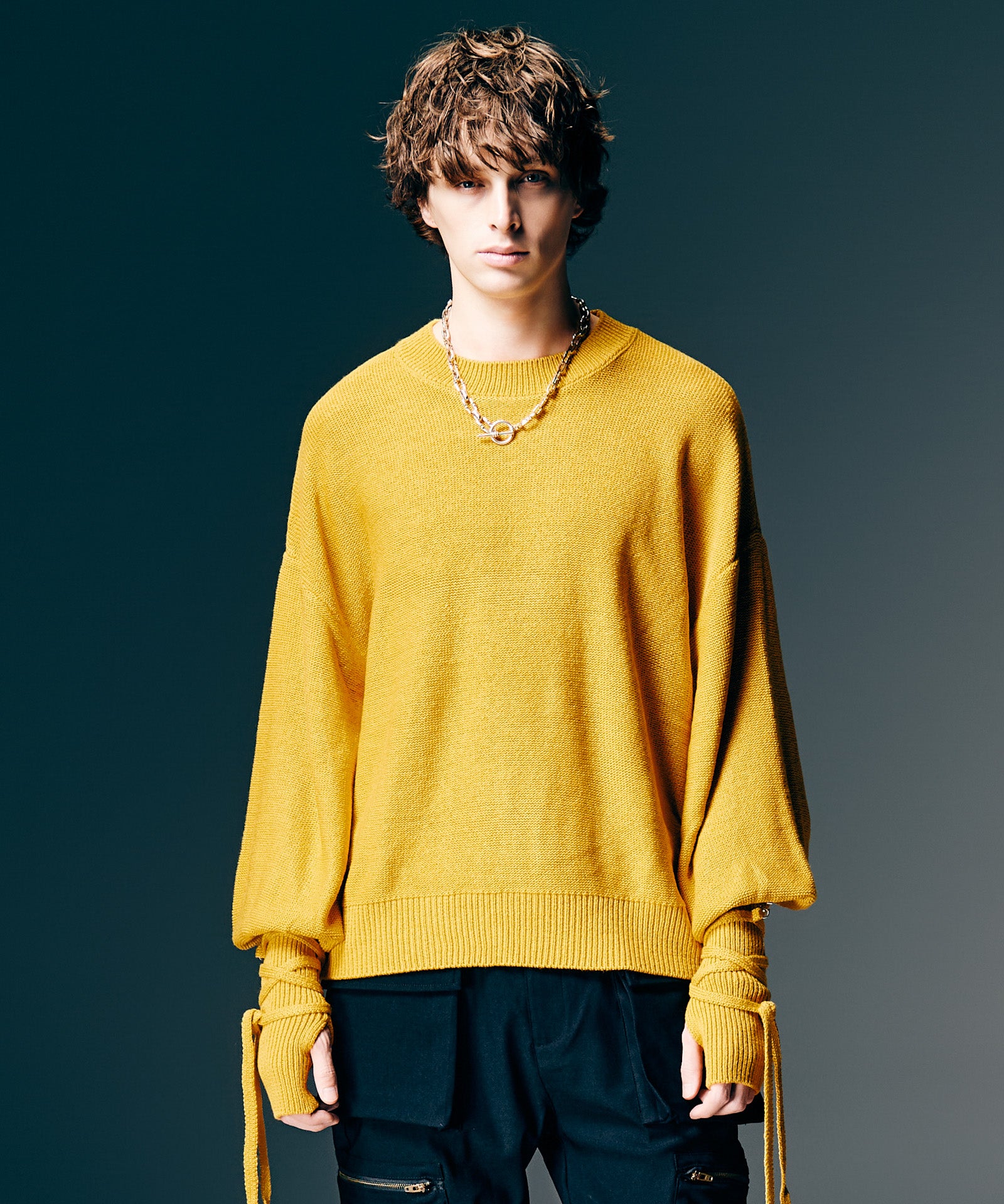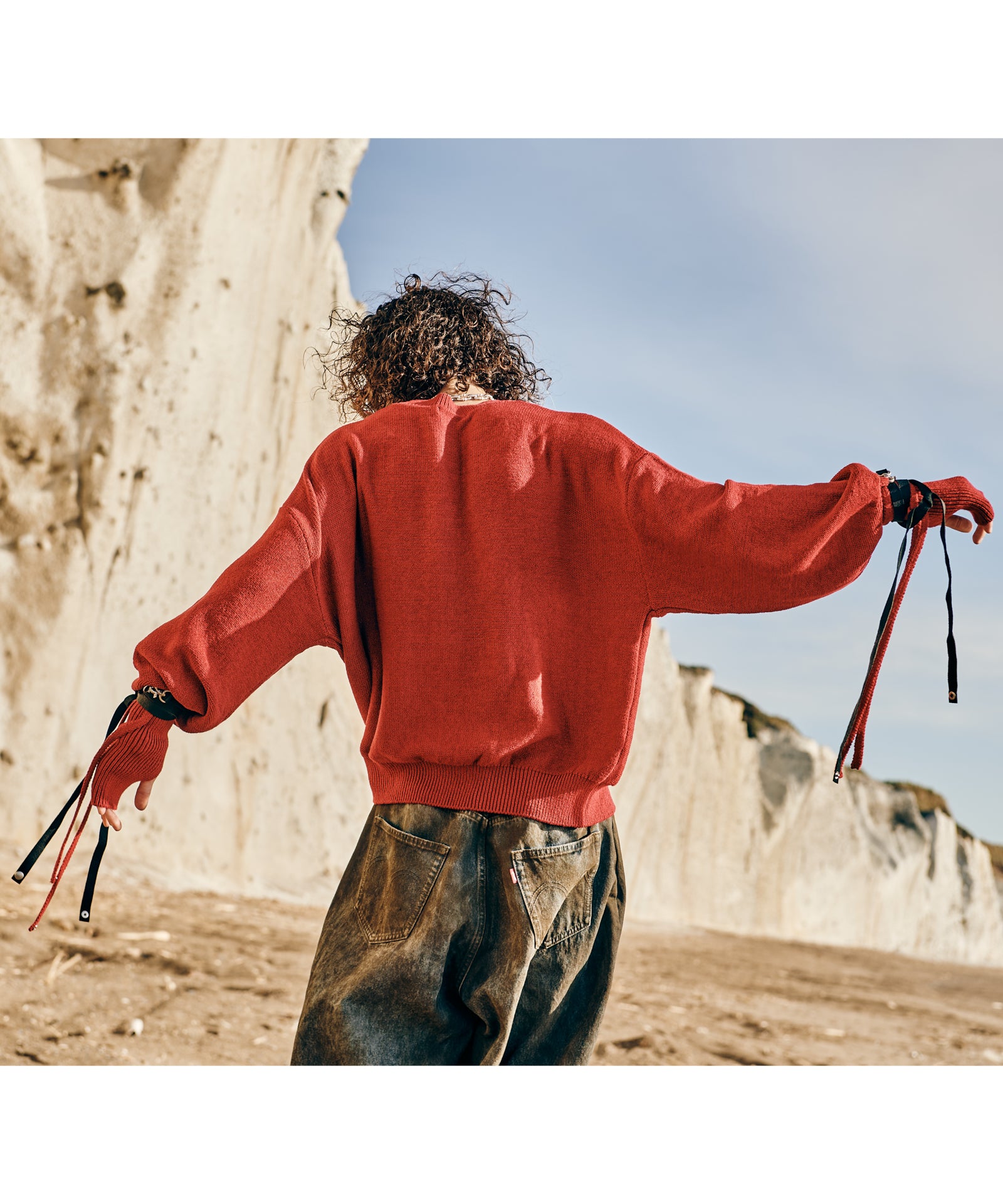 緩急あるシルエットメイキングでプルオーバーニットを再構築したCreed Knitが今季ならではの意匠を備えて登場。ミドルゲージの天竺裏目使いで仕立てたボディは従来よりもショート丈としたボックスシルエット。ロングリブで緩急ある輪郭にまとめたアームは袖口にサムホールを、さらに新たなギミックとしてニットテープを配しました。こちらはそのまま垂らしたり、リブに巻いてロックスタイルにしたりとアレンジが可能。今季のアクセサリーラインで用意されるストラップシリーズ(*)のさらなる重ね付けもブランドからの提案です。 *GB0126/AC04 : Leather Tape Strap、GB0126/AC05 : Charm Chain Strap、GB0126/AC06 : Beads Chain Strap