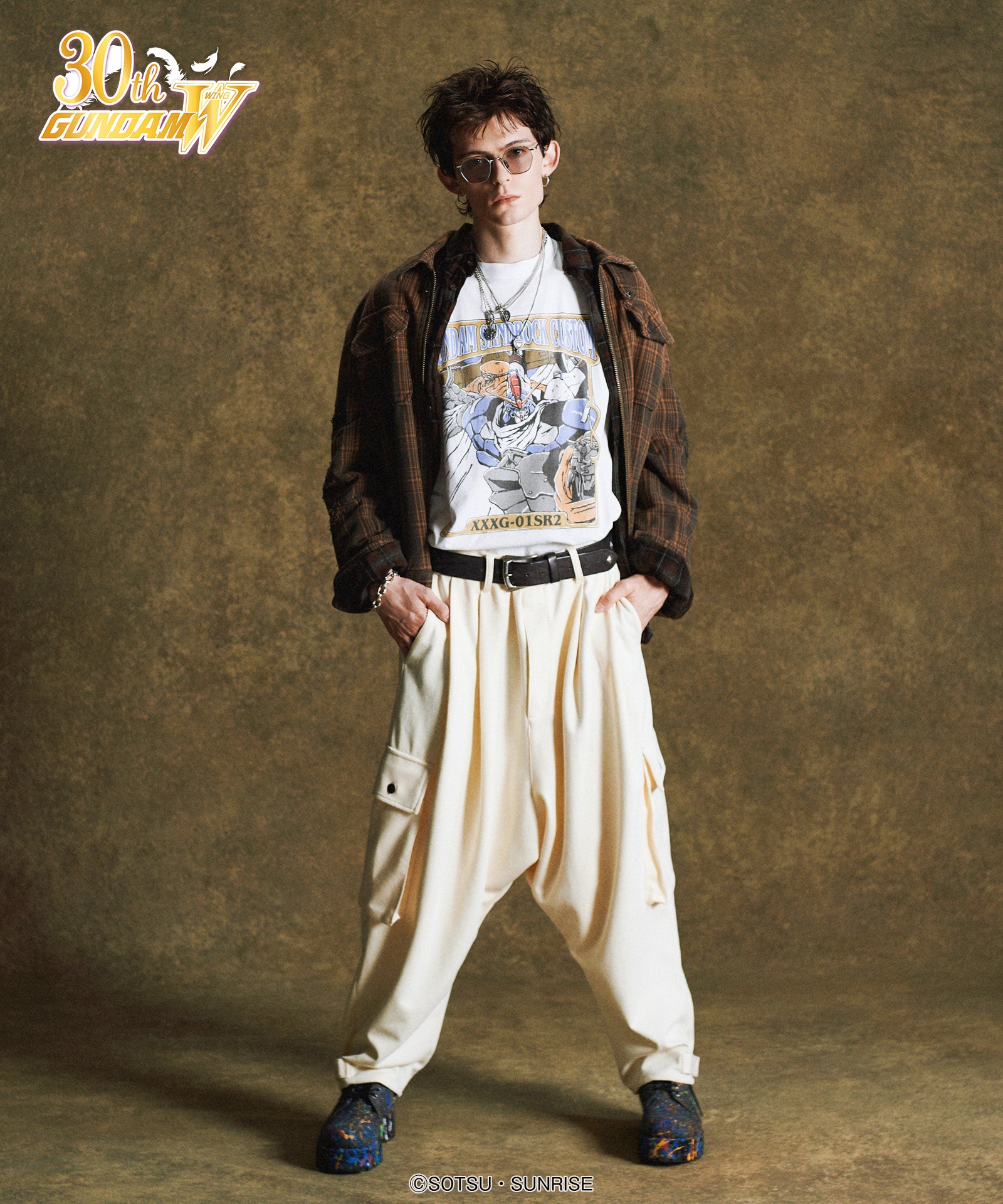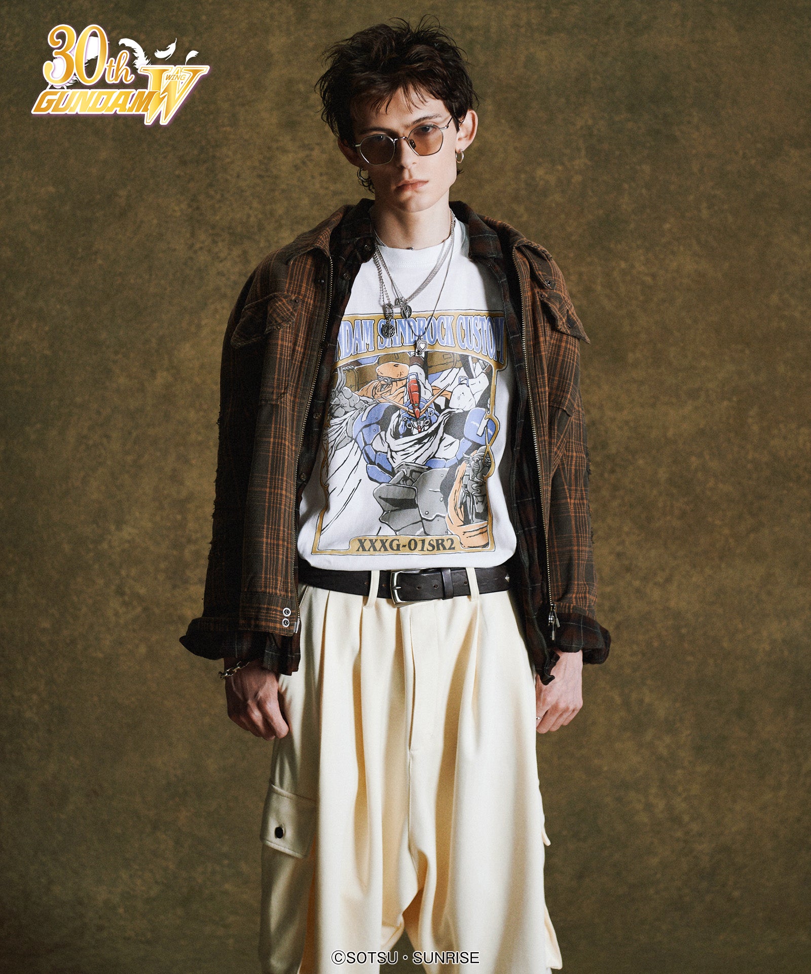 作品のラストシーンに見られる、マントを纏ったガンダムサンドロック改をヴィンテージスーベニアTを思わせるグラフィックでプリント。カトルの出身コロニーにちなんだ、エキゾチックなムードを乗せて描写しました。