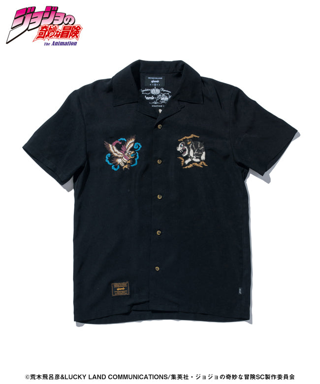 物語の終盤、イギーとペット・ショップで繰り広げられた名勝負。その迫力を落ち感あるポリエステルの開襟シャツに落とし込みました。レトロなタッチの刺繍はスカジャンをデザインソースとしたもの。そこによく見られる虎や龍の如く、前面に本体の2匹を、背面にスタンドバトルを描いています。ストリートで愛されてきた柄を継承したこちらは、単体で着用しても街に馴染む仕上がり。男らしいムードを湛え、見る者を惹き付けます。
