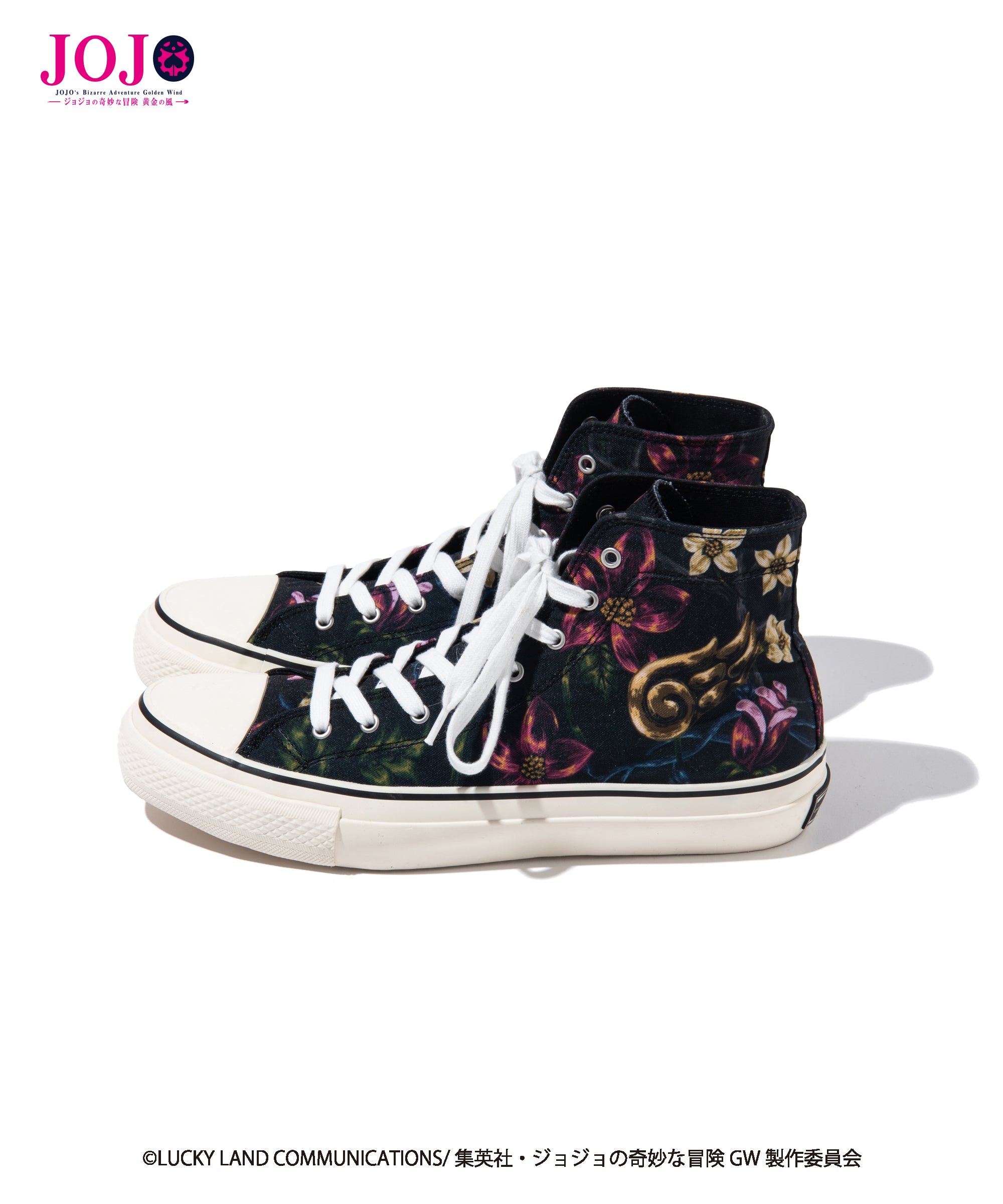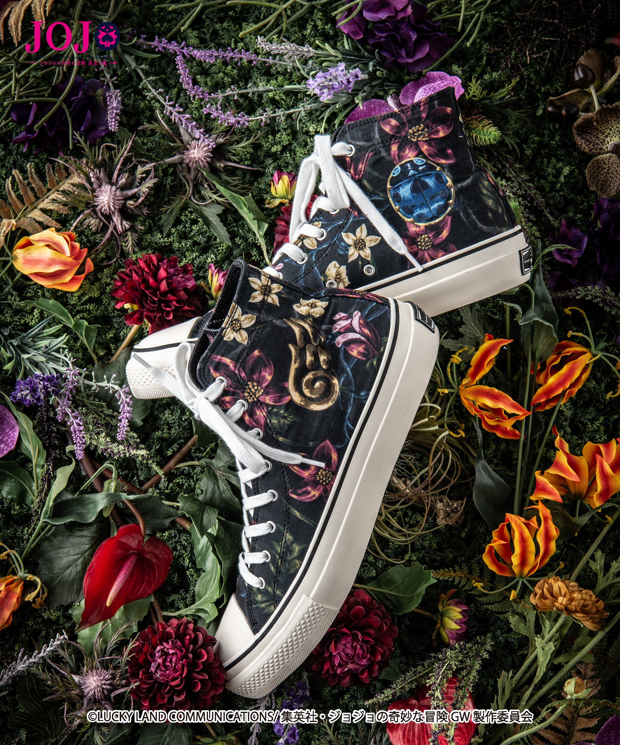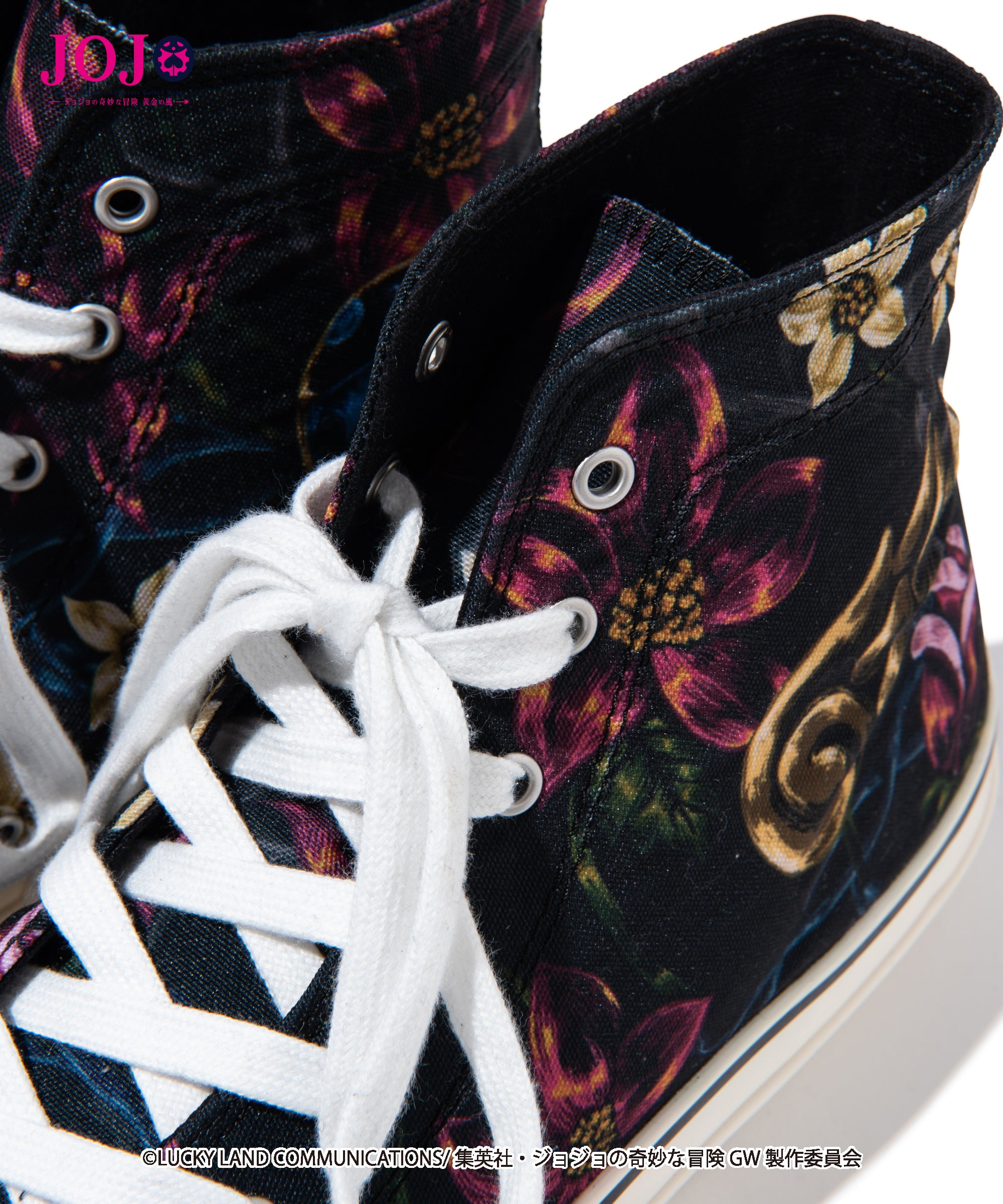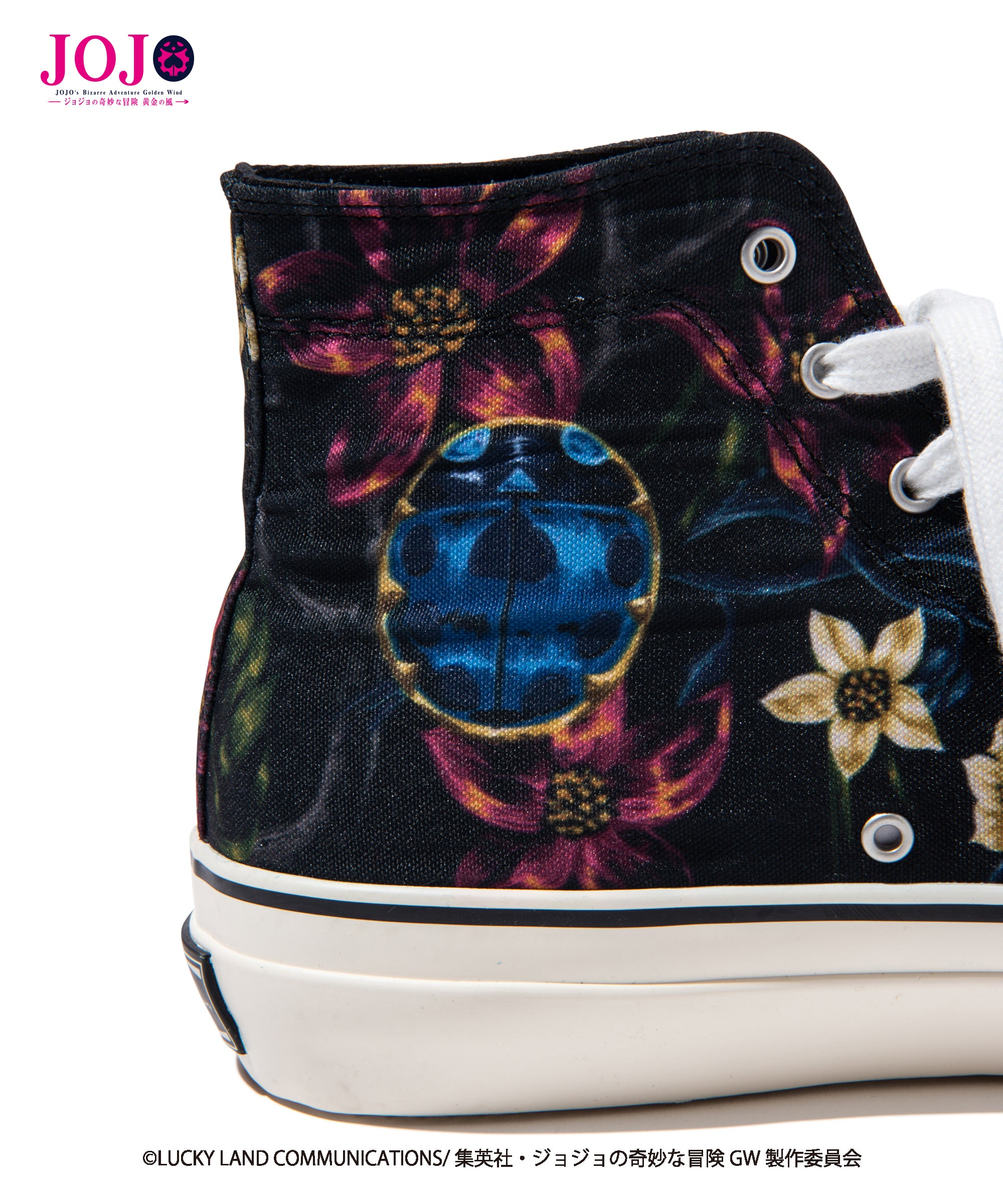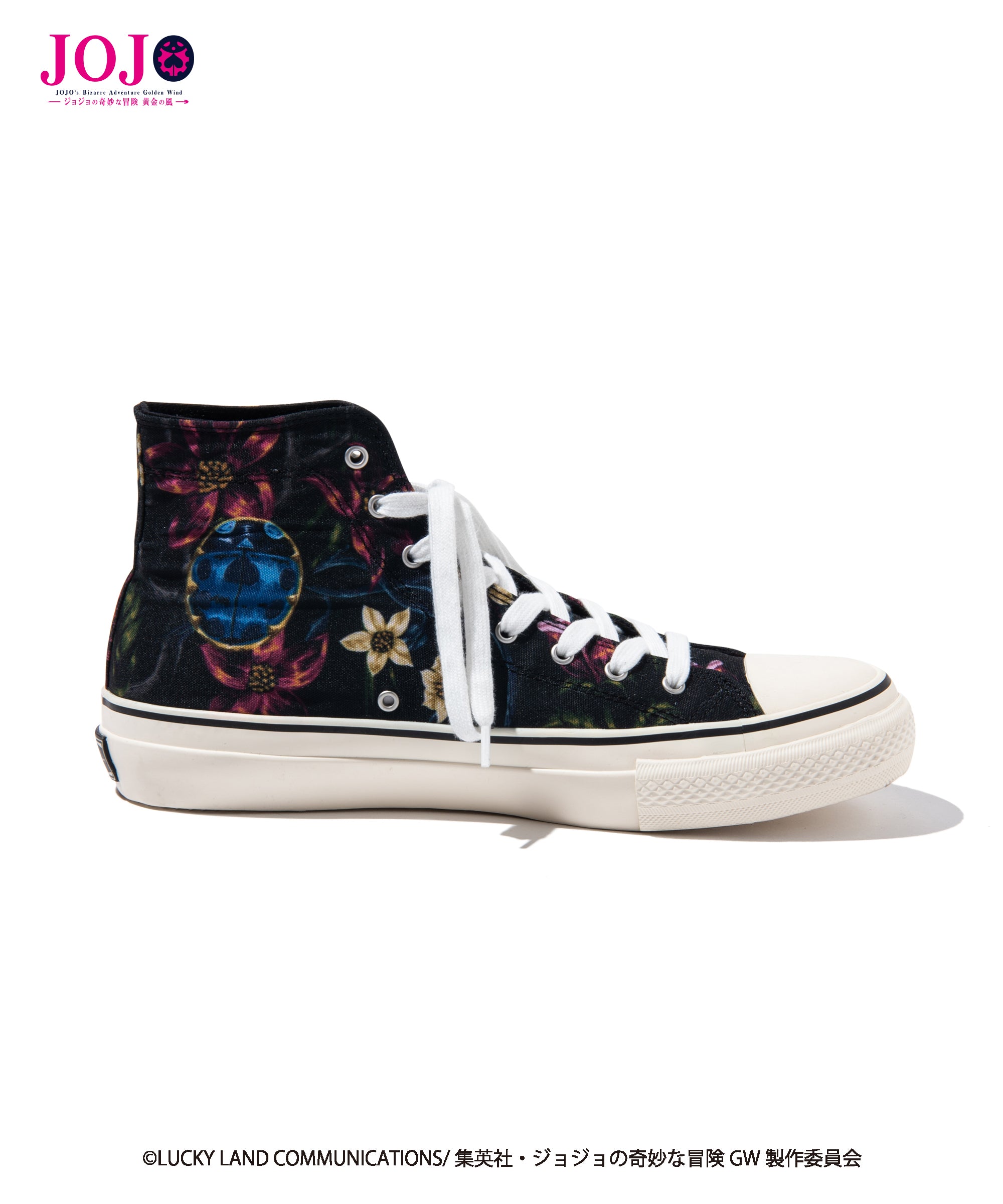8アイレットのオーセンティックなハイカットスニーカーを彩るのは、ジョルノ・ジョバァーナとスタンド「ゴールド・エクスペリエンス」のモチーフ。ブラックのボディにアールヌーヴォーの草花模様とヴィンテージのアロハ模様を組み合わせたタッチでデザインし、優雅かつ屈強なキャラクター性を象徴しました。オリジナルラストを用いたシャープなフォルムは、ソールとの接着に往年のバルカナイズ製法を採用。職人の確かな技術により、長時間の使用でも疲れを感じさせない仕立てとなっています。