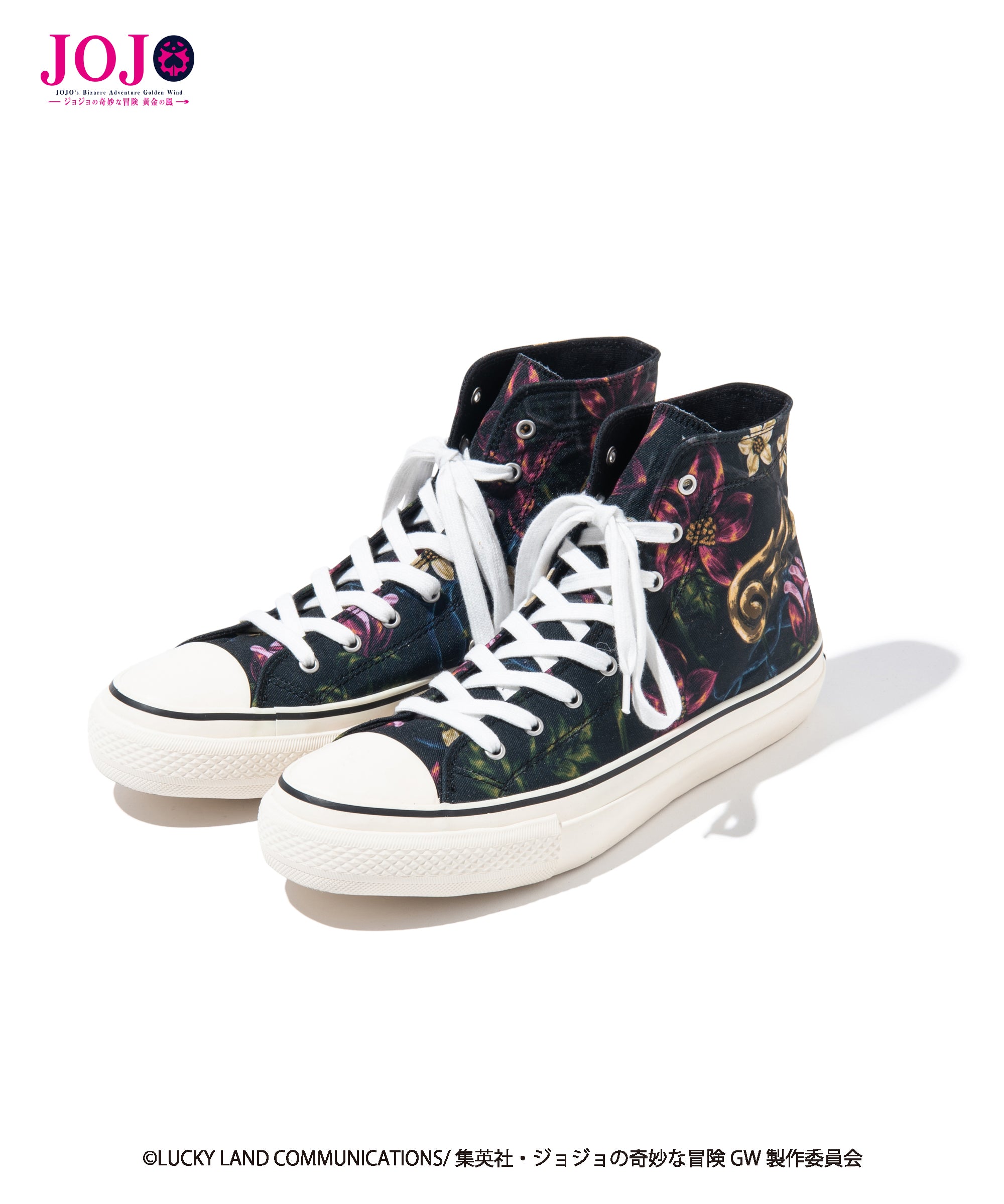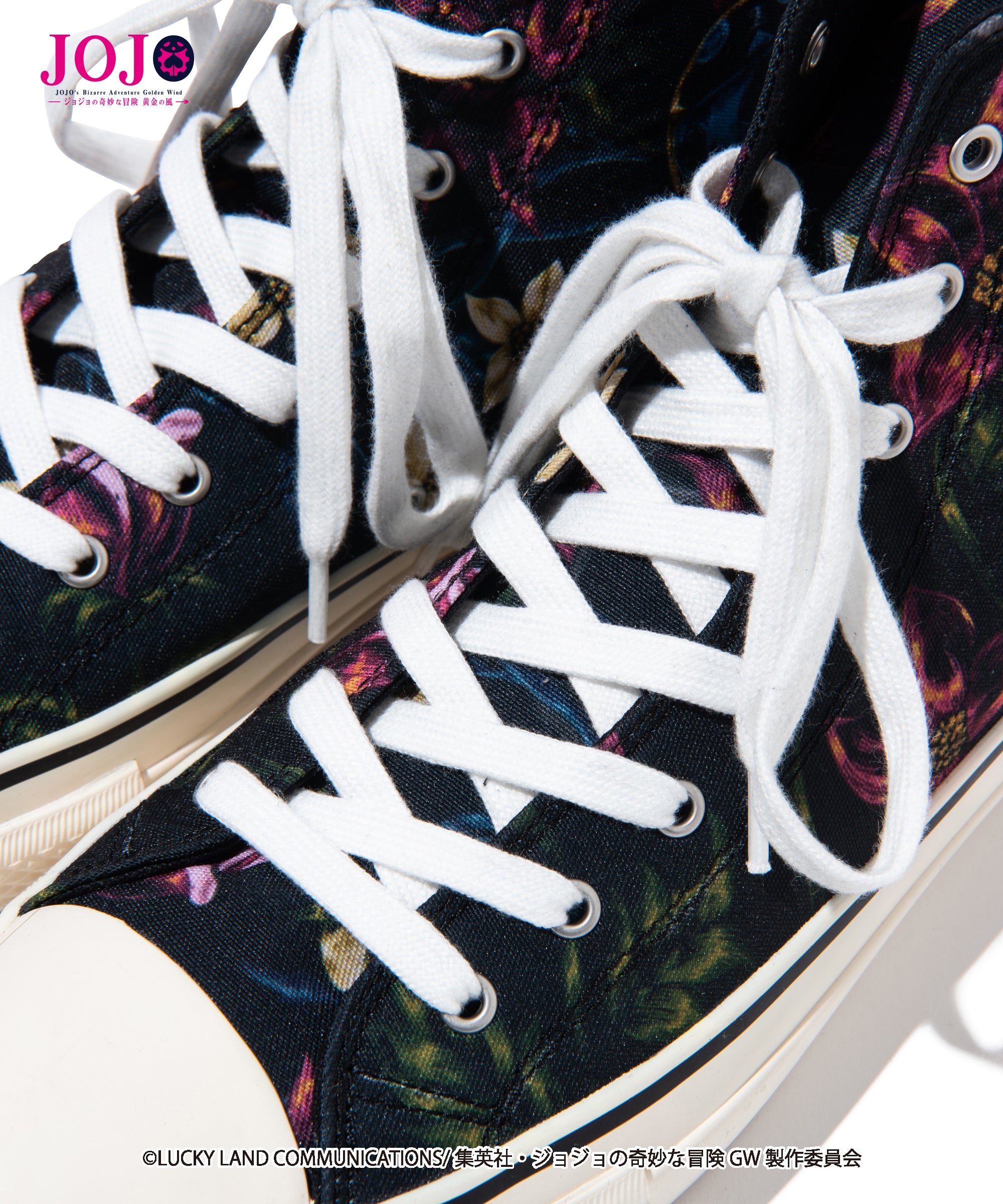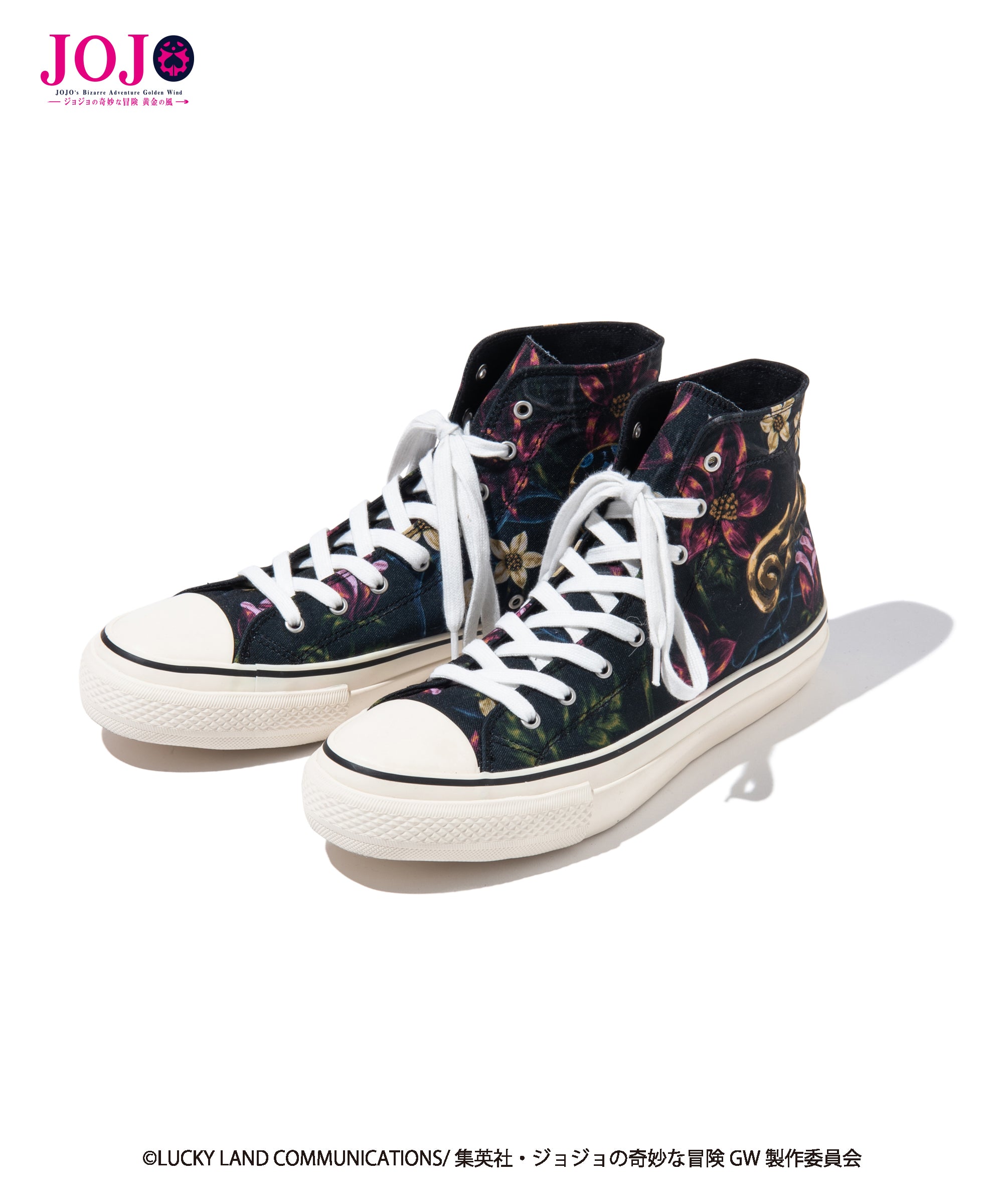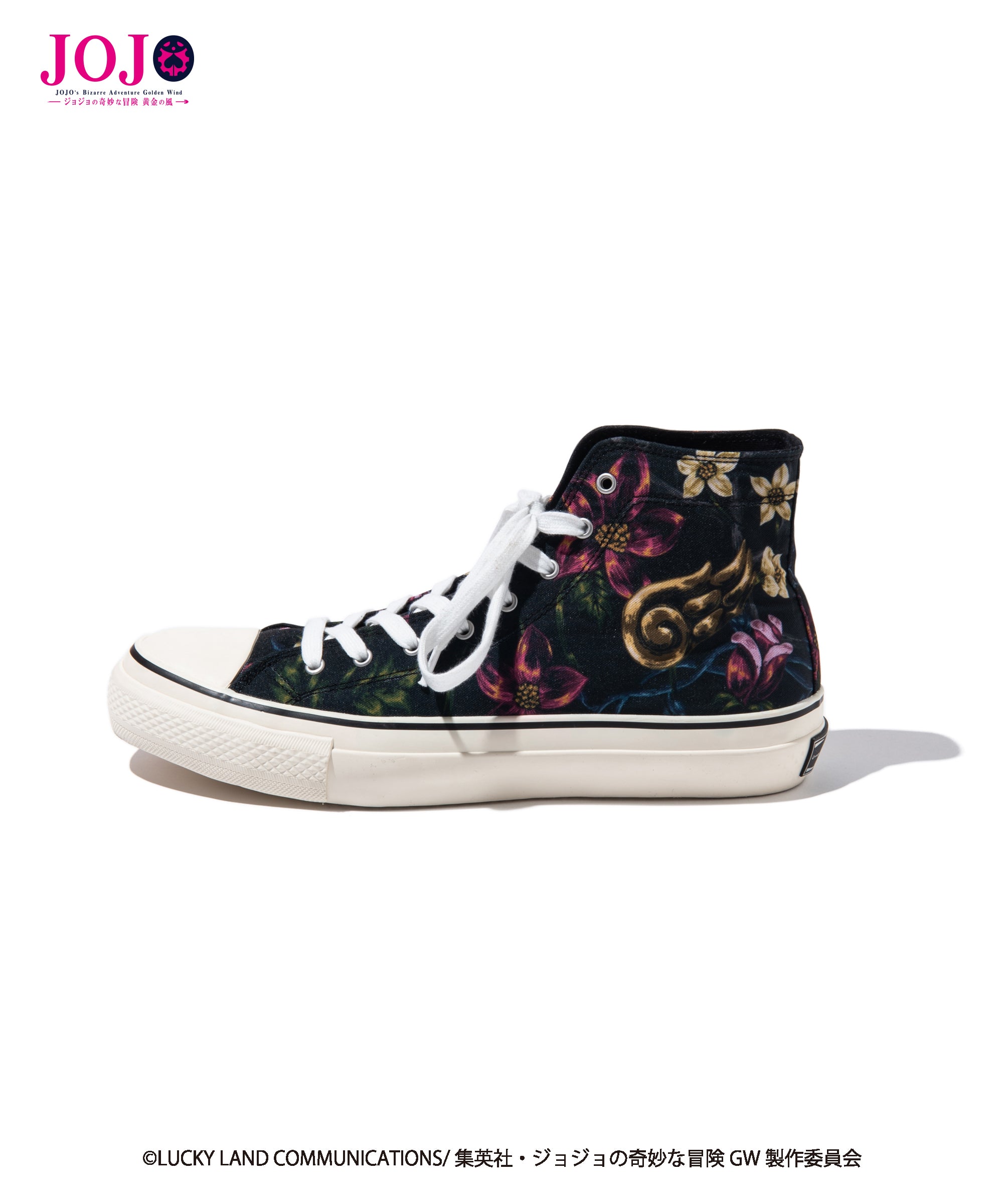 8アイレットのオーセンティックなハイカットスニーカーを彩るのは、ジョルノ・ジョバァーナとスタンド「ゴールド・エクスペリエンス」のモチーフ。ブラックのボディにアールヌーヴォーの草花模様とヴィンテージのアロハ模様を組み合わせたタッチでデザインし、優雅かつ屈強なキャラクター性を象徴しました。オリジナルラストを用いたシャープなフォルムは、ソールとの接着に往年のバルカナイズ製法を採用。職人の確かな技術により、長時間の使用でも疲れを感じさせない仕立てとなっています。