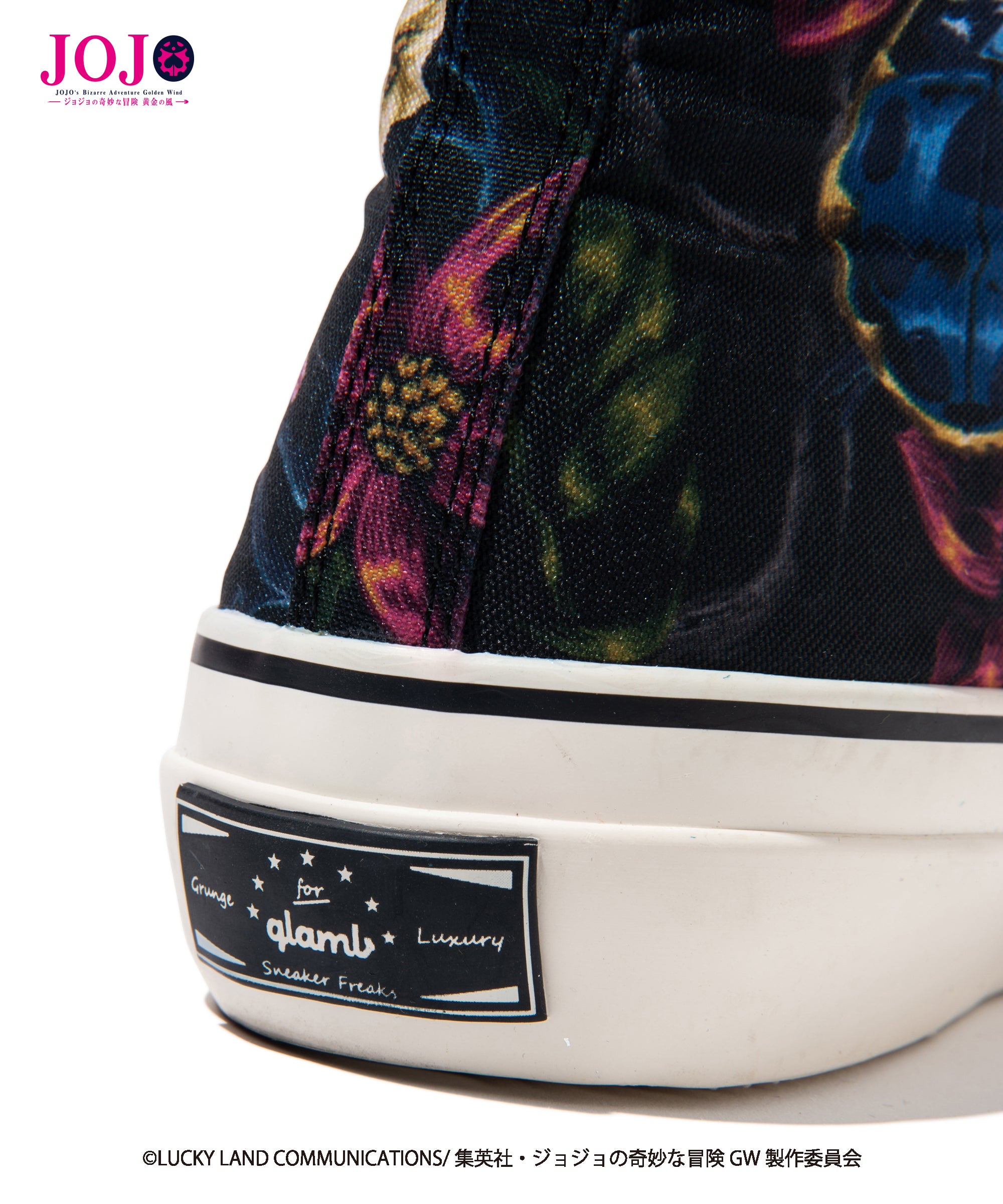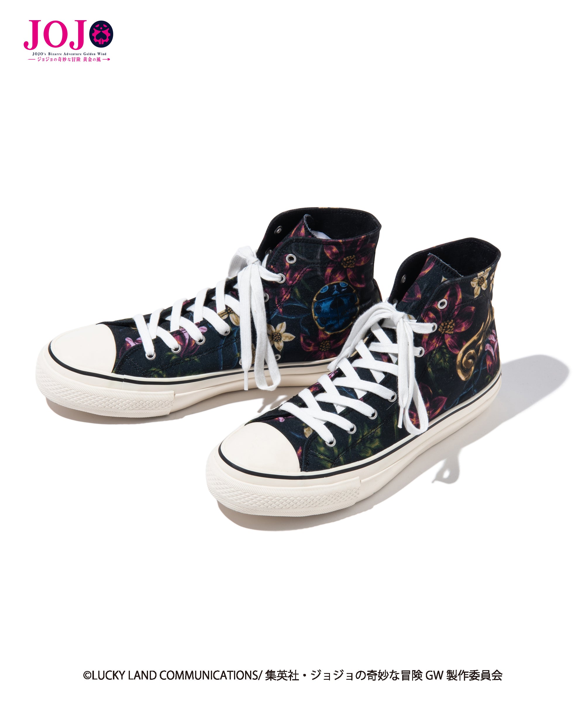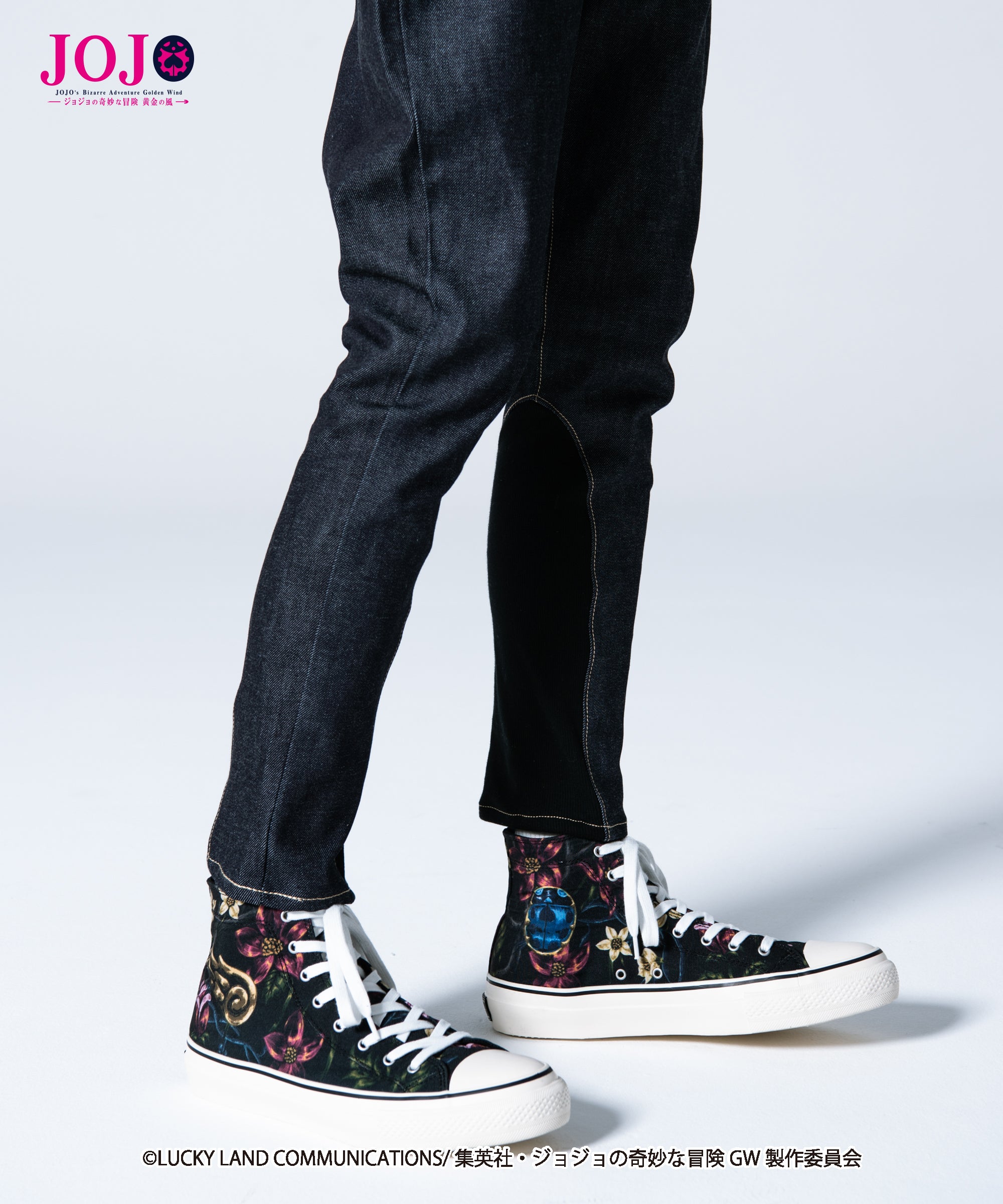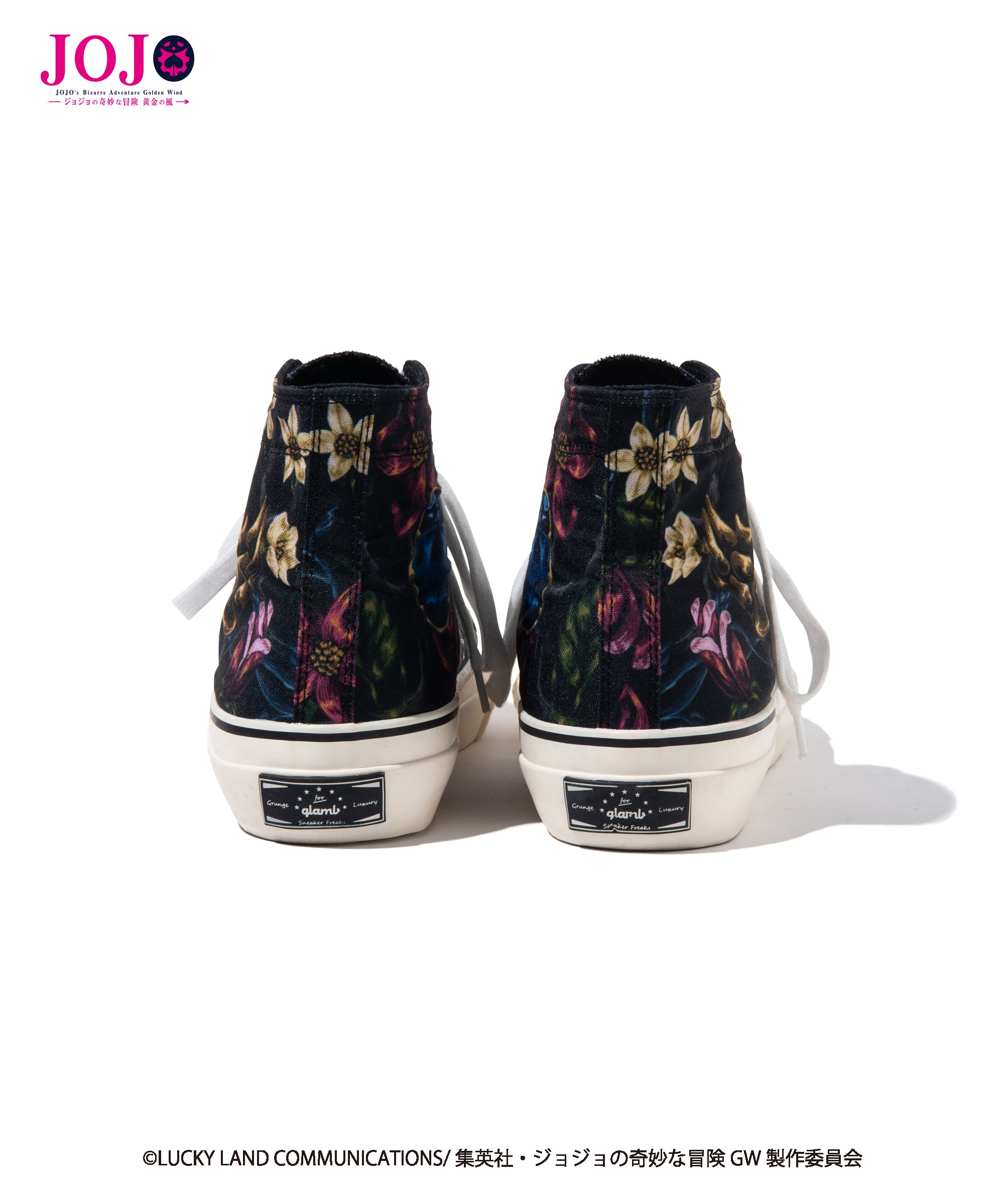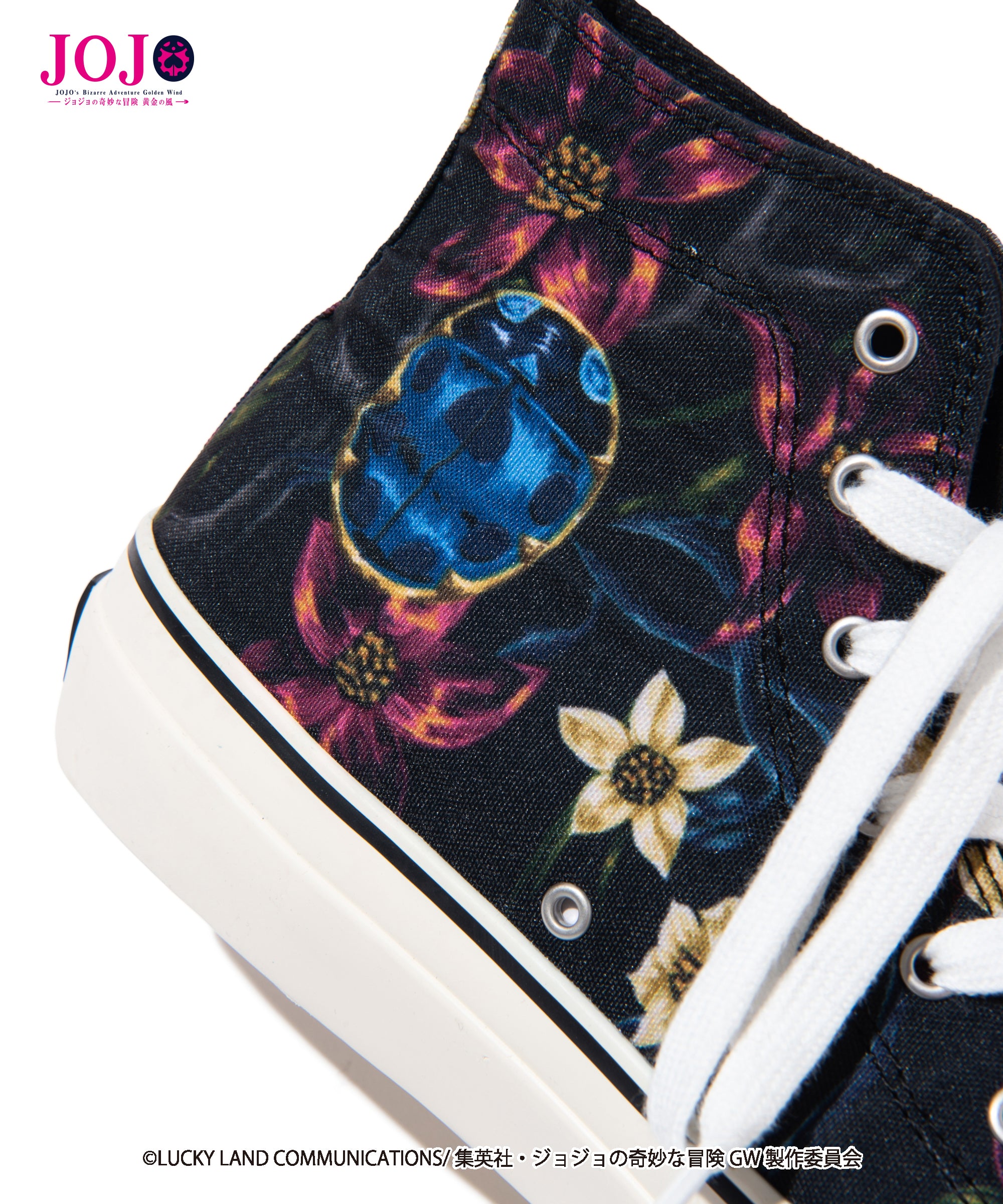 8アイレットのオーセンティックなハイカットスニーカーを彩るのは、ジョルノ・ジョバァーナとスタンド「ゴールド・エクスペリエンス」のモチーフ。ブラックのボディにアールヌーヴォーの草花模様とヴィンテージのアロハ模様を組み合わせたタッチでデザインし、優雅かつ屈強なキャラクター性を象徴しました。オリジナルラストを用いたシャープなフォルムは、ソールとの接着に往年のバルカナイズ製法を採用。職人の確かな技術により、長時間の使用でも疲れを感じさせない仕立てとなっています。
