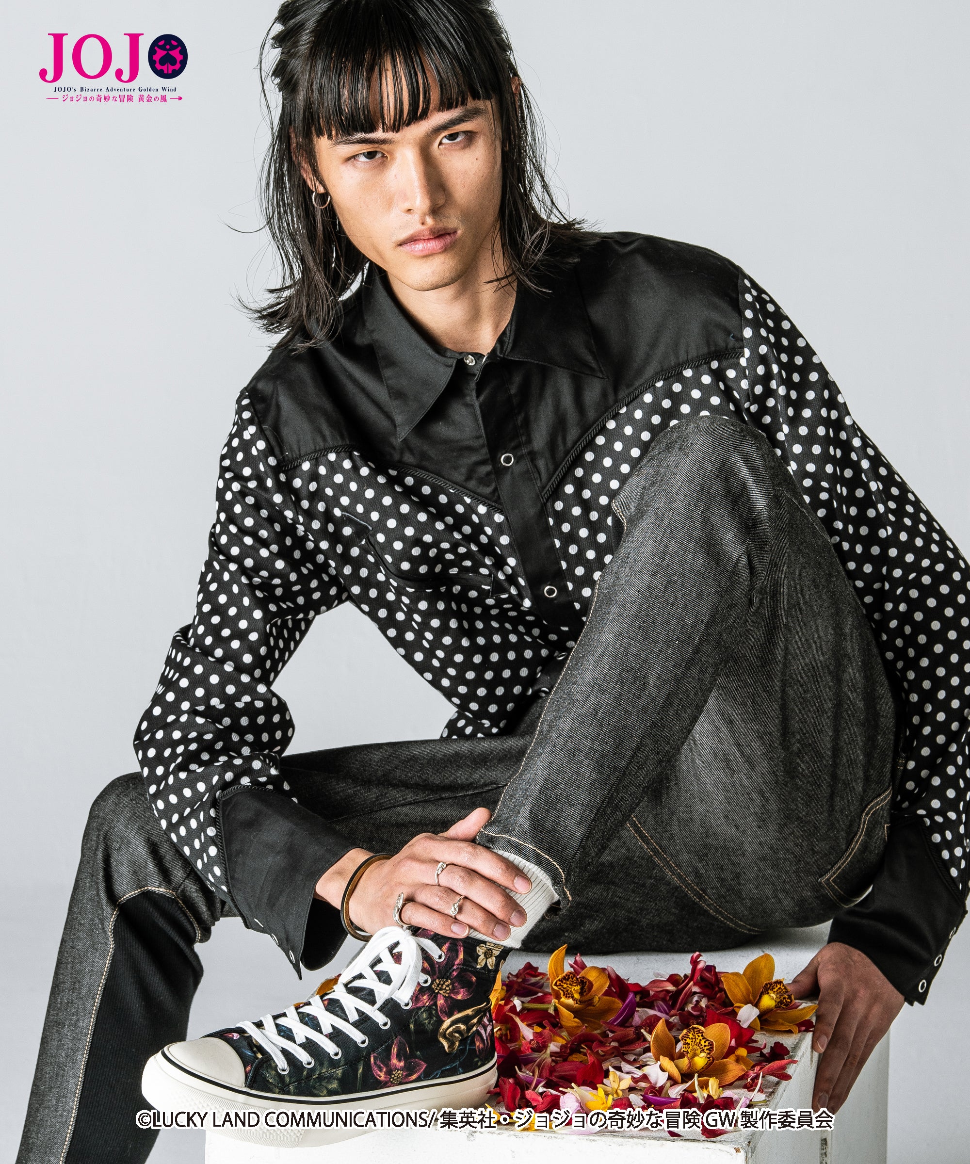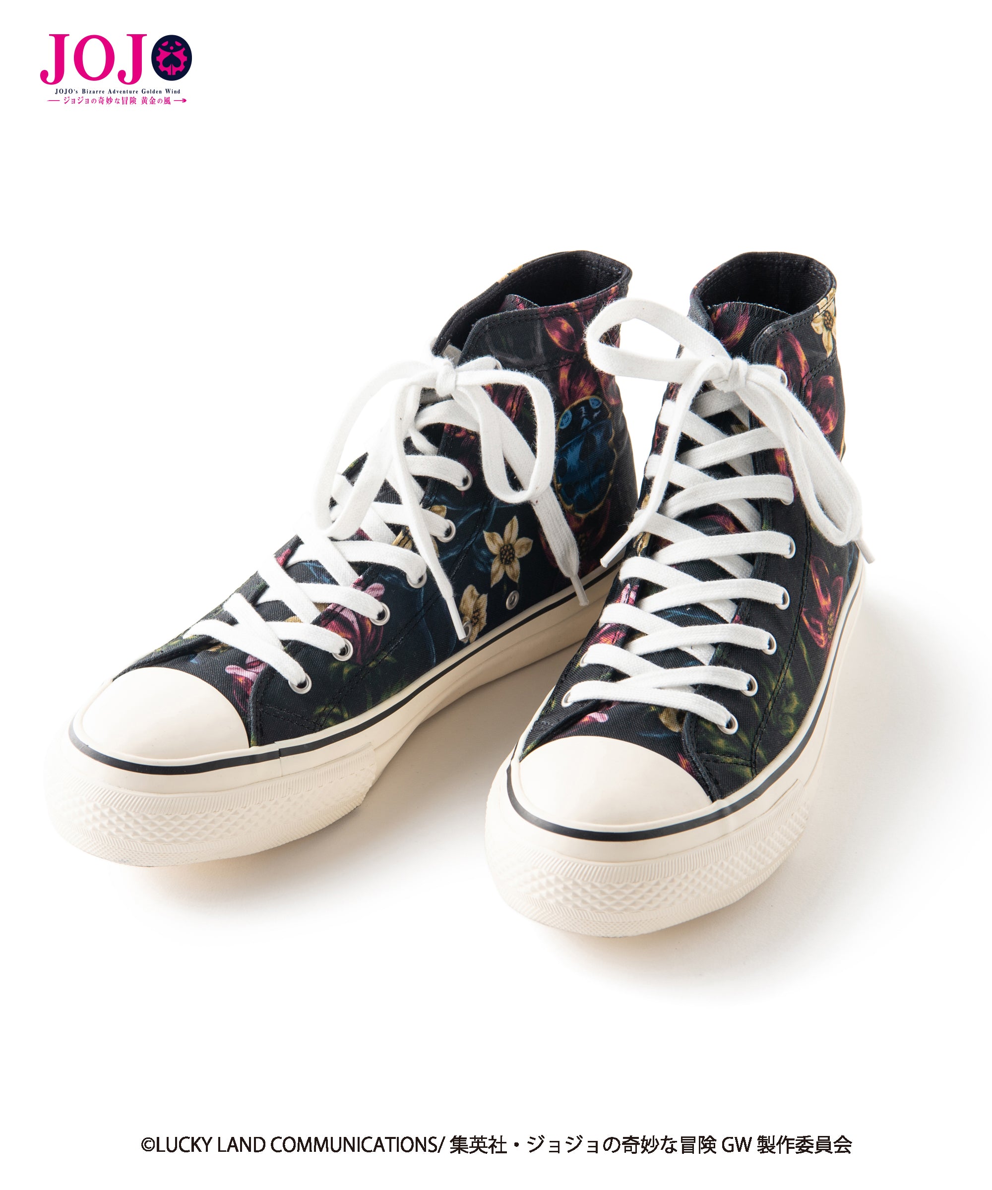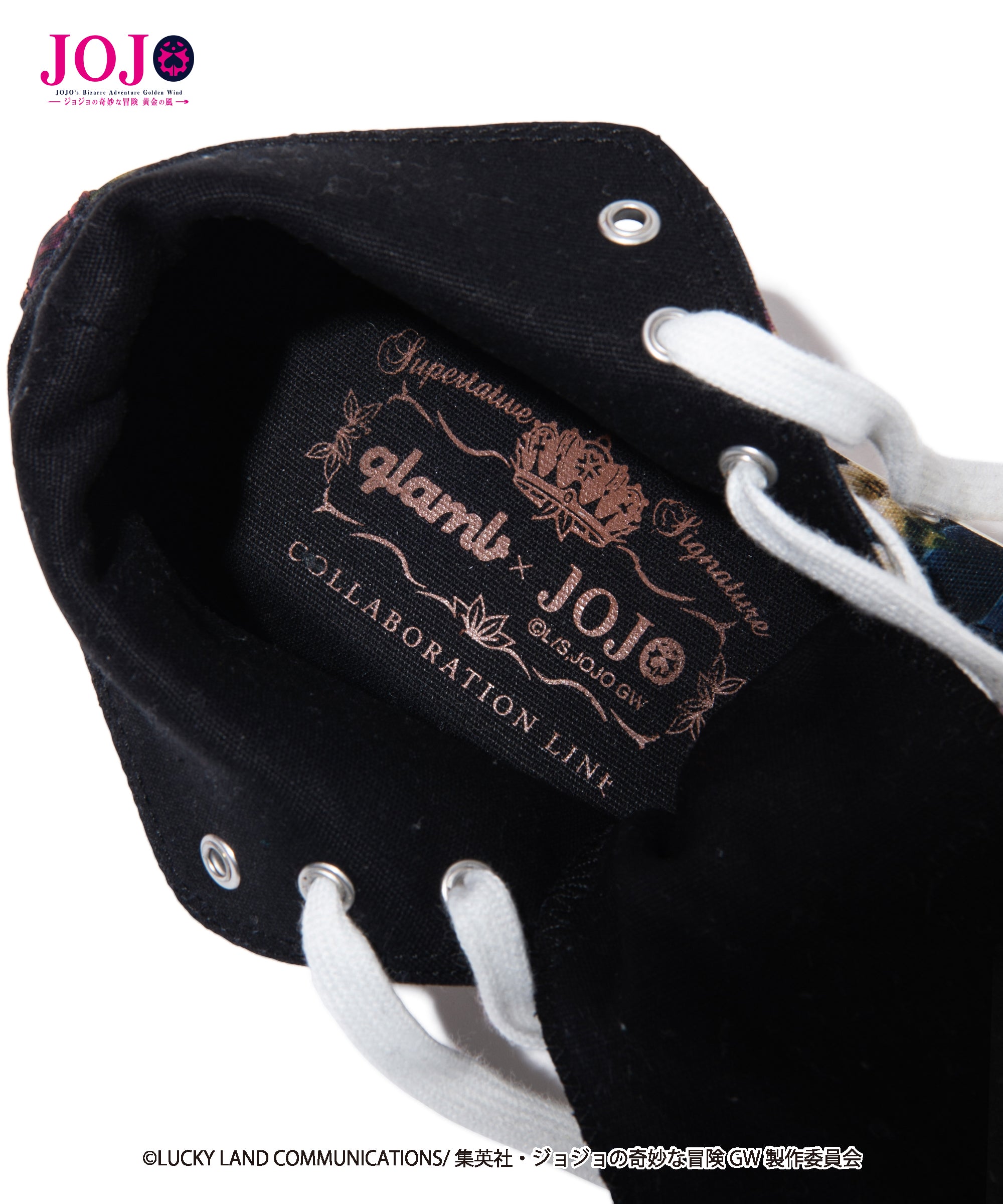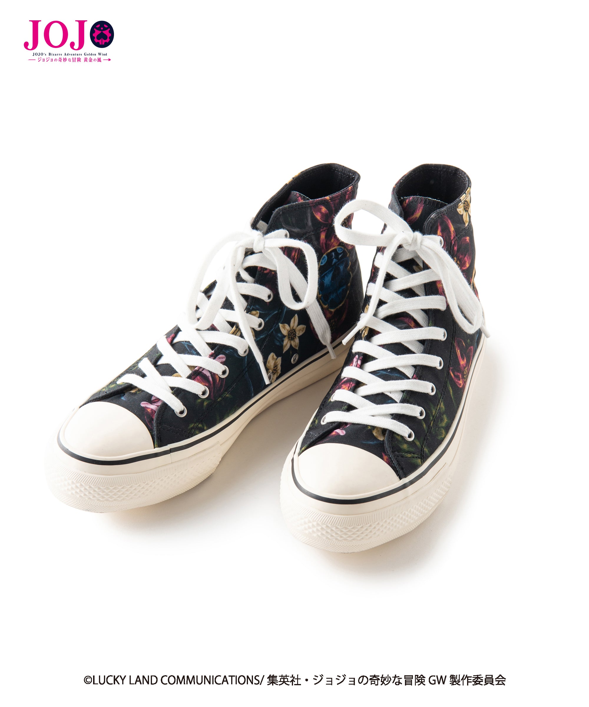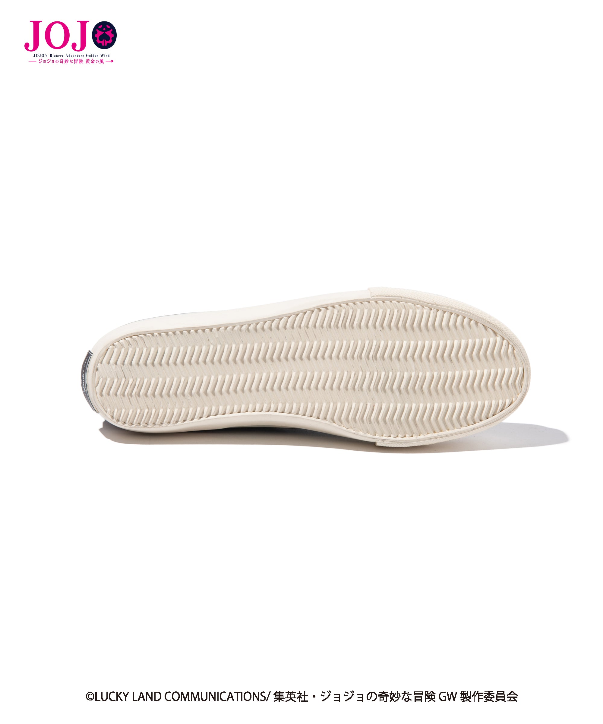 8アイレットのオーセンティックなハイカットスニーカーを彩るのは、ジョルノ・ジョバァーナとスタンド「ゴールド・エクスペリエンス」のモチーフ。ブラックのボディにアールヌーヴォーの草花模様とヴィンテージのアロハ模様を組み合わせたタッチでデザインし、優雅かつ屈強なキャラクター性を象徴しました。オリジナルラストを用いたシャープなフォルムは、ソールとの接着に往年のバルカナイズ製法を採用。職人の確かな技術により、長時間の使用でも疲れを感じさせない仕立てとなっています。