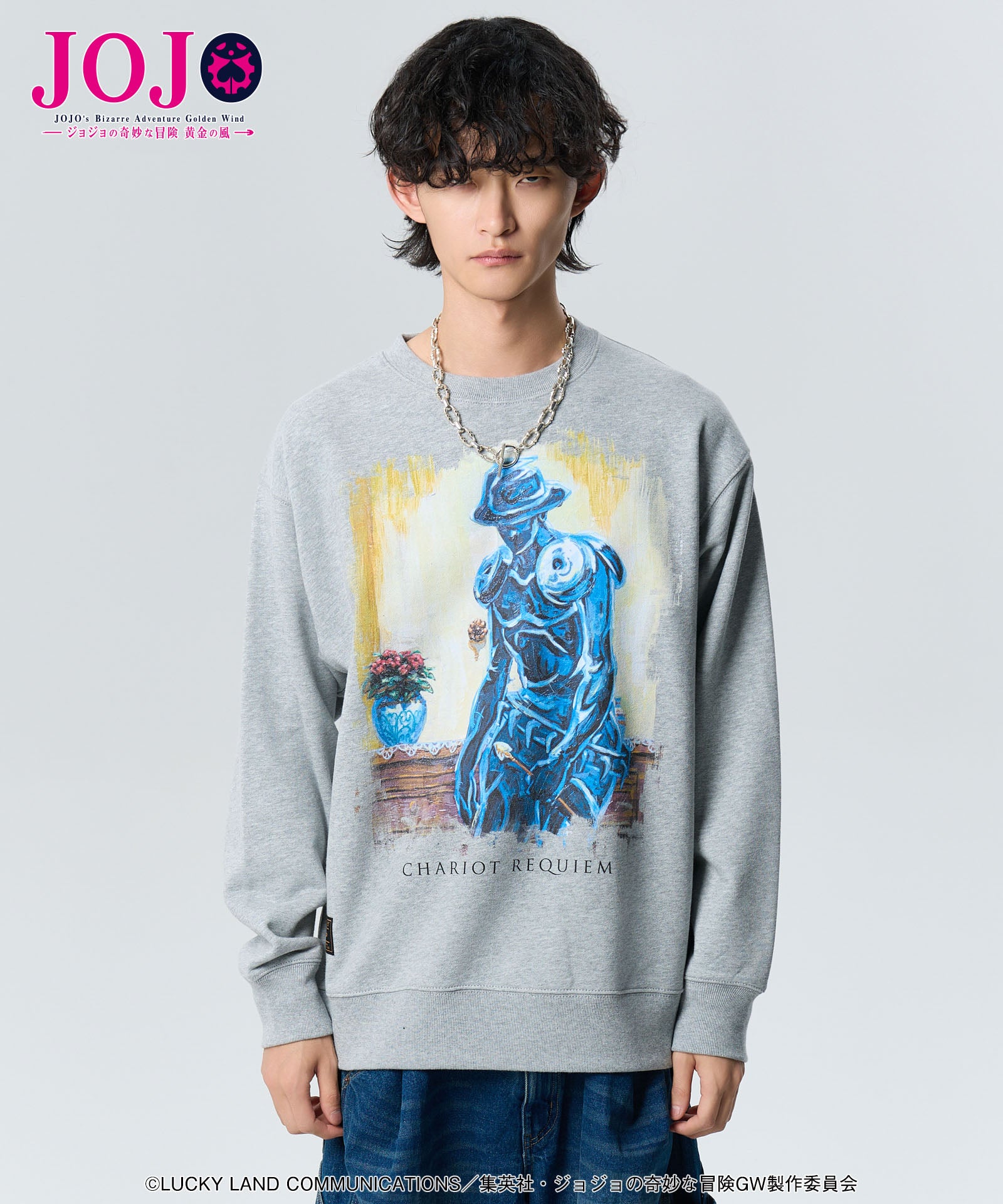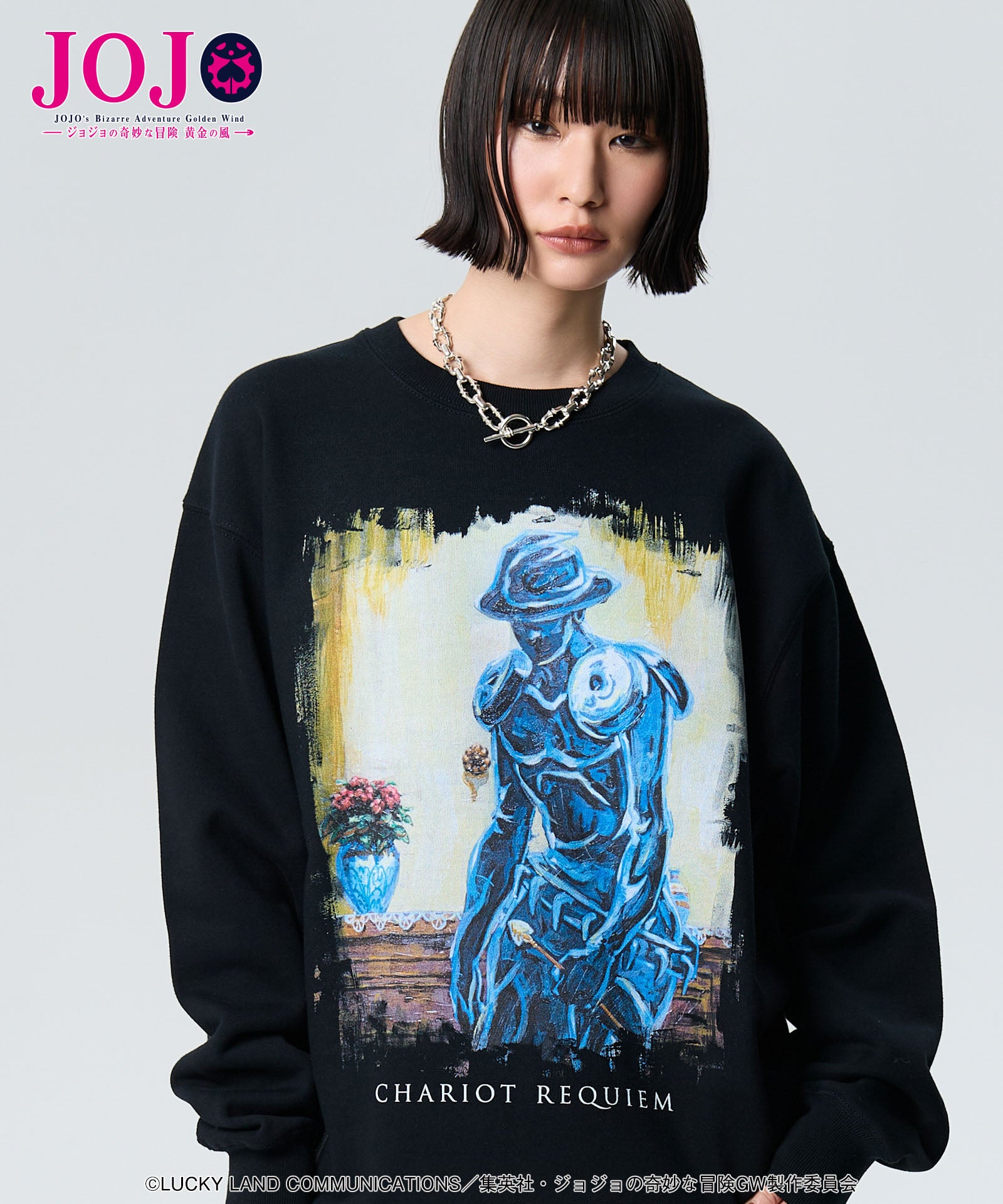 The Chariot Requiem Sweat elevates the ominous image of "Chariot Requiem" into fine art. Rendered in an oil-paint-like texture and composition, the artwork transforms the stand into a serene yet unsettling masterpiece. The 12.7 oz heavyweight French terry fabric is cut into a loose, urban-friendly silhouette.