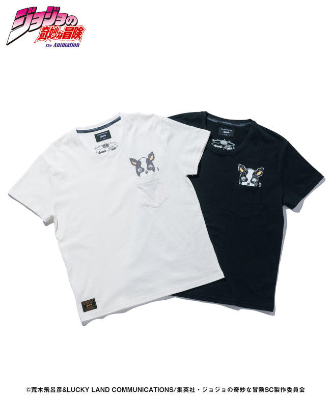 ジョースター一行に突然加わった犬のスタンド使い、イギー。マスコット的な愛嬌を持った彼を、西洋絵本に見られる陰影や、粗く素朴な塗りで愛らしく表現しました。一見ポケットからお行儀よく顔を覗かせているように見えますが、中では歯を剥き出しコーヒー味のチューインガムを食べているというギミックが施されています。ボディはブランド定番の身幅を広く設けたルーズシルエット。テキスタイルには40/2天竺コットンを使用、ソフトな肌触りとデイリーユースに必要な強度を兼ね備えた素材使いとなっています。