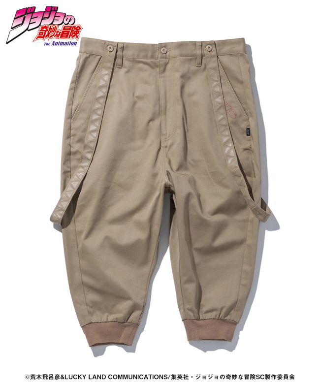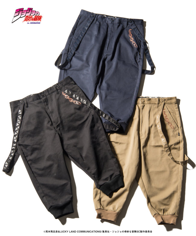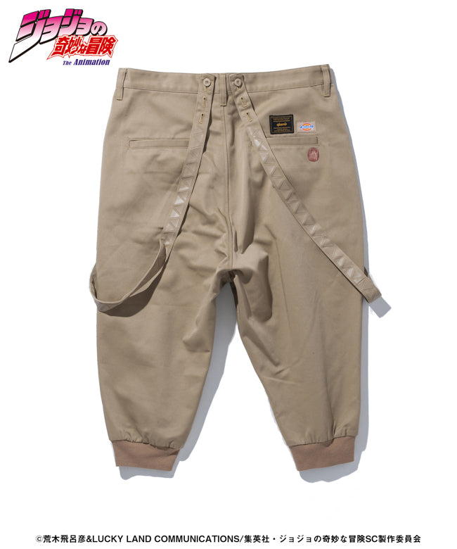 glambとTVアニメ『ジョジョの奇妙な冒険 スターダストクルセイダース』、Dickiesのトリプルネームでリリースとなるのは、承太郎のモチーフを散りばめたスペシャルなサルエルパンツ。深くとった股上と踝が見えるクロップド丈のスタイリッシュなシルエットに、キャップの手のエンブレムと襟のチェーンをそれぞれ厚盛と金粉でプリント。ベルトの柄は付属のサスペンダーに厚盛プリントで表現しました。ストリートライクに仕上げられたデザインはglambならではのものです。生地と縫製はタフな物作りに定評のあるDickiesが担当。いつまでも崩れない、長い穿きこなしをお約束致します。