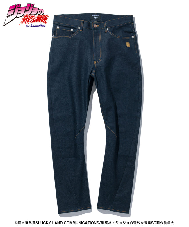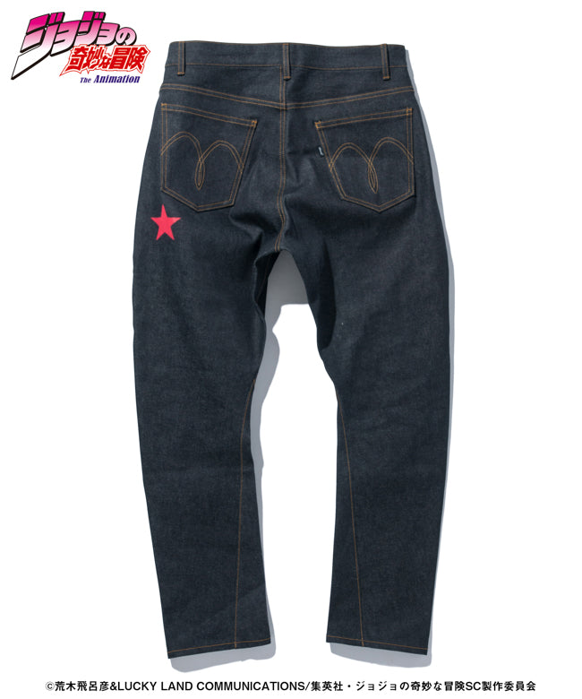 TVアニメ『ジョジョの奇妙な冒険 スターダストクルセイダース』を代表する二大モチーフを、glambの定番Poly denim〈ポリーデニム〉に落とし込みました。主人公・承太郎のキャップにある手のエンブレムはウエストにシーリングスタンプ風に。ジョースター家と宿敵・DIOの首にある★型のアザはバックスタイルにステンシルを思わせるタッチでプリントしました。シンプルなデザインは、どんなアイテムとも合わせやすい仕上がり。立体裁断で仕立てられたサルエルシルエットは、一見タイトながらストレスを感じないゆったりとした着用が可能です。