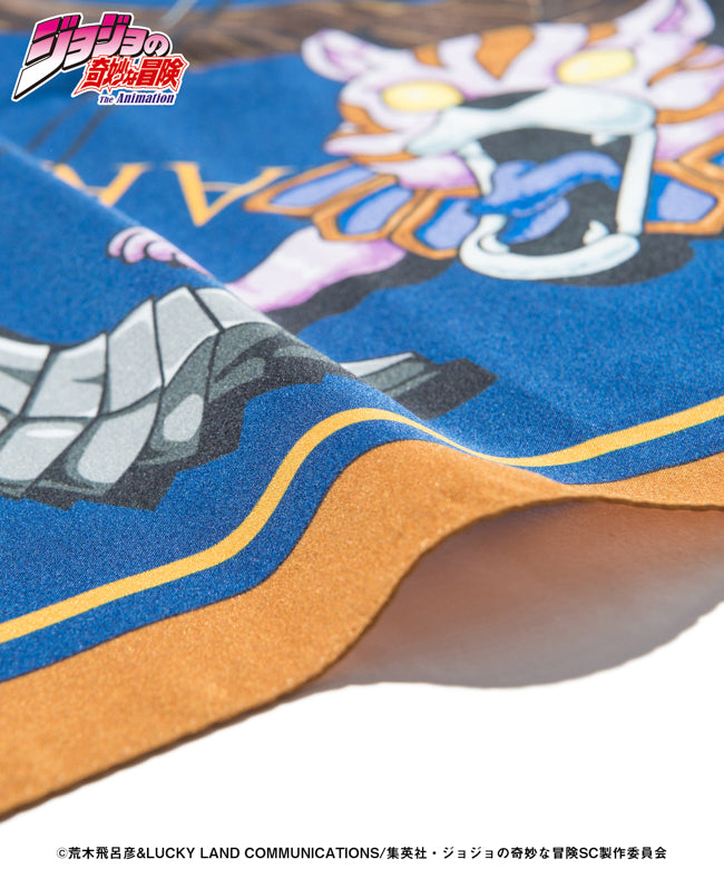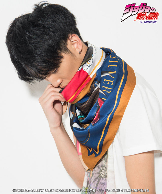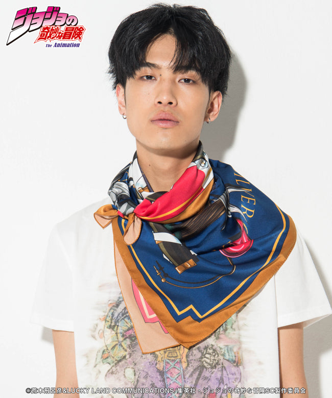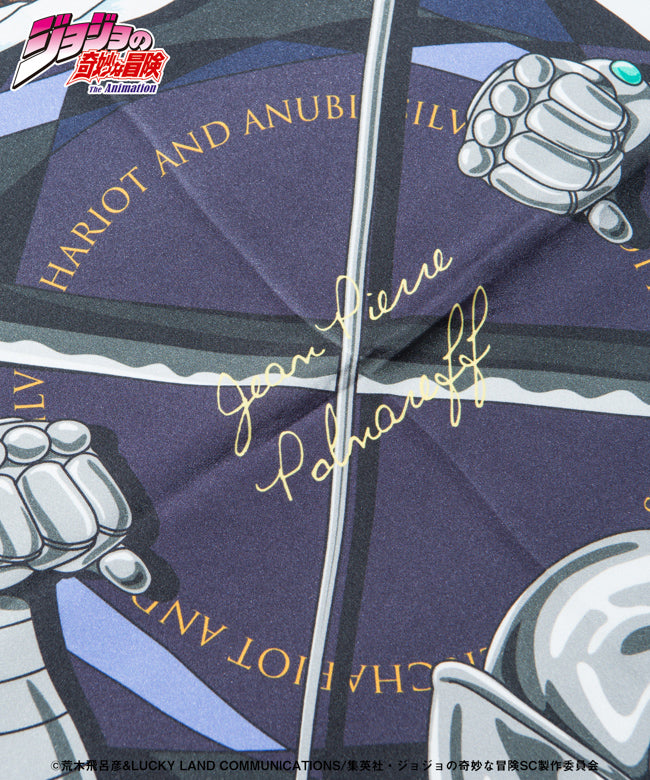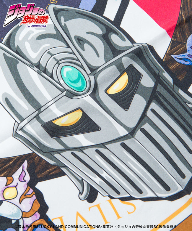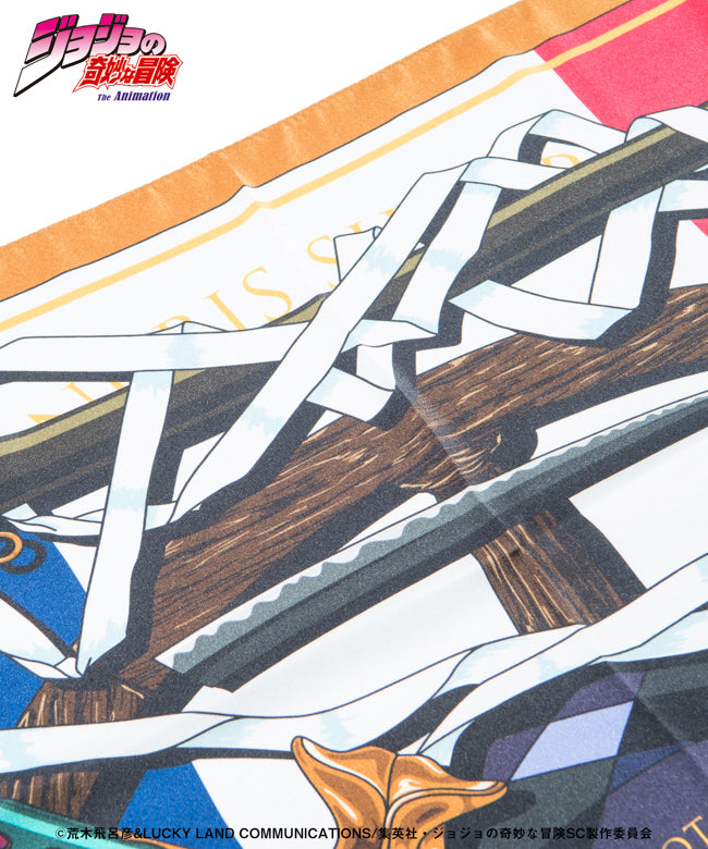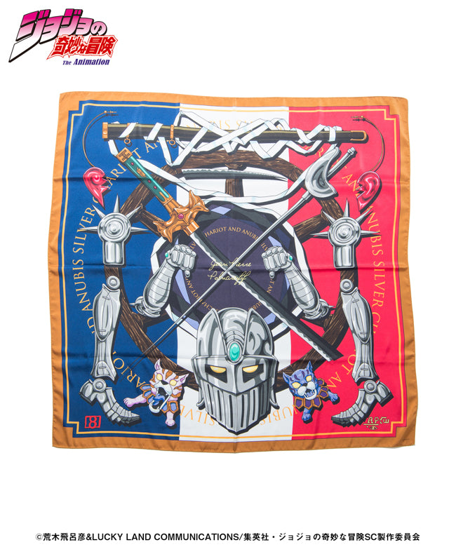 スタンド「シルバーチャリオッツ」にまつわるモチーフでデザインしたスカーフは、高級感溢れる往年の同アイテムをオマージュしたもの。バラバラになった甲冑、本体であるポルナレフのイヤリング、精神を乗っ取られ使用したアヌビス神の剣、タロットカード「戦車」に描かれた車輪と猫など、あらゆるディテールを美しくシンメトリックに配置。背景に敷いたフランス国旗トリコロールがロイヤルな騎士道のムードを高めます。シルクの滑らかさとレーヨンのしなやかさが同居した素材は、グラフィックに相応しい高級感ある手触りです。