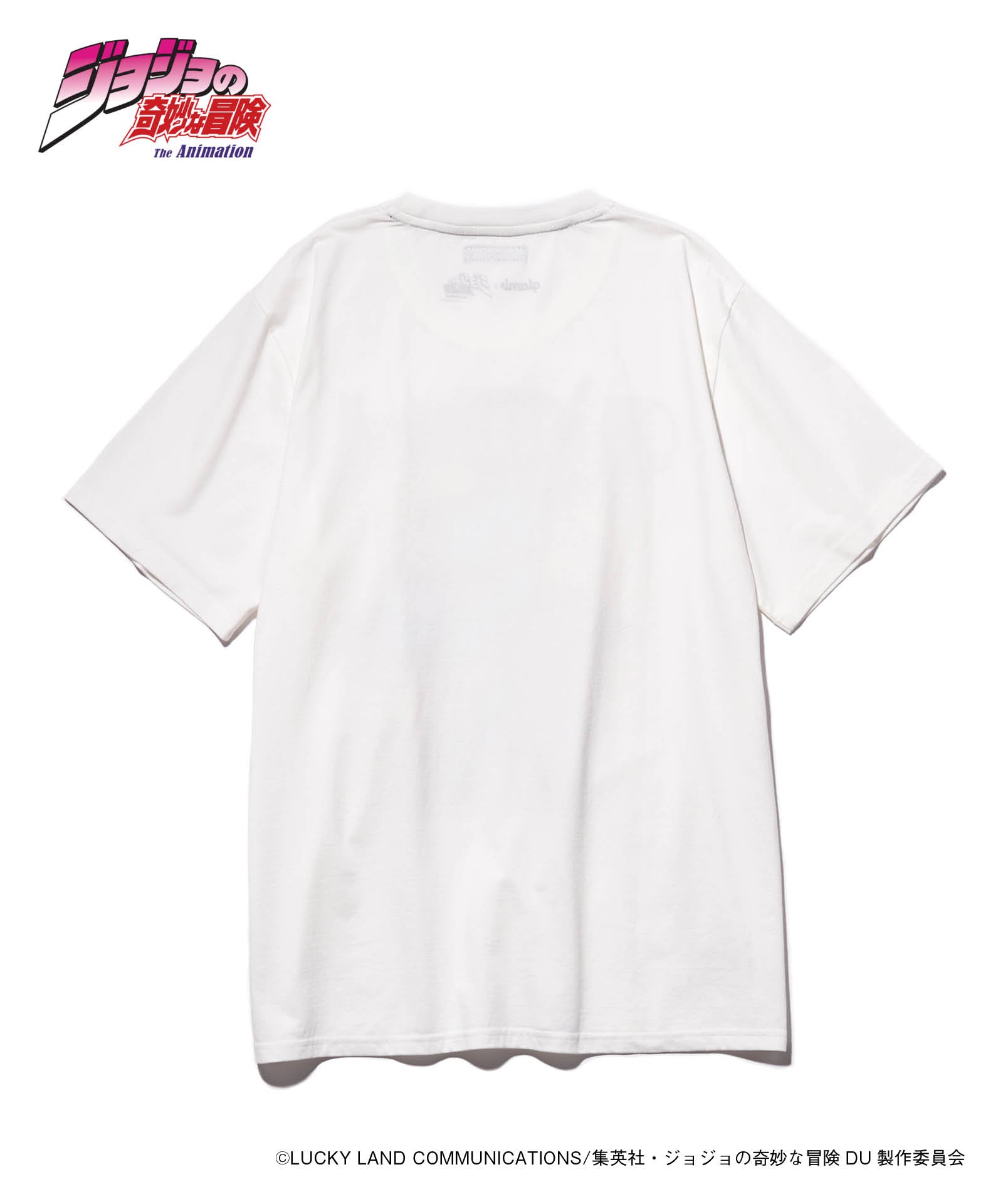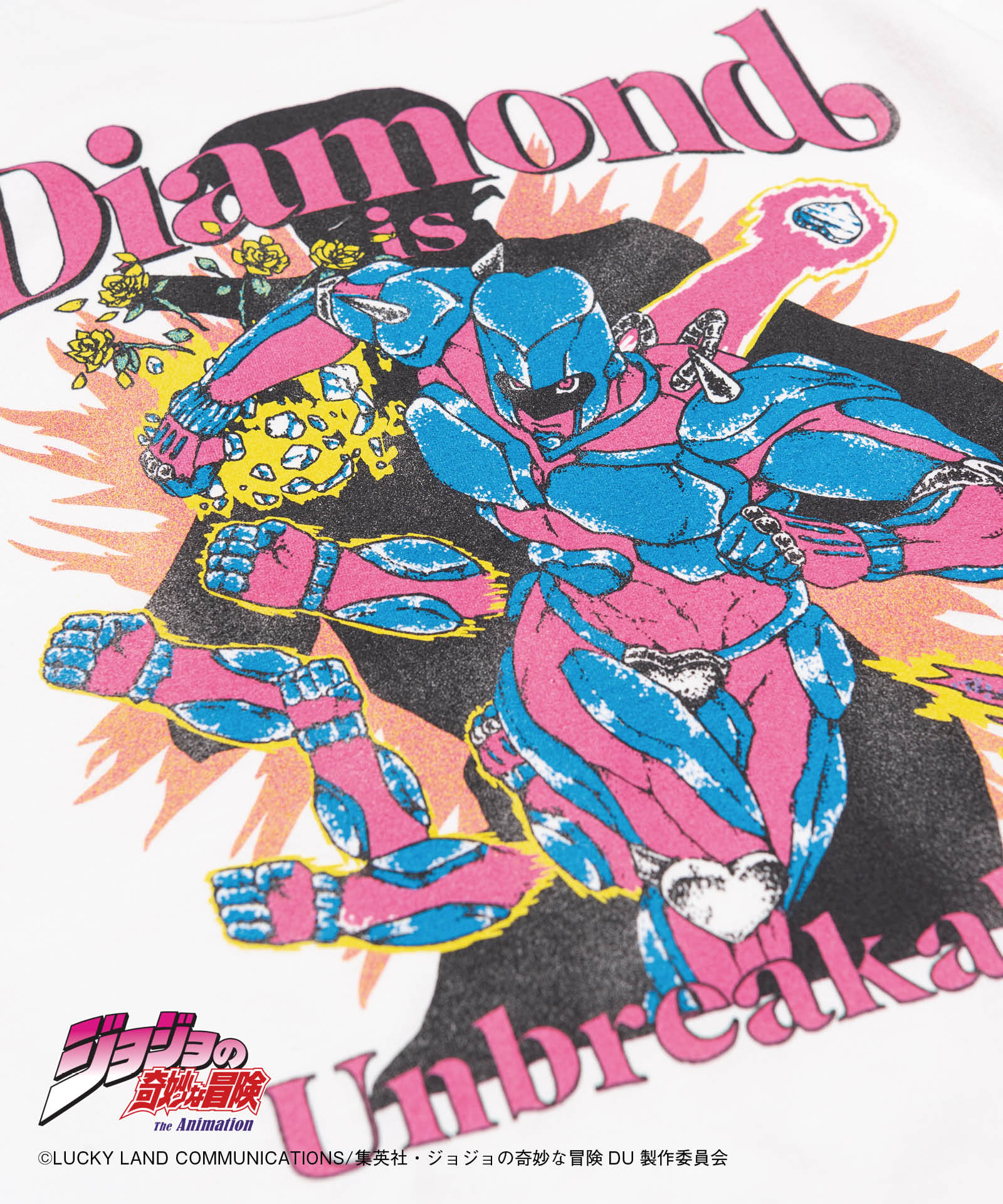 glambとTVアニメ『ジョジョの奇妙な冒険 ダイヤモンドは砕けない』とのコラボレーション再び。70年代カルチャーを彷彿させるサイケデリックなタッチで作品を代表するスタンド『クレイジー・ダイヤモンド』を描き上げたCrazy Diamond T II。躍動感あるキャラクターを彩るビビッドな色使いは往年のロックTシャツに倣ったもの。ラストバトルで攻撃に使用したガラスの破片、主人公・東方仗助のラストシーンのポーズを象ったシャドウも描き込み、重層的なグラフィックに仕上げました。 テキスタイルには5.6オンスで程よい肉厚の、上質なコットン100%天竺を使用。着丈を長めに、身幅を広めに設けたルーズシルエットが現代的なトップススタイルを叶えます。