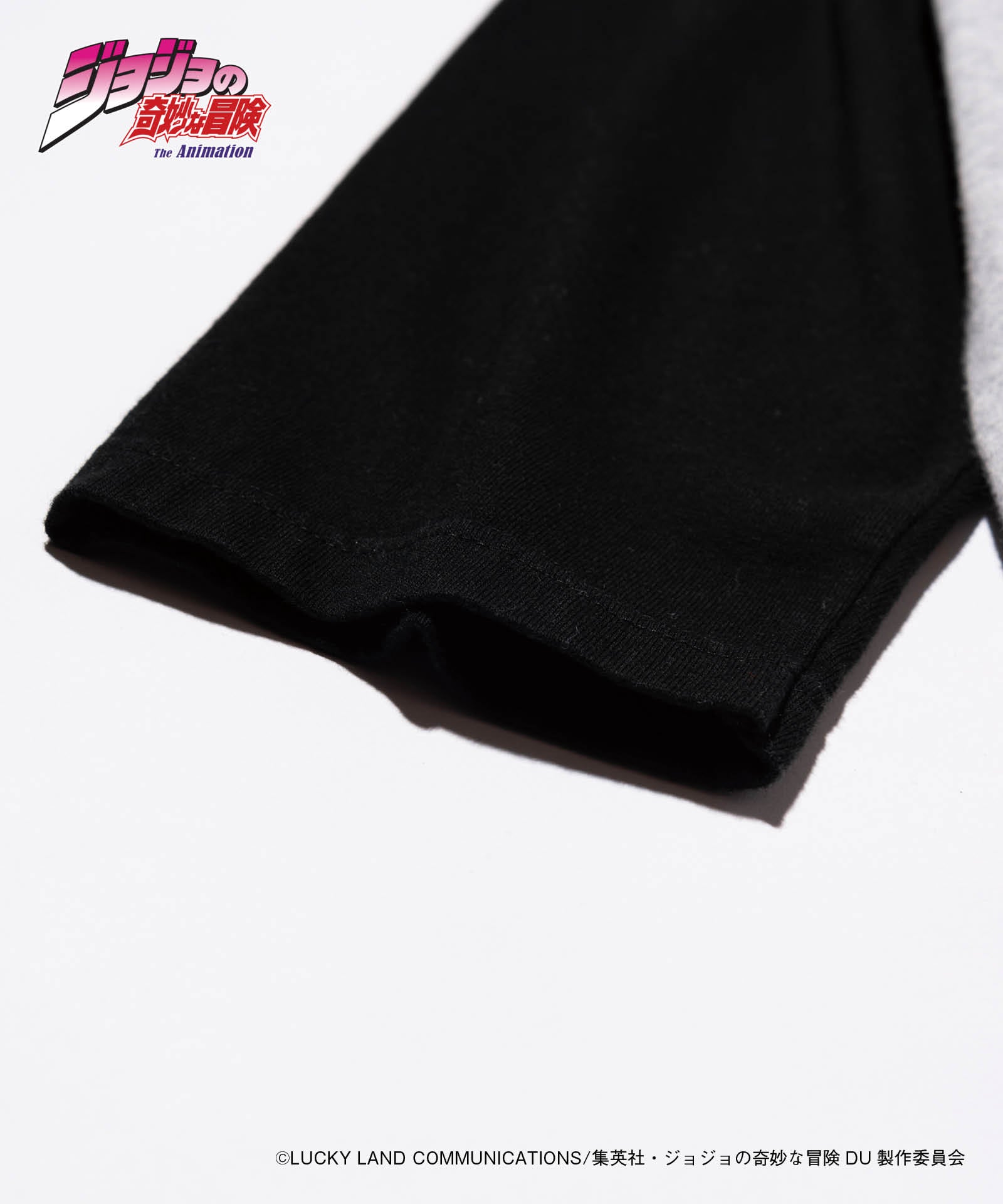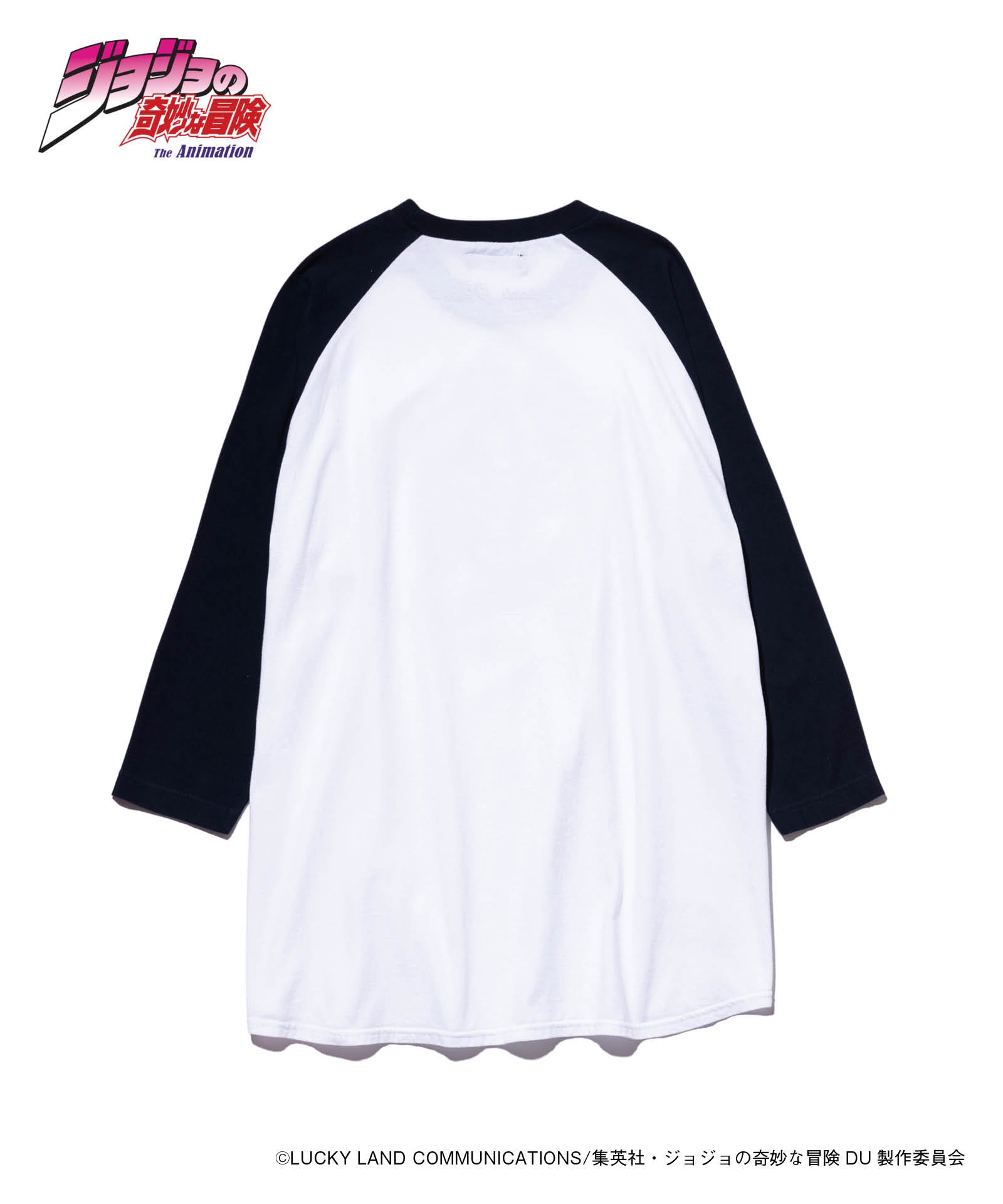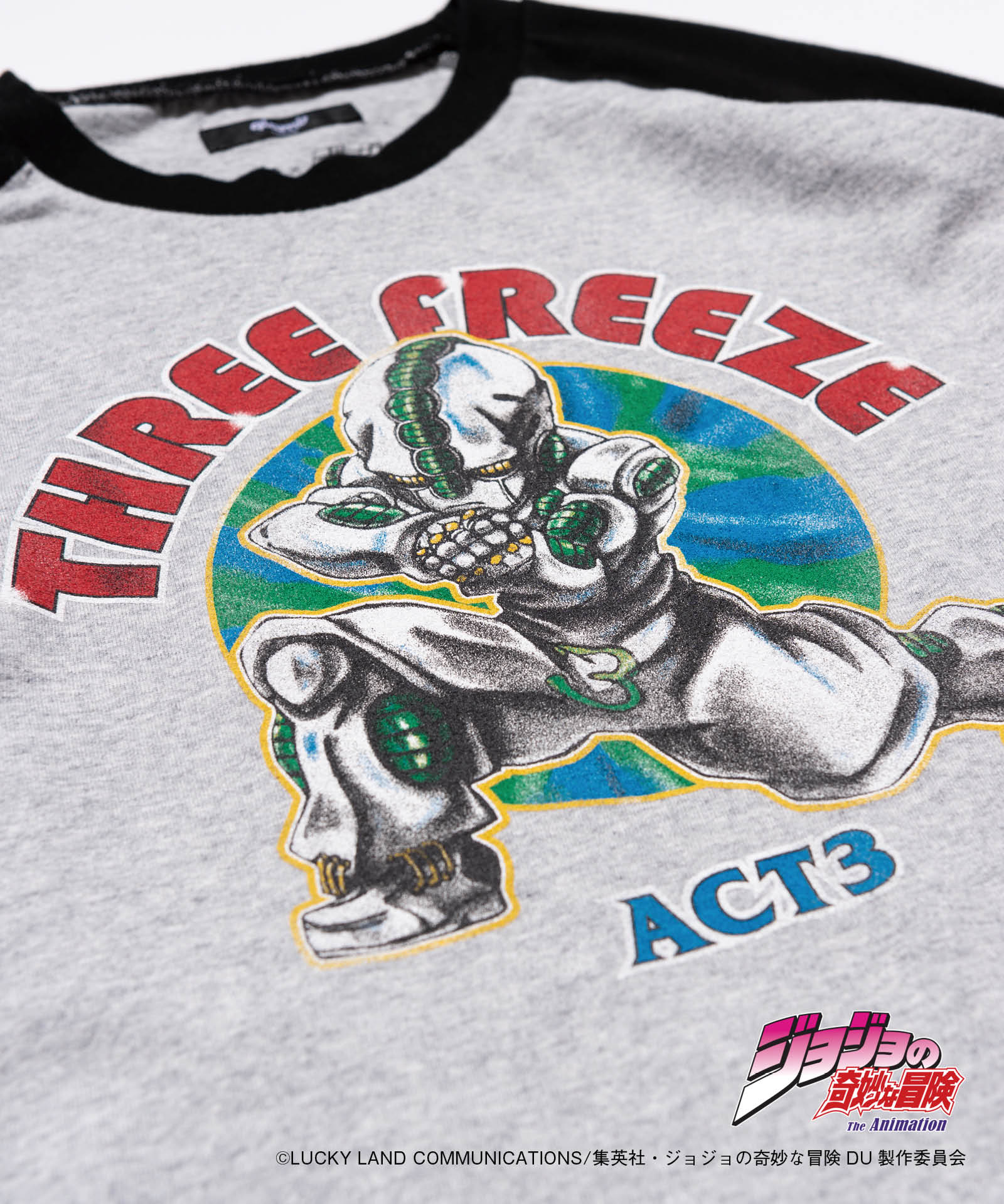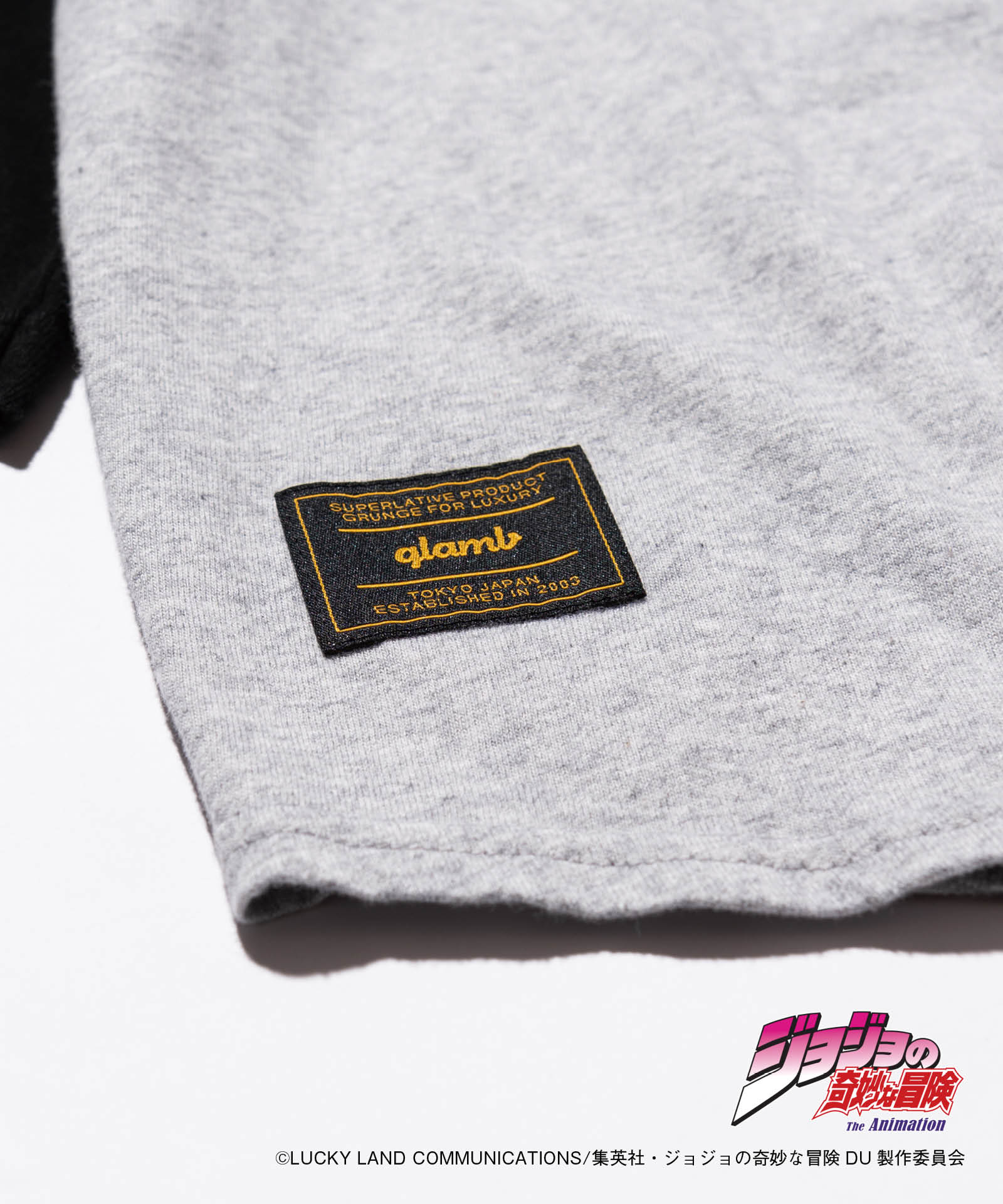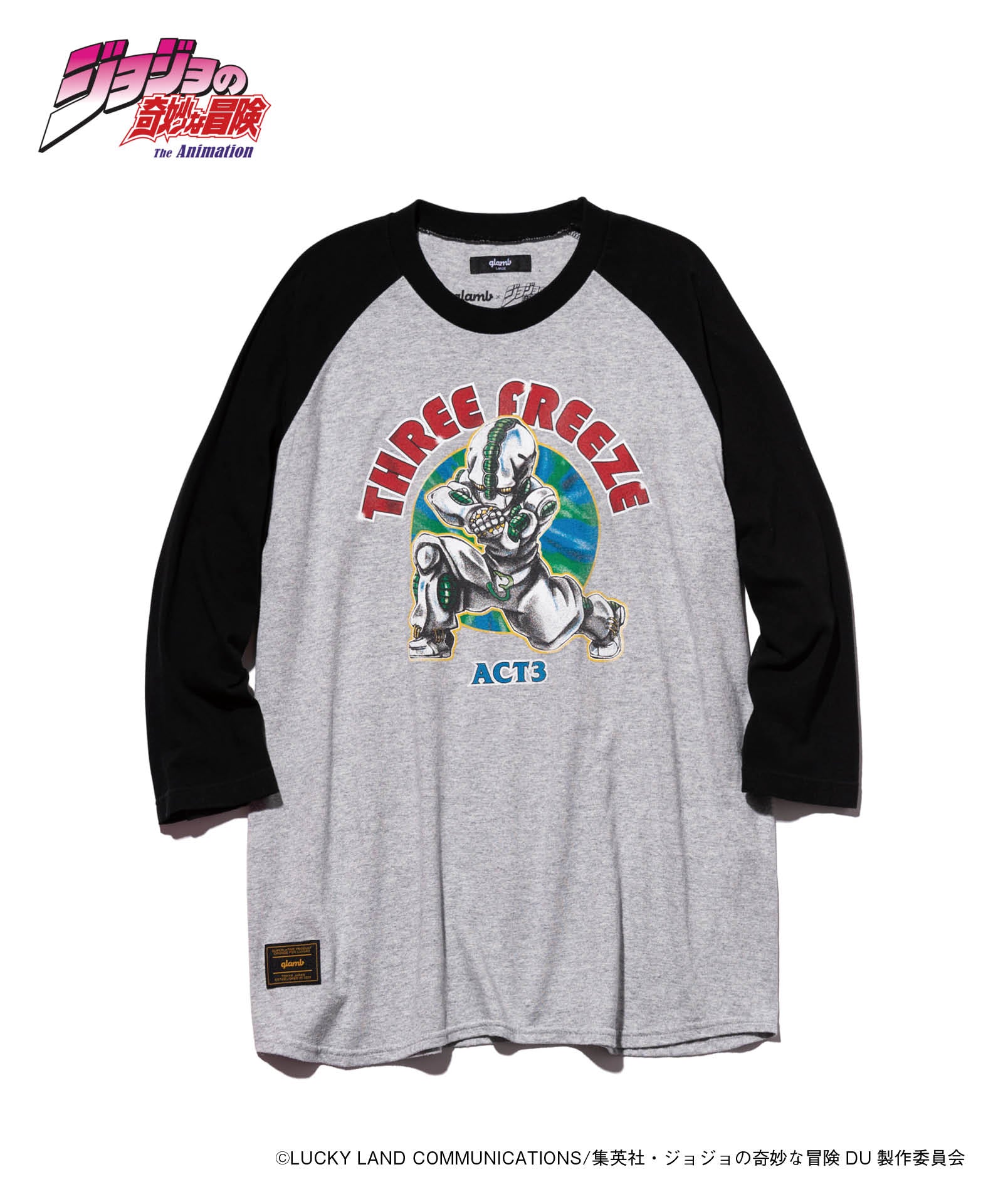 glambとTVアニメ『ジョジョの奇妙な冒険 ダイヤモンドは砕けない』とのコラボレーション再び。オールドスクールなムードあるラグランボディに広瀬康一のスタンド『エコーズACT3』を乗せたACT3 Freeze Raglan T。網点のタッチでヴィンテージライクに描かれたのは、初登場シーンで見せた『エコーズACT3』の印象的なポーズ。プリント後にバイオウォッシュを施し、いっそう経年変化の質感を演出しています。テキスタイルに用いたのはアメカジライクなヘビーウェイトの100%コットン17/-天竺。ボトムスを選ばないレギュラーシルエットにより様々なスタイリングで活躍します。