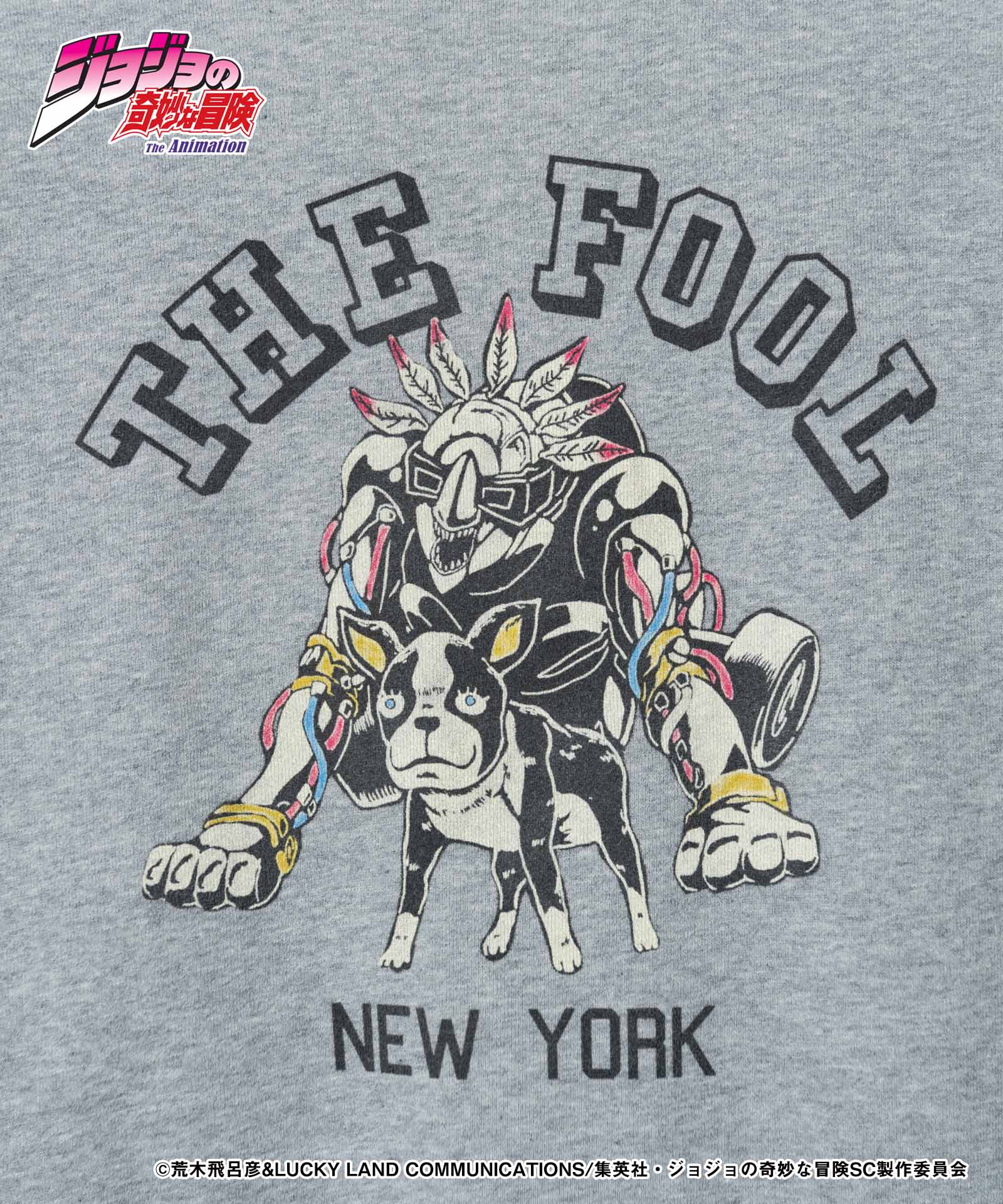 愛嬌あるルックスとそれに相反した性格、そして強力なスタンドをヴィジュアライズするにあたり、ソースとしたのはヴィンテージカレッジスウェット。スタンド名とイギーの生まれたNYをロゴ使い、さらには真正面を見据える力強い構図によりUSスタイルのタフな印象に描きました。