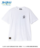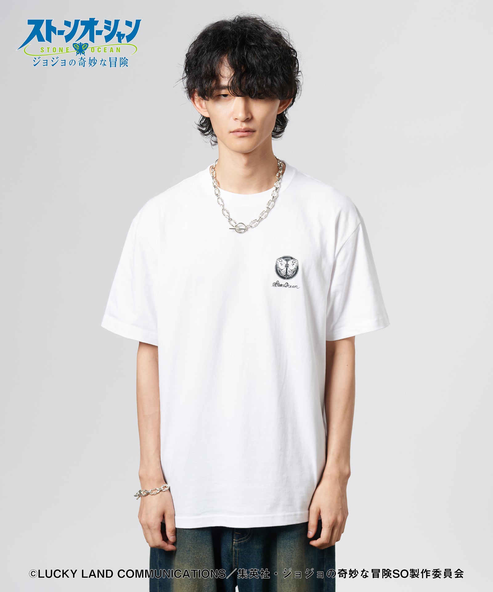 70's音楽カルチャーを彷彿とさせるホワイト/ブラックのカラーパレットを用いて、バックスタイルにオールドアメリカンなタッチで徐倫を描写。彼女がG.D.St刑務所に収監された日付も添えて、美しく強い女性としてのキャラクター像を表現しています。フロントでは胸元に作品を象徴する蝶のモチーフをプリントし、コンセプチュアルな佇まいにまとめています。