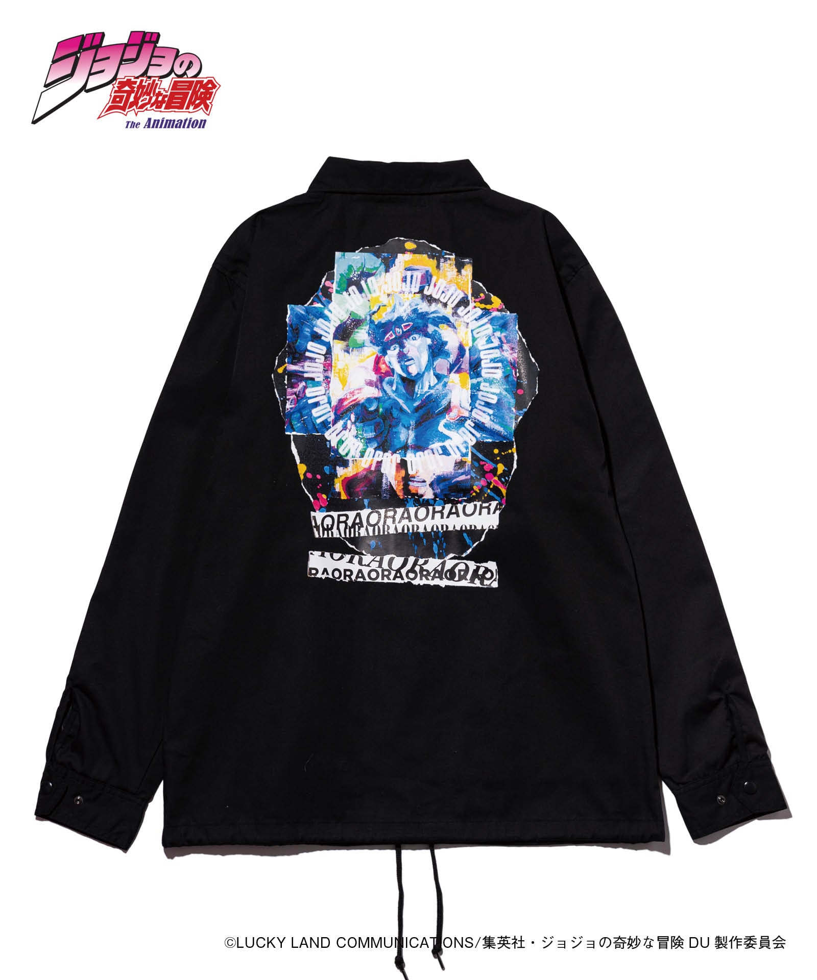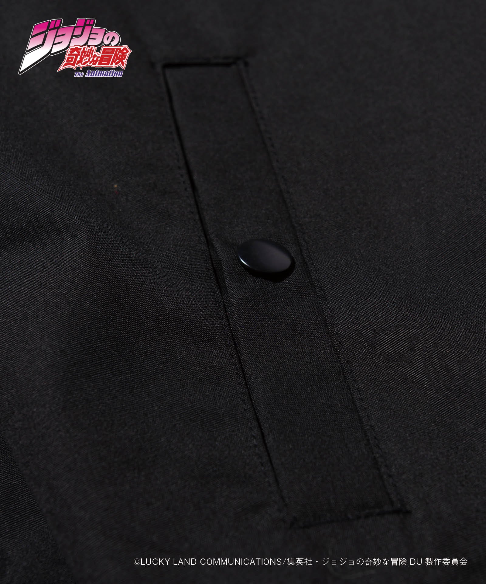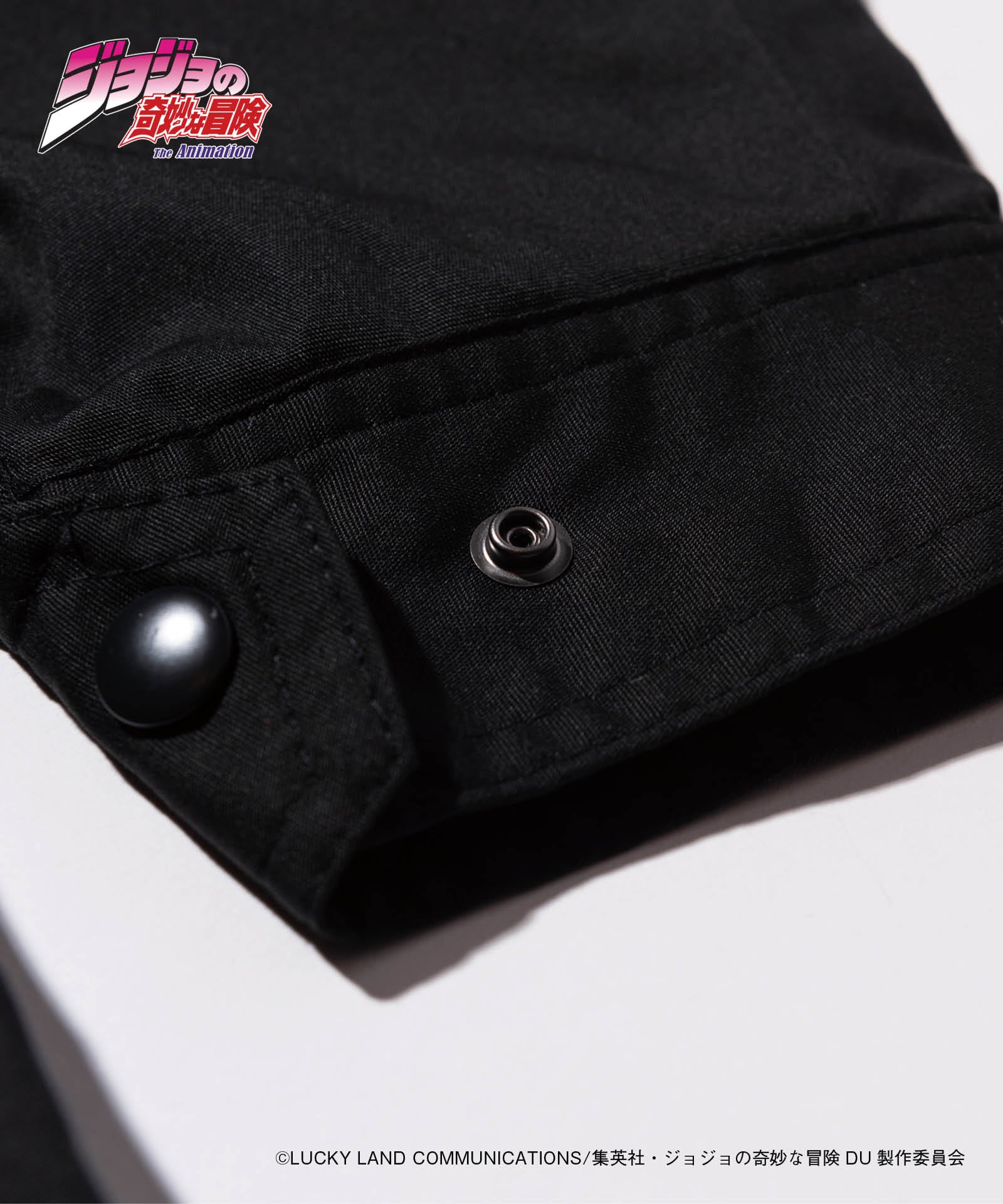 glambとTVアニメ『ジョジョの奇妙な冒険 ダイヤモンドは砕けない』とのコラボレーション再び。劇中のクライマックスのワンシーンをレトロスタイルのブルゾンに閉じ込めたStar Platinum Coach JKT。バックスタイルに描かれたのは今まさに時を止める能力を発動する空条承太郎のスタンド『スタープラチナ』。激しい筆致のペイントとタイポグラフィを組み合わせたアヴァンギャルドなコラージュアートでドラマチックに描きました。一転してシンプルなフロントでも胸元の「JOJO」ロゴを一文字ごとに書体を変えたコラージュで表現。ブランドのこだわりを隅々まで込めた一着となっています。シルエットはスタイルやトレンドにとらわれず長くお楽しみいただけるレギュラーフィット。素材にはポリエステルの耐久性とコットンの快適さを兼ね備えたT/Cウェザーを使用しています。