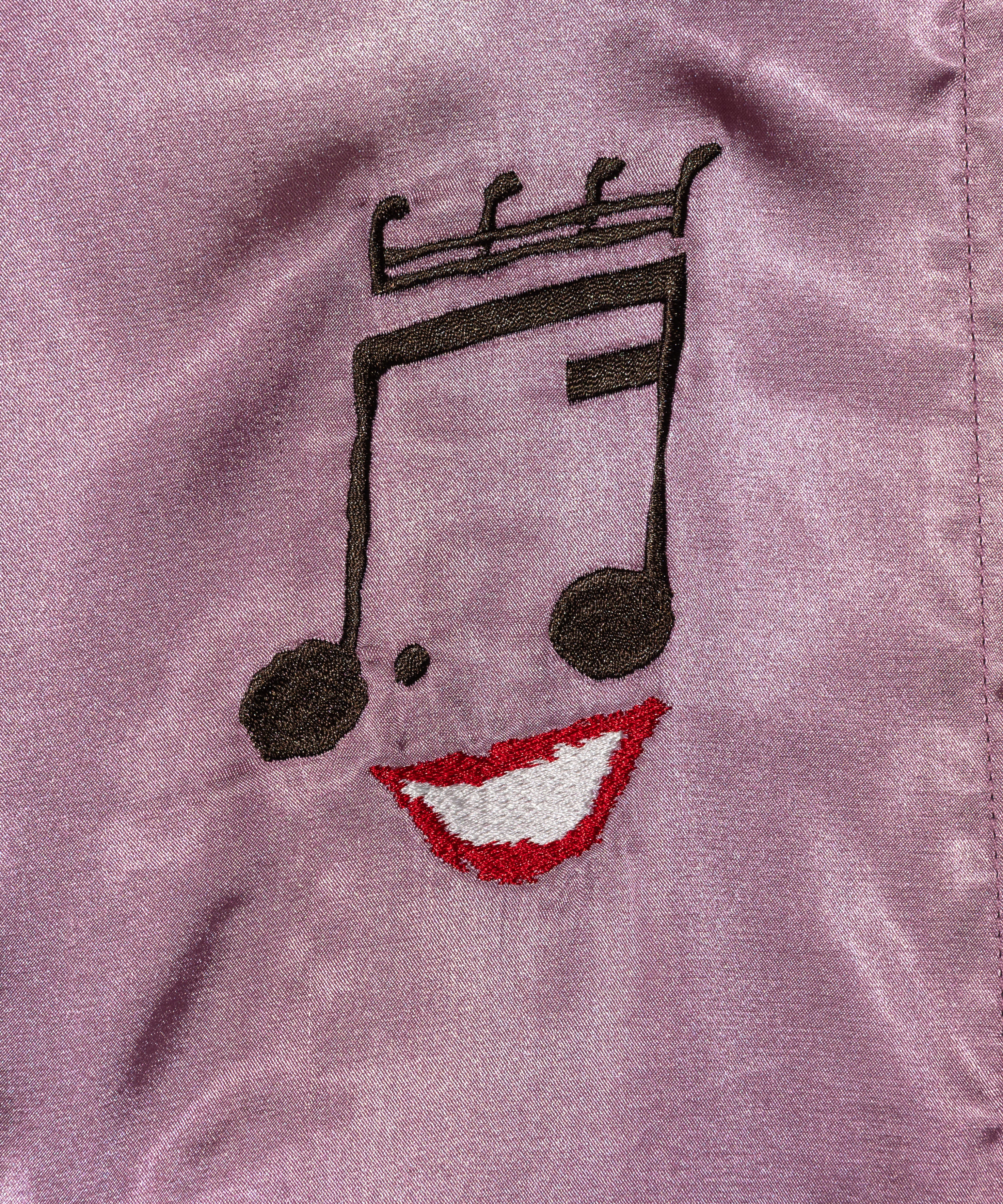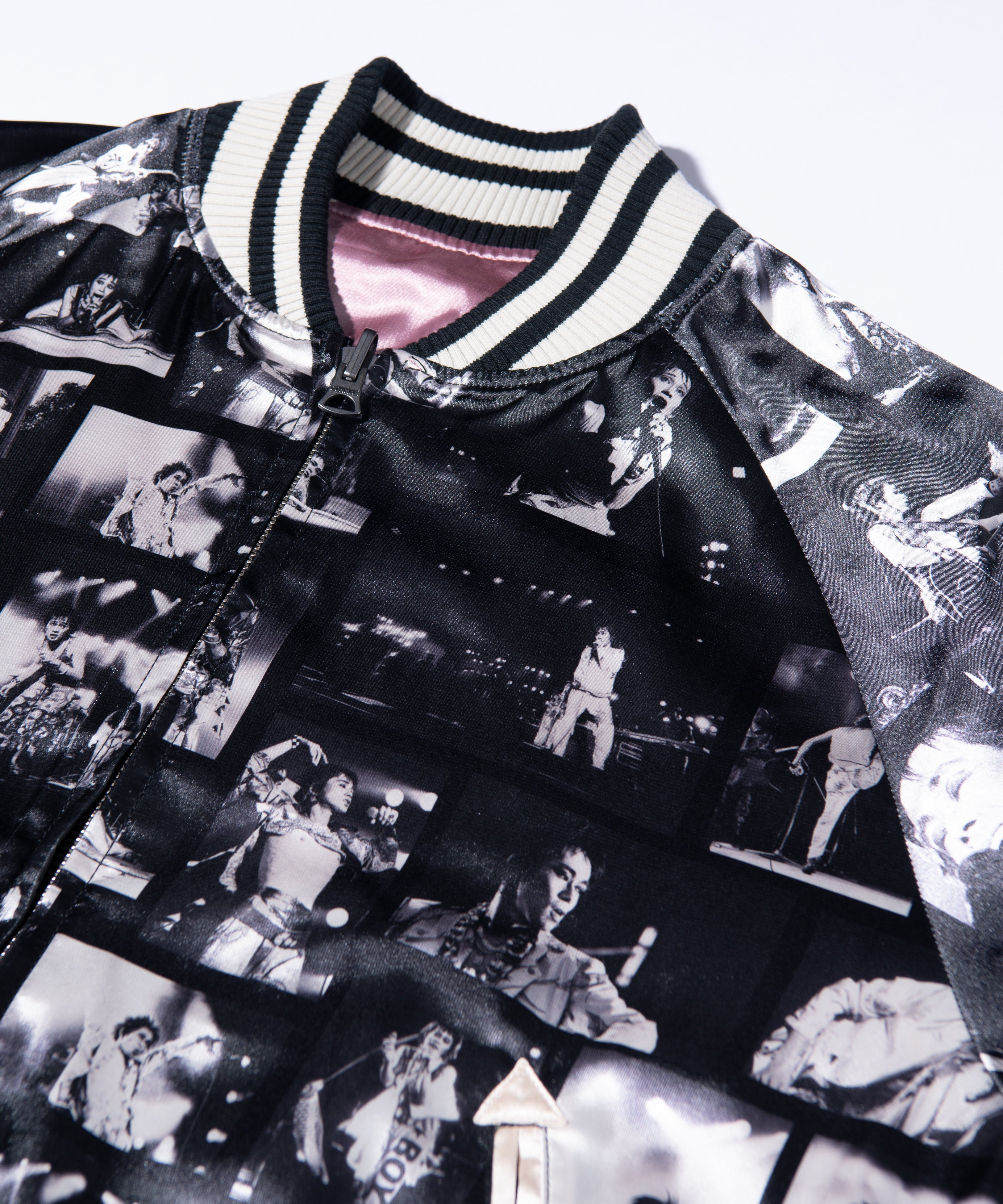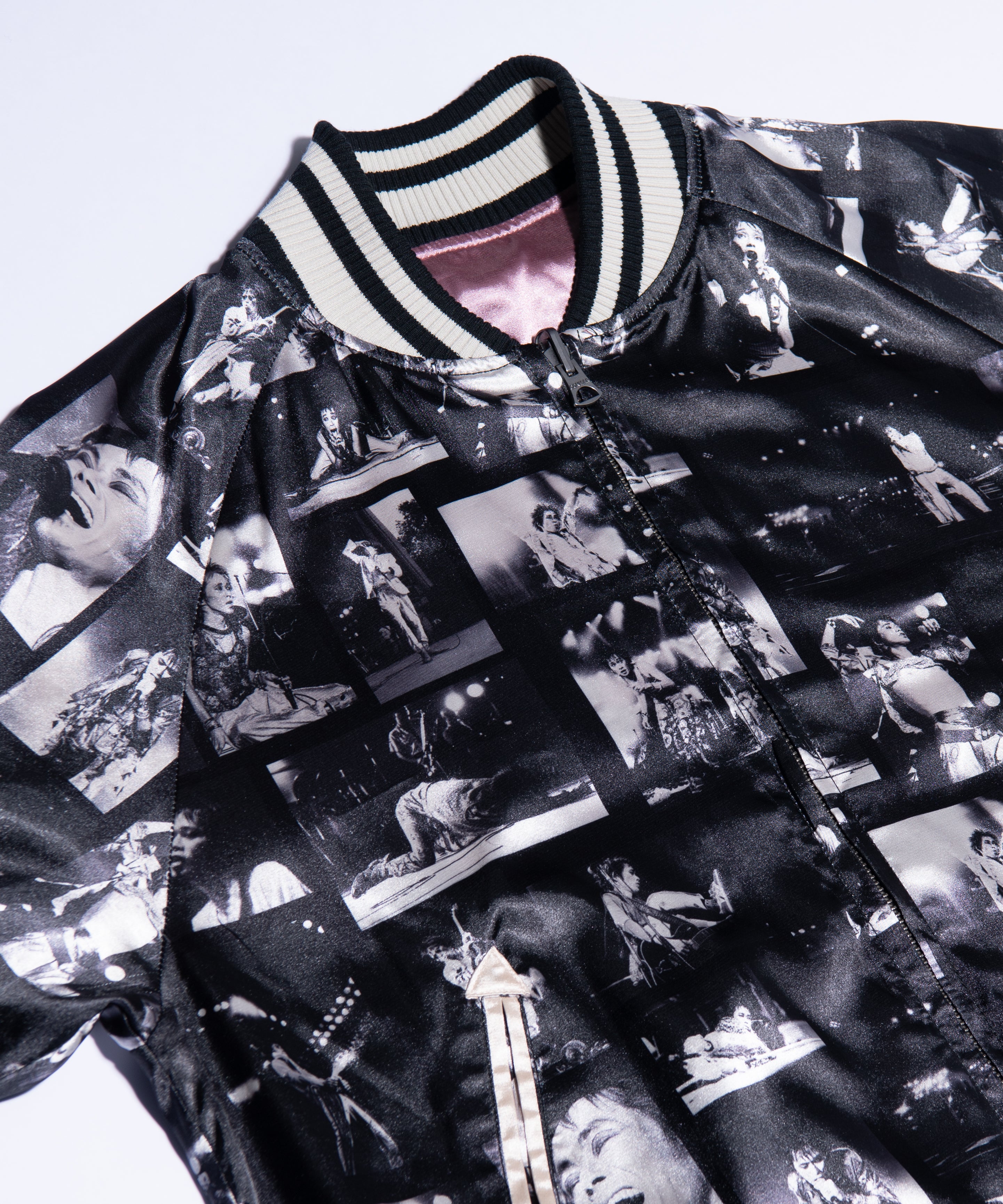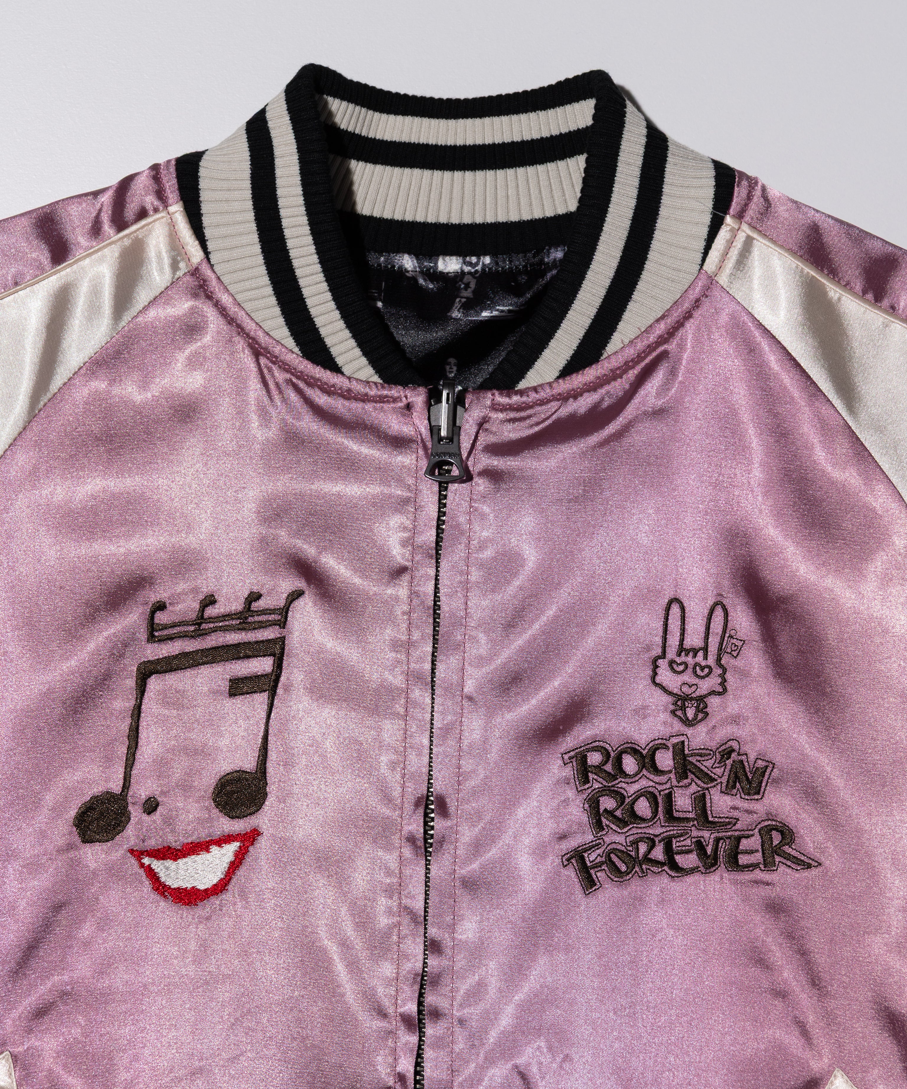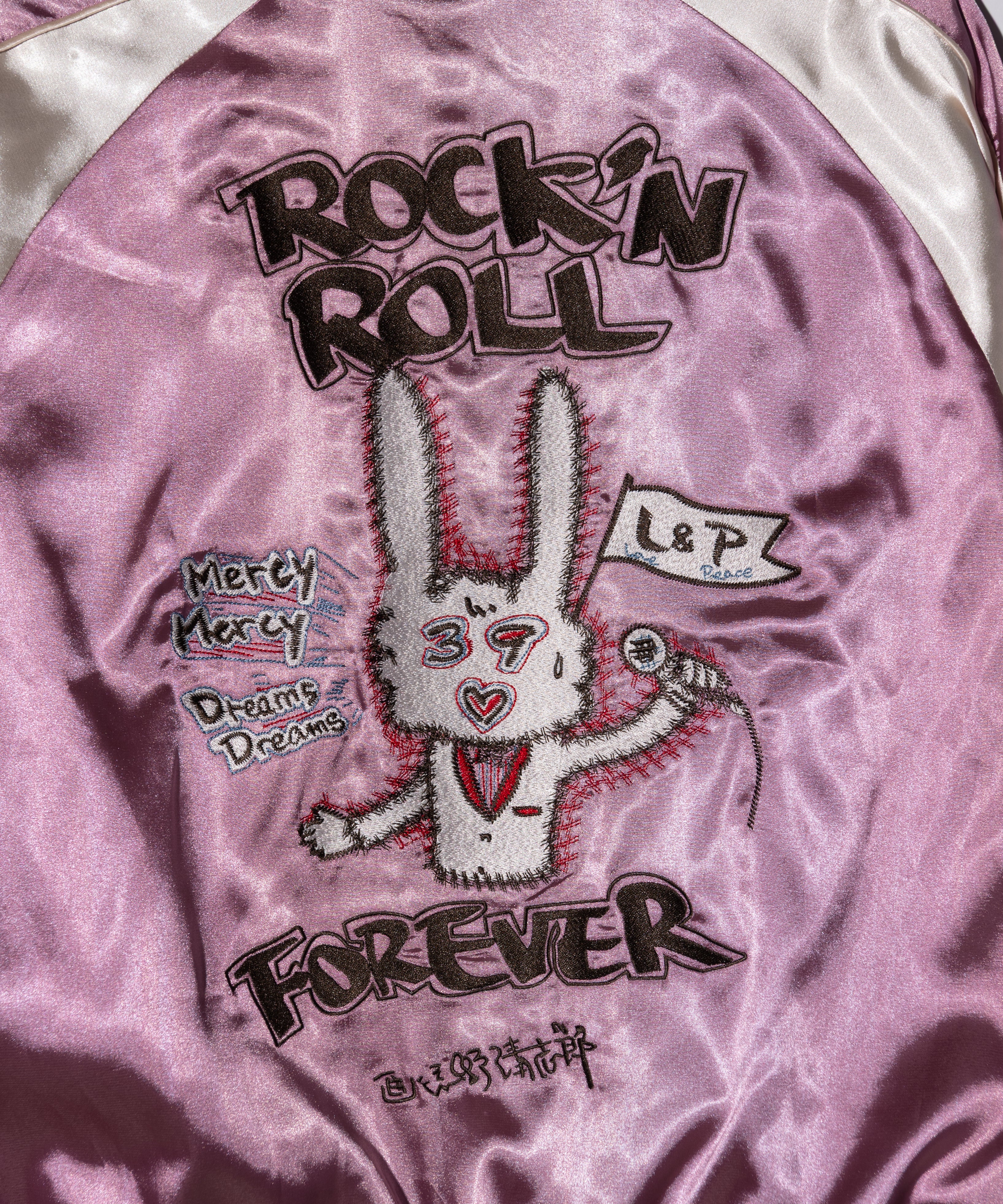 片面は艶やかなサテン生地を用いてオーセンティックなスカジャンのスタイルを踏襲しながら、身頃の前後に散りばめられたのは忌野清志郎の残したペイントの数々。後ろ身頃中央、晩年に描かれた「39!BABY」を軸としながら、すべての柄を精緻な針運びで表現。彼のピュアな音楽観を映し出しました。