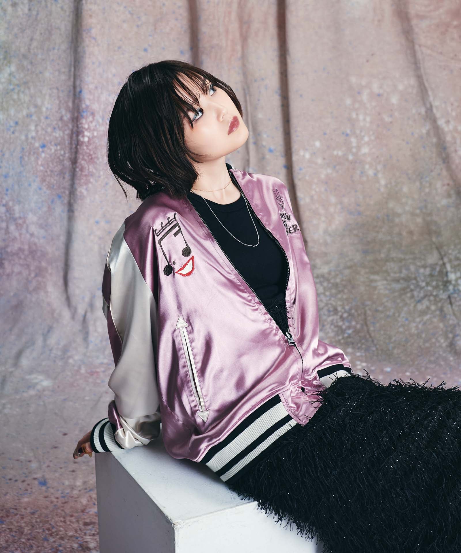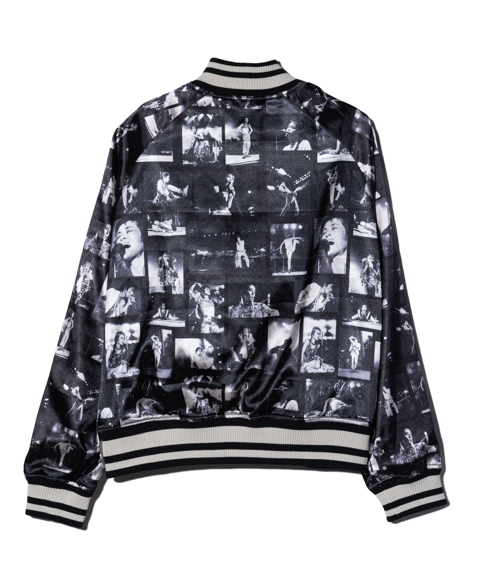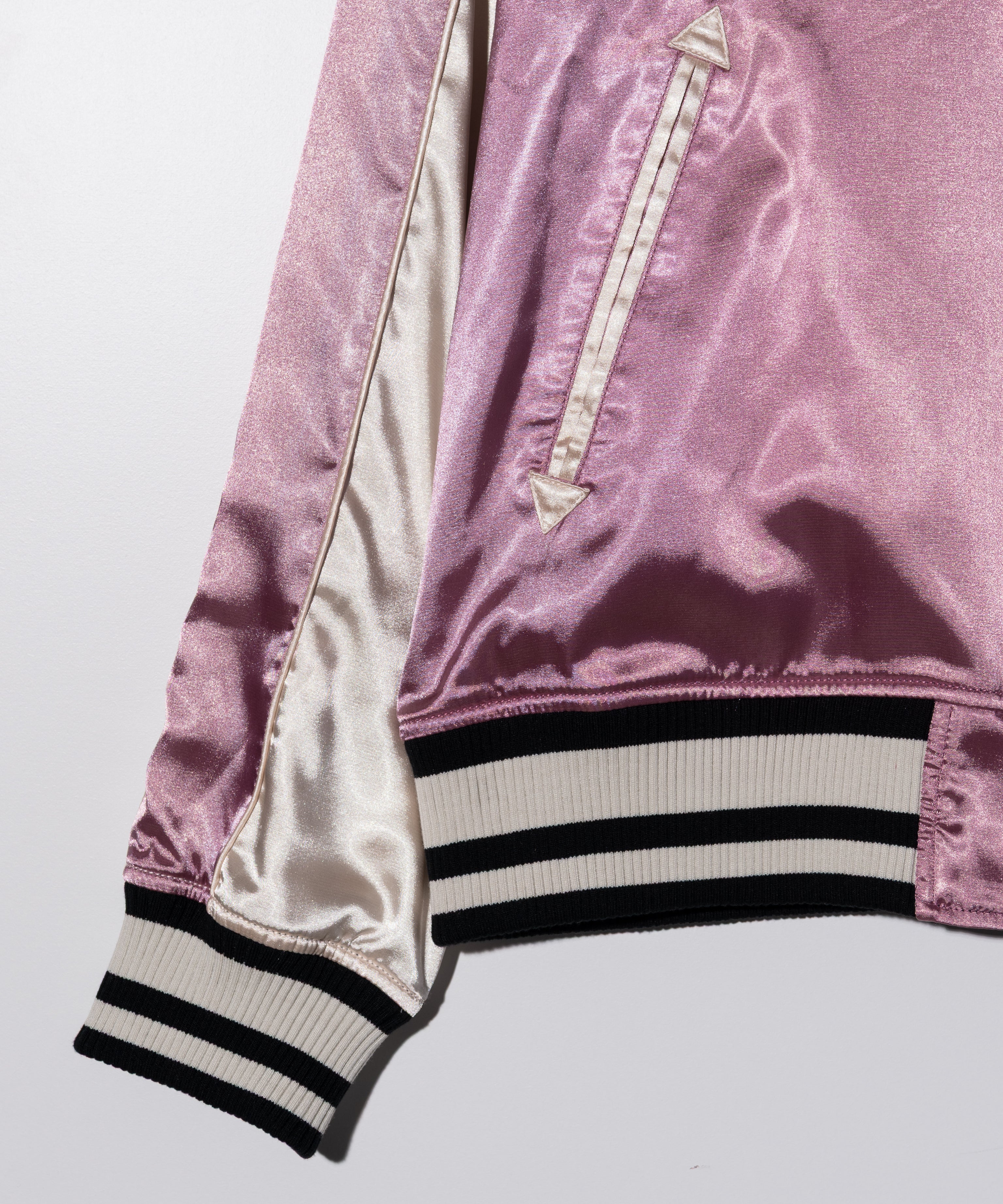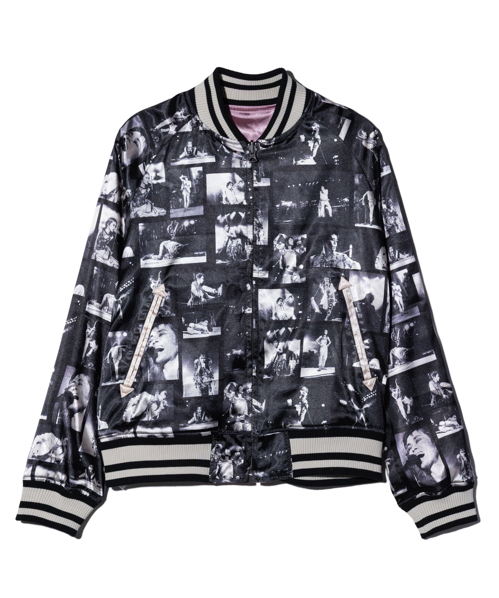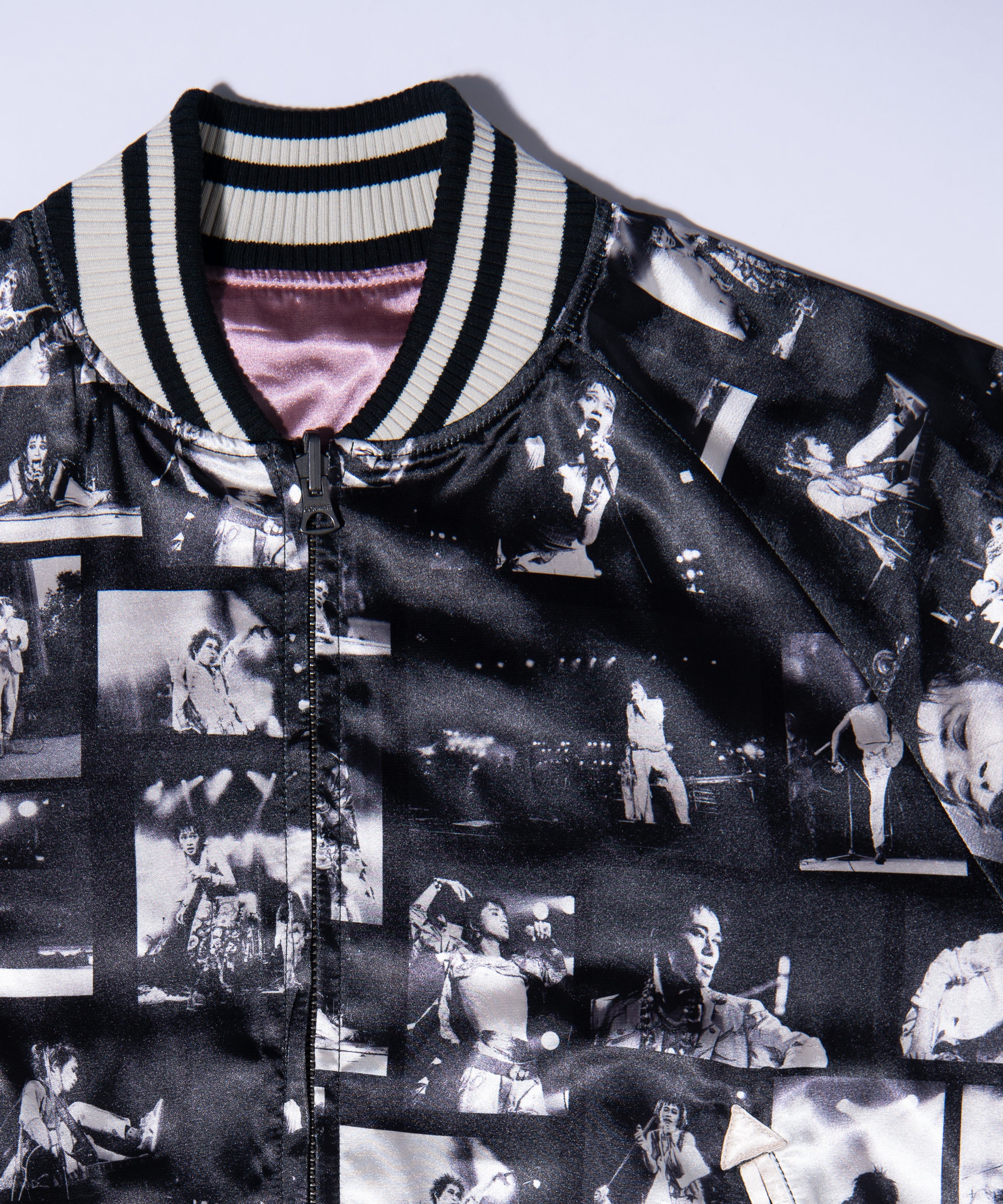 片面は艶やかなサテン生地を用いてオーセンティックなスカジャンのスタイルを踏襲しながら、身頃の前後に散りばめられたのは忌野清志郎の残したペイントの数々。後ろ身頃中央、晩年に描かれた「39!BABY」を軸としながら、すべての柄を精緻な針運びで表現。彼のピュアな音楽観を映し出しました。