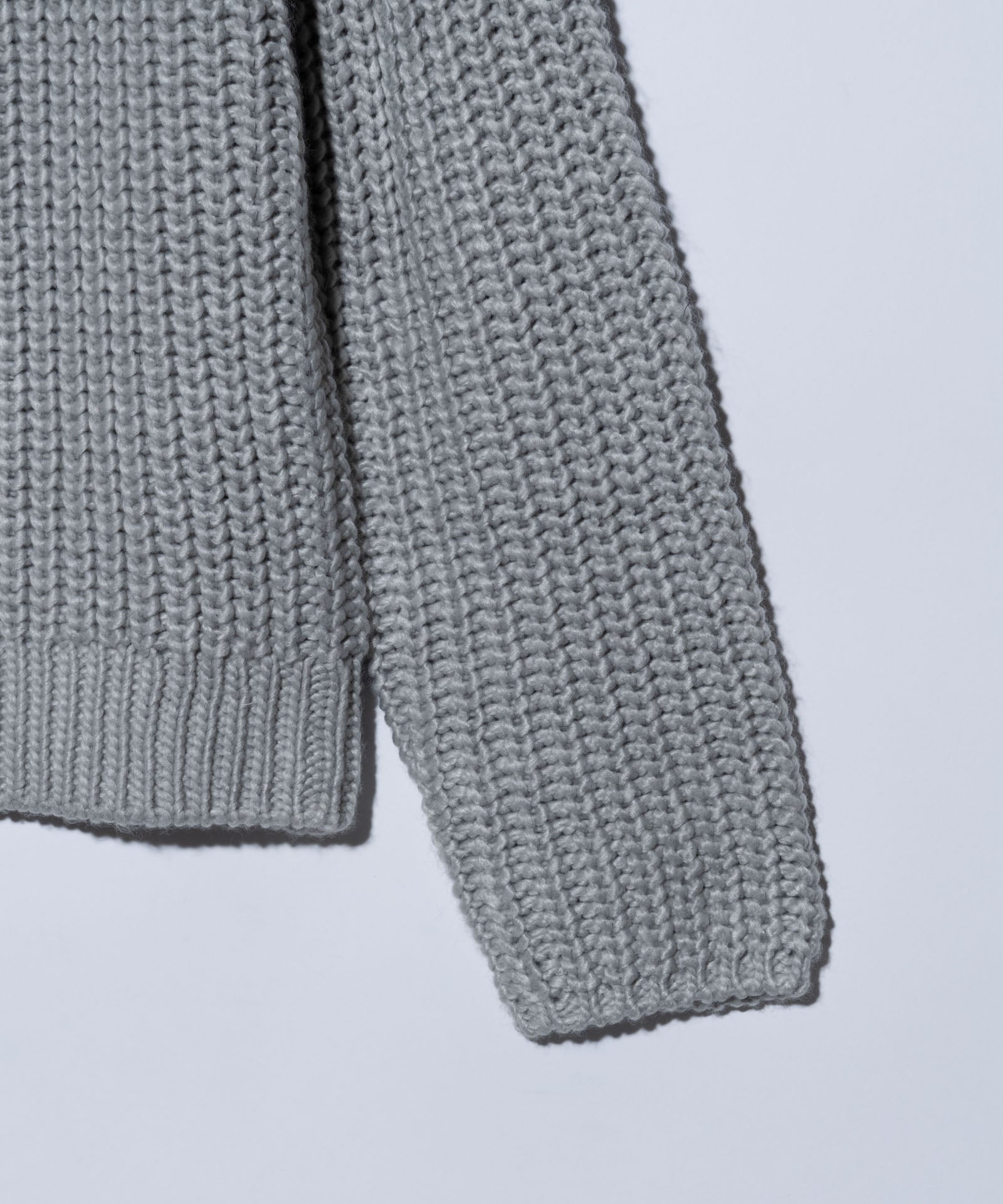 シルエットと編み技法の双方を駆使してルーズなムードを作り上げたTurtle Neck Raglan Knit。肉厚な編み地は極太のローピング糸を片畦編みしたローゲージ仕上げ。肩回りはラグランスリーブを模したパターンに編み変えることで、ミニマルなデザインの中に動きのあるニュアンスを加えています。ボディは抜け感ある広めの身幅にコンパクトな着丈を組み合わせたボックスシルエット。一見ベーシックでありながら随所に変化の効いたアレンジが今季ならではのニットスタイリングを演出します。