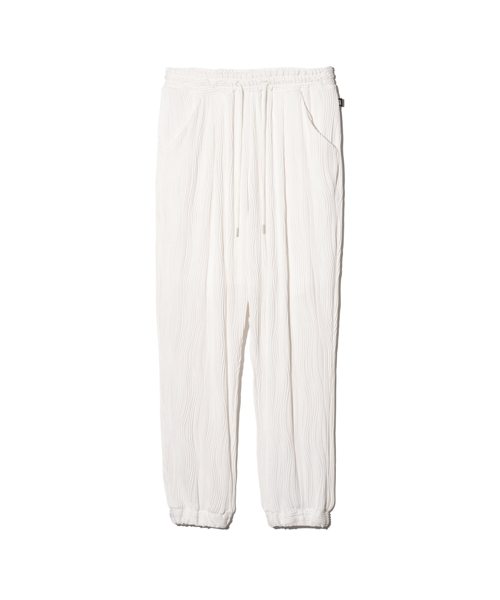 リュクスなテイストを醸し出すプリーツ使いで2025年春コレクションに好評を博したWillow Crepe Pantsが再登場。楊柳生地を思わせるプリーツ状の流線型のタックは編針で網目を作り、さらに編みを介して編地に結びつけるという手間を惜しまない工程で構築したもの。それを腰元に1タックを取ったテーパードサルエルシルエットへと落とし込んでいます。絞りを加えた裾部分は生地の目を横使いにしたものとなっており、リブの伸縮性と同生地アレンジという遊び心を兼ね揃えた仕立てに。同生地を用いたWillow Crepe CutsewやWillow Crepe Cardiganとのスタイリングにより、エレガントでイージーなムードをより一層お楽しみいただけます。