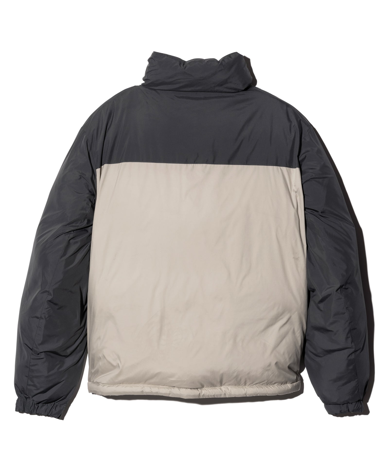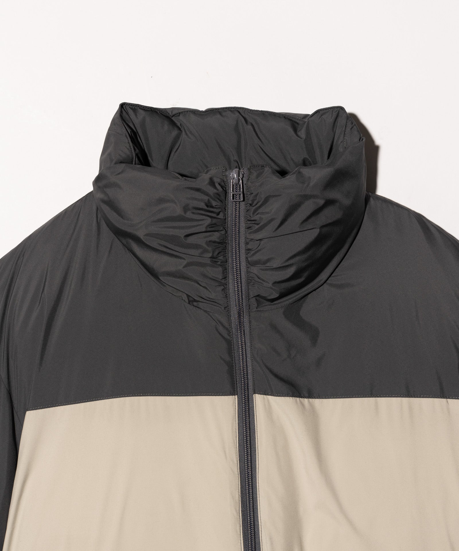 ダウンジャケットをミニマルな佇まいで提案するMonolith Down Jacket。通常、ボーダー状のキルティングを表地に、フラットな面を裏地に用いるダウンジャケットですが本作ではその表裏を逆転。全体のディテールを削ぎ落しながら、ハイネックの首元はセンターフロントにギャザーを寄せてさりげなくドレープを加えています。襟と身頃はインナーにダウン80%を使用しており高い防寒性を確保。ただタウンウェアとしては保温性が高すぎてしまうシーンがあるため、アーム部分はポリエステル綿にすることで機能を程良く調整するとともに手に取りやすいプライスも実現しています。