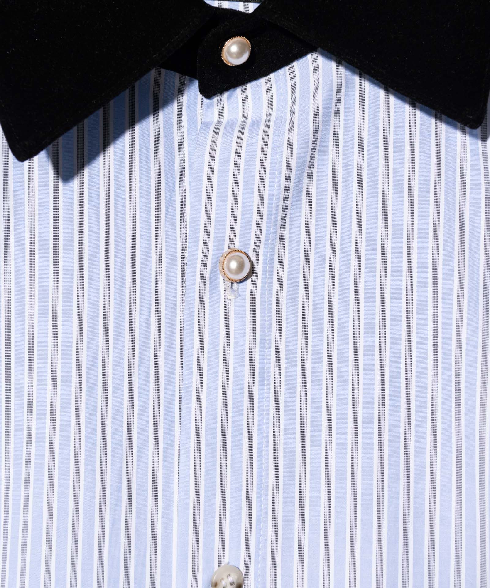 2024年冬コレクションで好評を博したVelvet Collar Shirtを新たなテキスタイル使いでお送りするNoble Velvet Collar Shirt。ベルベット生地の襟と袖口に、2つのメタルの台座を備えたイミテーションパールボタンの襟元はそのまま。今季はカラーバリエーションごとに意匠も異なる総柄生地をあしらって提案します。Whiteは陰影のあるニュアンスが際立つシャドーフラワー生地、Blueは洒脱なストライプ生地を使用。シルエットは身幅にゆとりをもたせたルーズフィッティングに仕立て上げました。