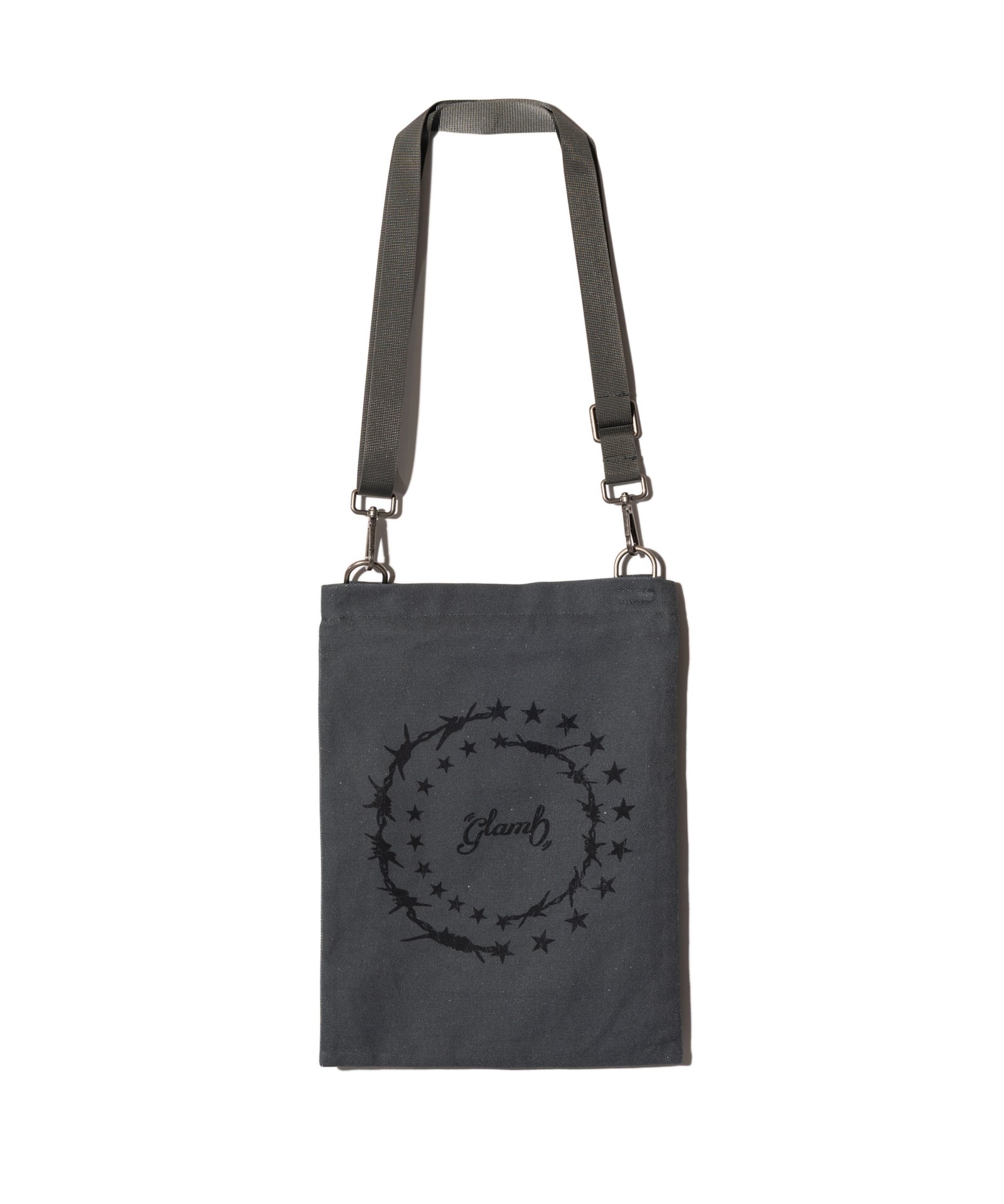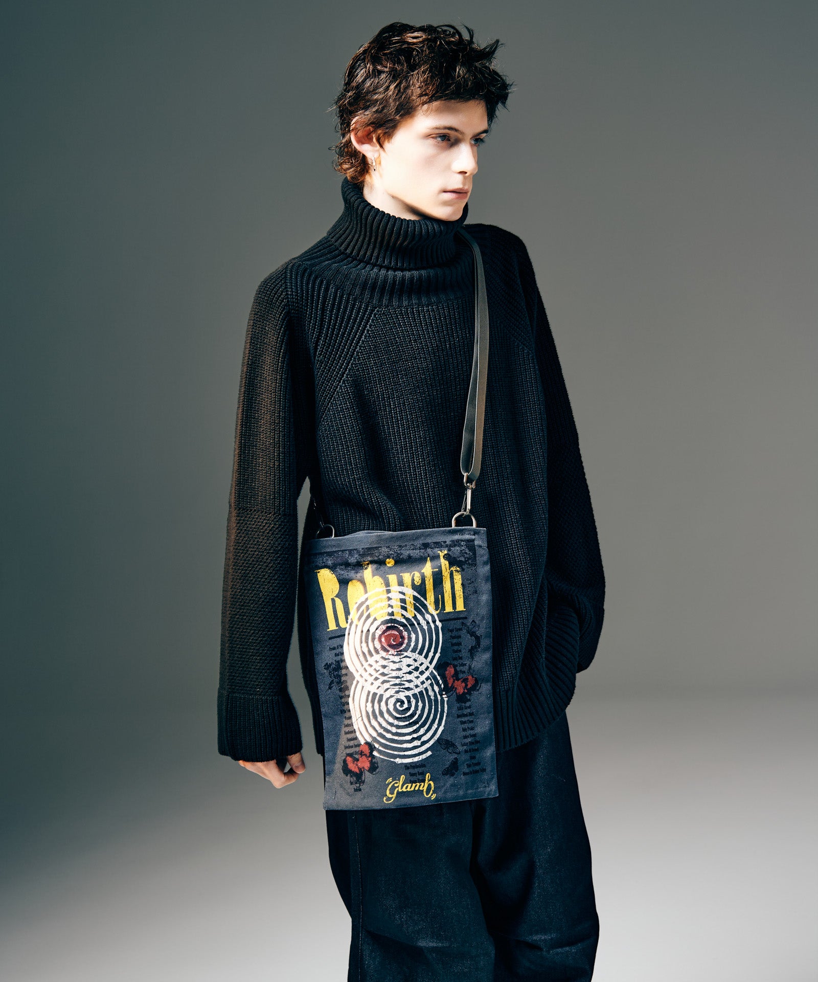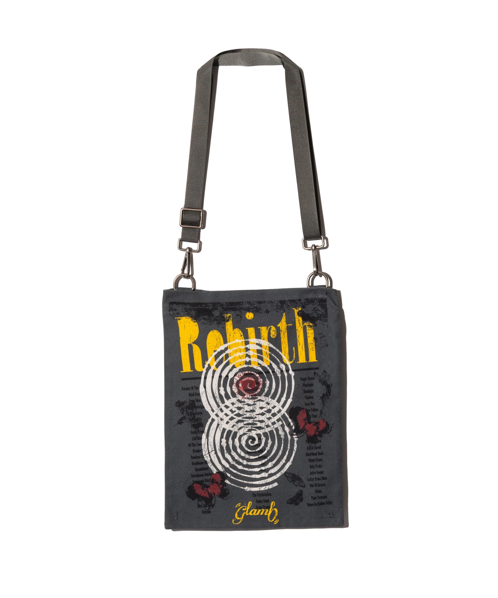 ライブポスターをショルダーバッグに仕立てるというブランドならではの着想から生まれたRebirth Shoulder Bag。本体の片面には今季のブランドのコレクションテーマを反映したグラフィックをポスターに見立てて、逆面にはブランドロゴをかたどったシンプルなデザインをプリント。スタイリングに合わせて2WAYでアレンジいただけます。サイズはA4サイズが収納可能な長方形。トートバッグタイプの形状ですが、ストラップは可動域の広い金具での取り付けにすることでデイリーユースでの取り回しを向上しています。