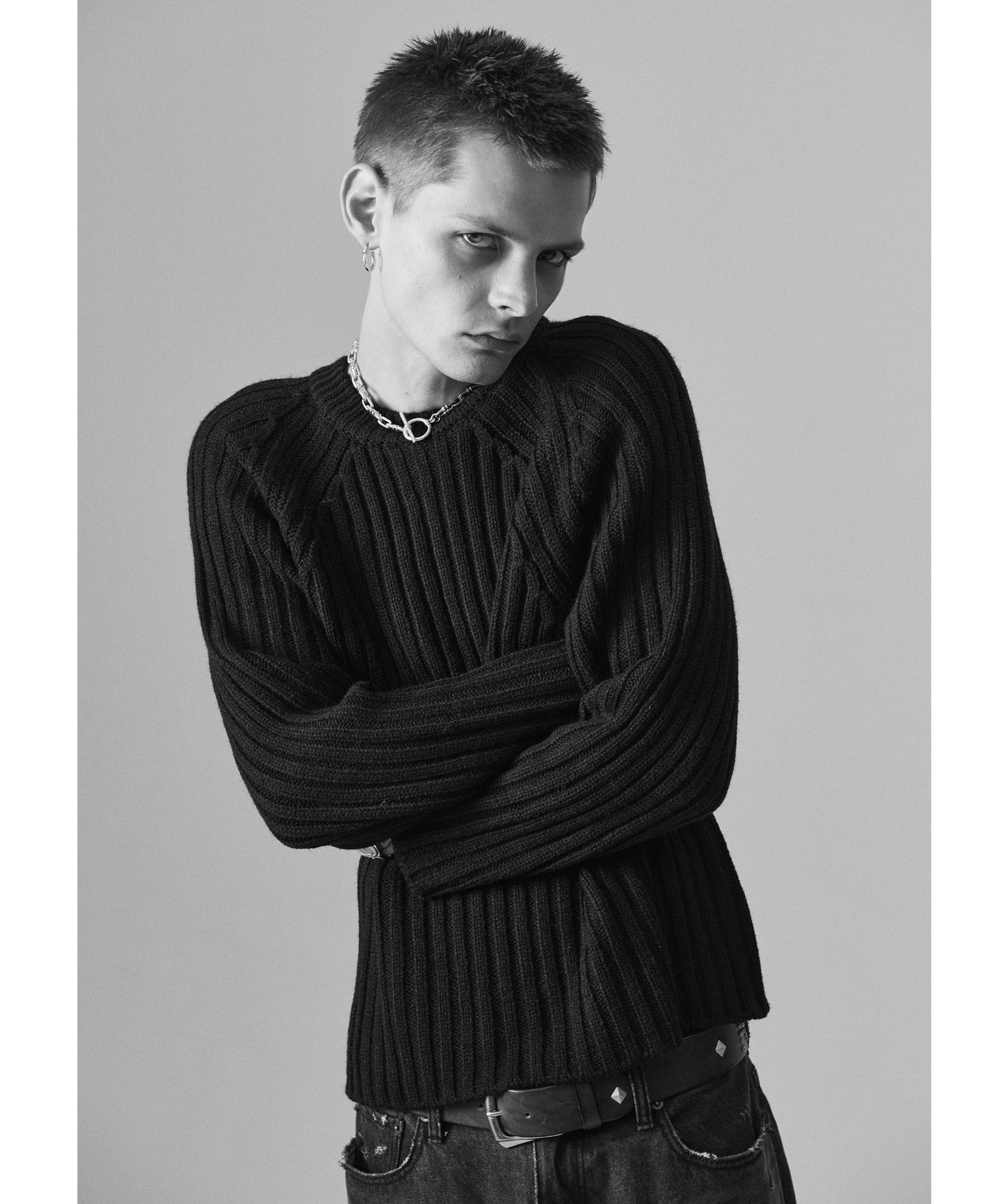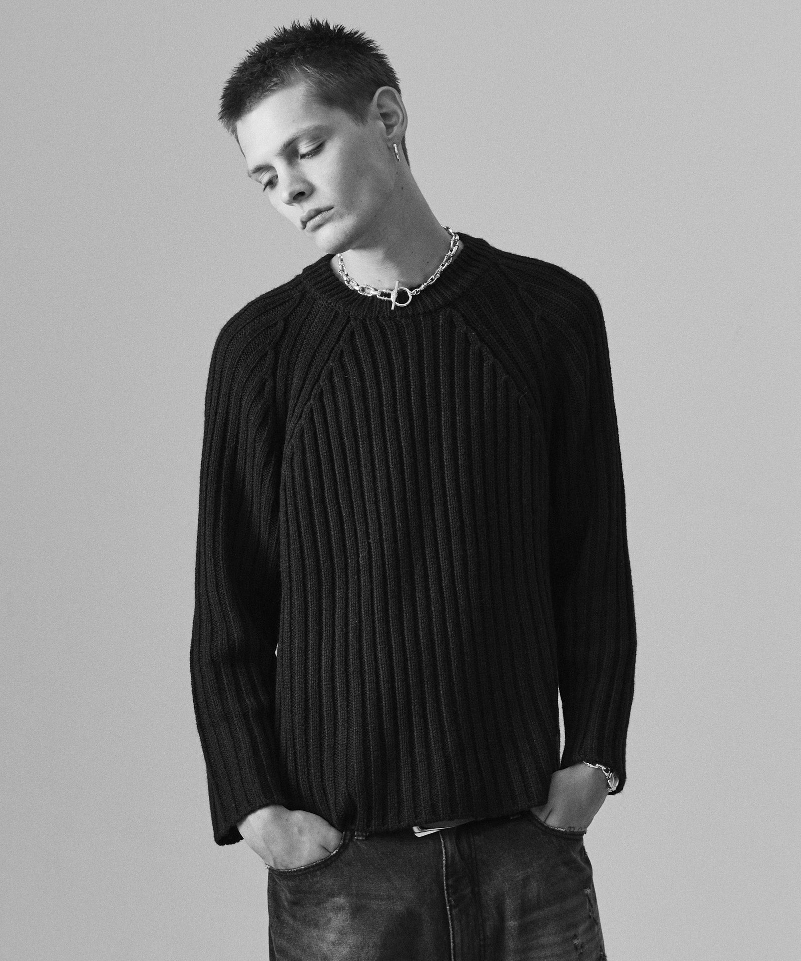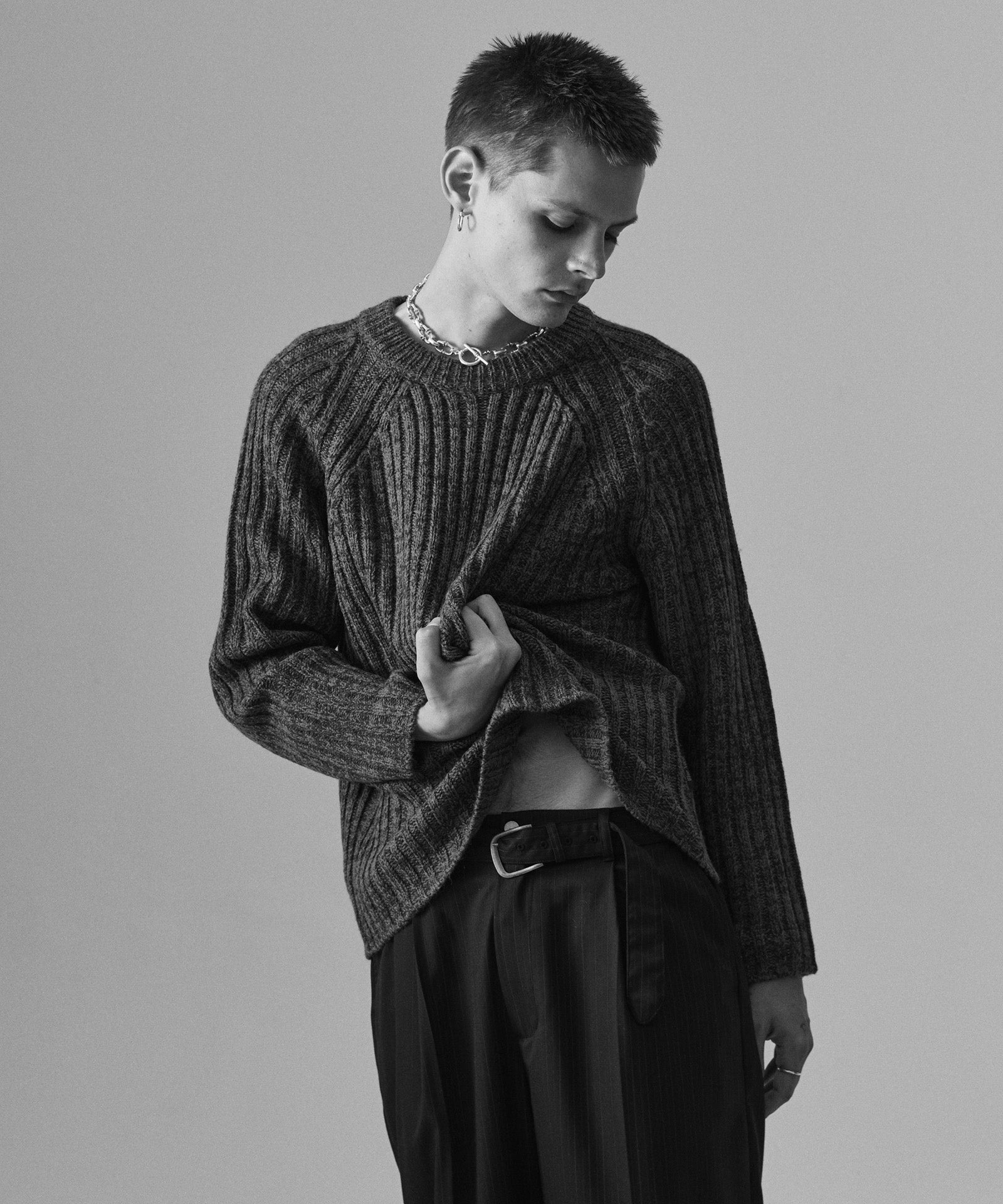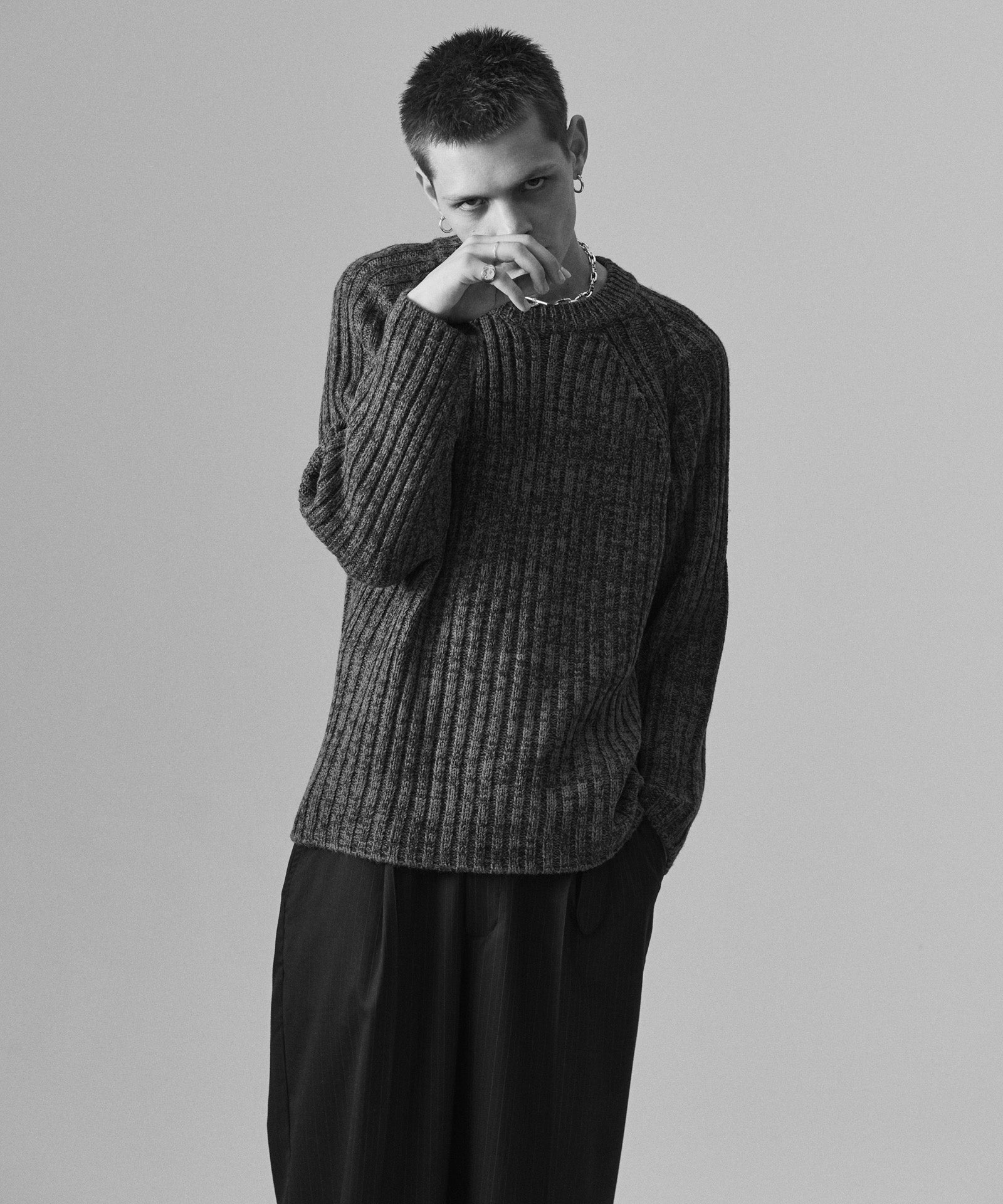 研ぎ澄まされたデザインワークがベーシックアイテムに静謐さとエッジをもたらす“Blue Noise”シリーズから、スタンダードな中にこだわりのテクスチャを乗せたBlue Noise Low Gauge Rib Knitが登場。ラグランスリーブのアームはラグラン線の目を立てることで、ボディとのコントラストあるヴィジュアルに。リブの凹凸はローゲージで編み上げることで存在感を持たせています。シルエットはややゆとりを持たせたボックスシルエットに設定。カラーバリエーションは定番のWhiteとBlackに加え、色違いの糸を引き揃えて杢の色目を持たせたBrownをご用意しております。