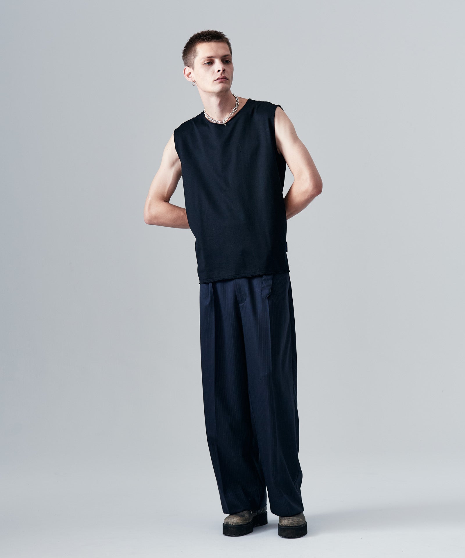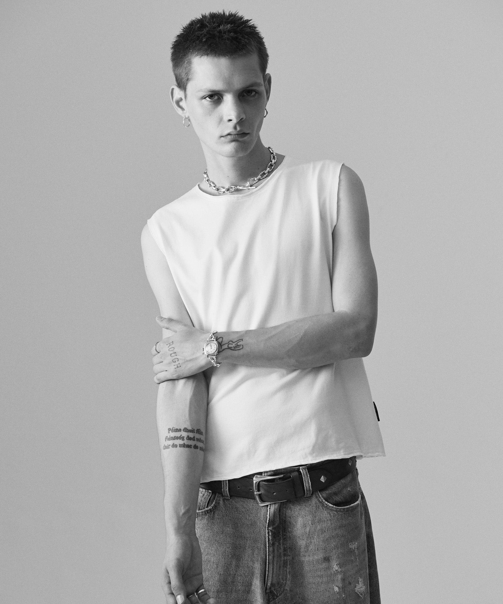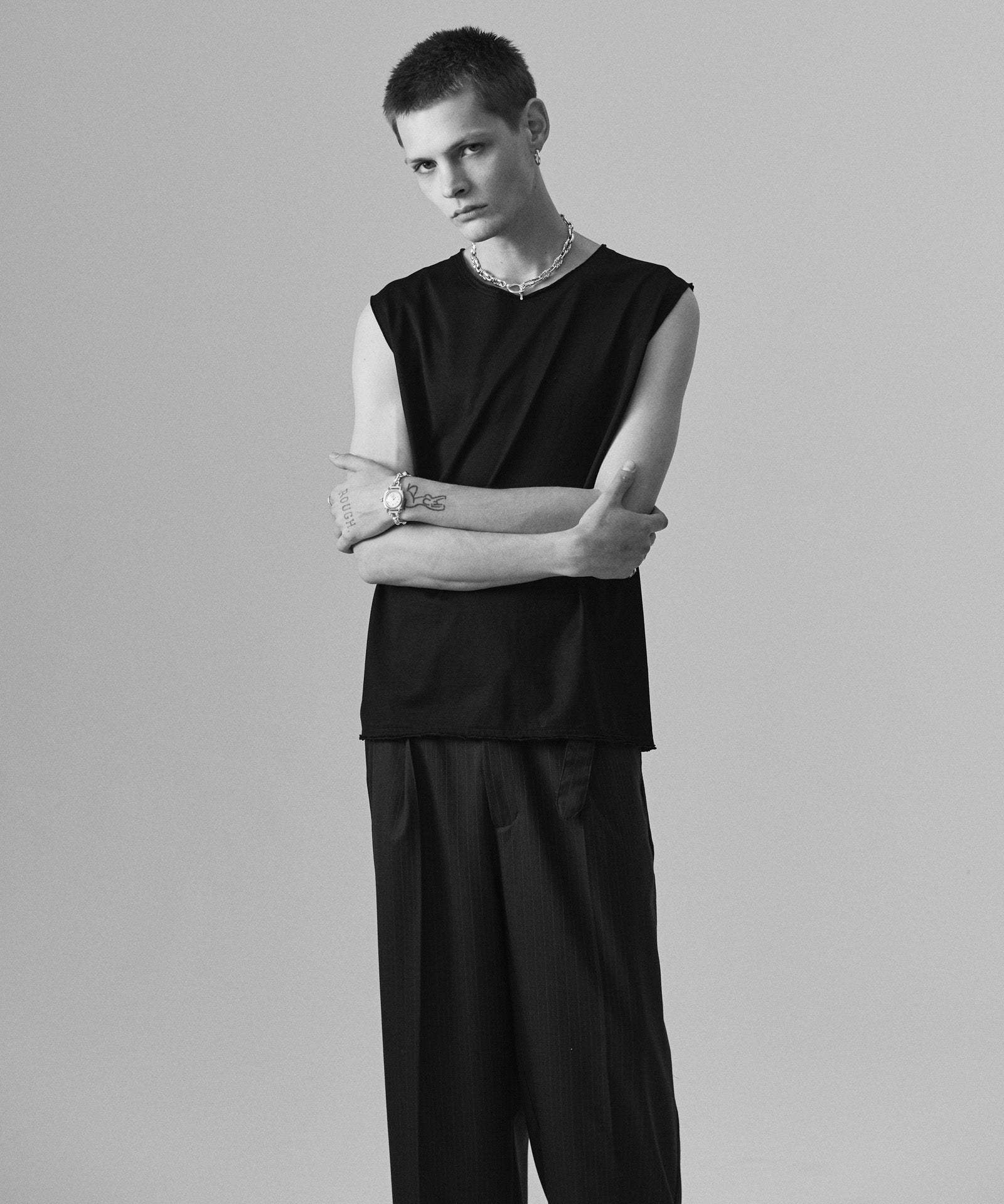 “Blue Noise”ラインから登場するBlue Noise Premium Grade Sleeveless T-Shirtは静謐さとエッジを兼ね揃えた佇まいの中に贅沢な素材使いを落とし込んだ1枚。テキスタイルに用いたのは最高級綿であるスーピマコットンを素材に国産され、上品な輪郭を形作る強いハリとシルクのようなテクスチャを併せ持つハイグレードカットソー生地、「ITADAKI」。毛羽立ちが少なく光沢をもった素材を太番手の32/2番手の糸に紡いだ後、より一層の光沢をもたらすため糸段階でガス焼きとシルケット加工。糸を生地に編み下げてからもバイオや強シルケット、キックバックを強める特殊柔軟といった幾種もの加工を繰り返すことで、肉厚でありながら絹のようにきらめく極上の風合いに仕上げられています。ジャストフィットのノースリーブに仕立てられたボディは、首周りとアームホール、裾を天竺ロールで仕上げてルーズなニュアンスとともにグランジ的なムードを表現。肩線を後ろにずらしてフロントデザインをシームレスに、バックスタイルでもヨークを二重にすることでタグのステッチを隠すなど、生地のテクスチャを妨げるノイズを払拭する仕立てを随所に施しています。
