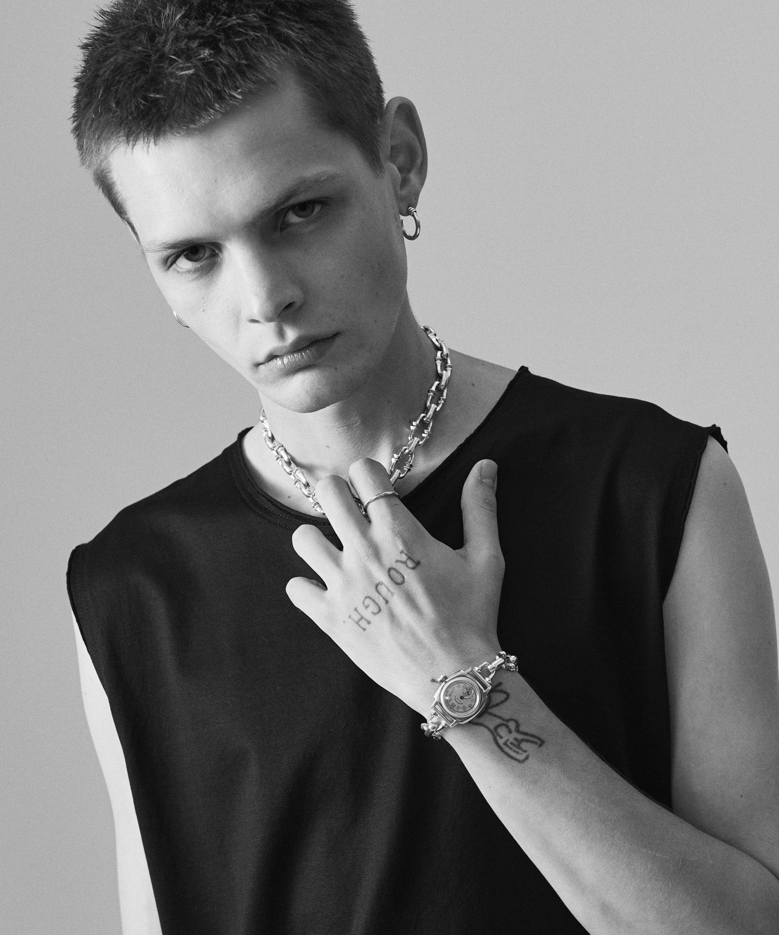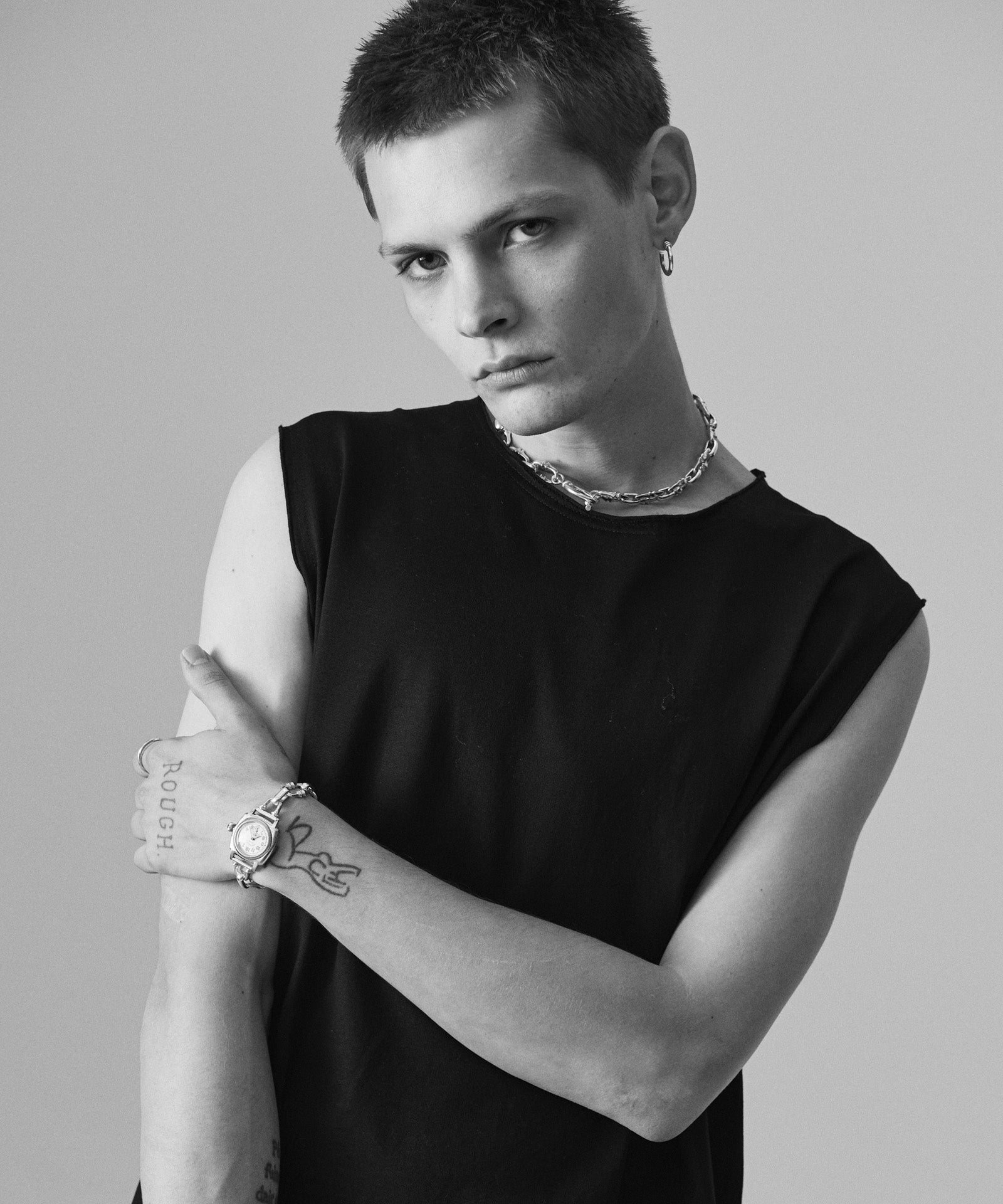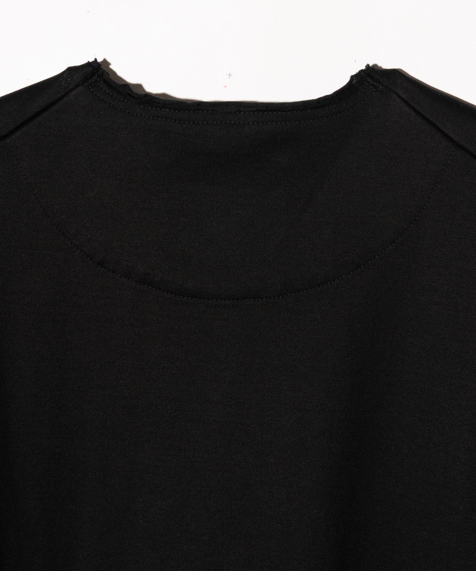 “Blue Noise”ラインから登場するBlue Noise Premium Grade Sleeveless T-Shirtは静謐さとエッジを兼ね揃えた佇まいの中に贅沢な素材使いを落とし込んだ1枚。テキスタイルに用いたのは最高級綿であるスーピマコットンを素材に国産され、上品な輪郭を形作る強いハリとシルクのようなテクスチャを併せ持つハイグレードカットソー生地、「ITADAKI」。毛羽立ちが少なく光沢をもった素材を太番手の32/2番手の糸に紡いだ後、より一層の光沢をもたらすため糸段階でガス焼きとシルケット加工。糸を生地に編み下げてからもバイオや強シルケット、キックバックを強める特殊柔軟といった幾種もの加工を繰り返すことで、肉厚でありながら絹のようにきらめく極上の風合いに仕上げられています。ジャストフィットのノースリーブに仕立てられたボディは、首周りとアームホール、裾を天竺ロールで仕上げてルーズなニュアンスとともにグランジ的なムードを表現。肩線を後ろにずらしてフロントデザインをシームレスに、バックスタイルでもヨークを二重にすることでタグのステッチを隠すなど、生地のテクスチャを妨げるノイズを払拭する仕立てを随所に施しています。