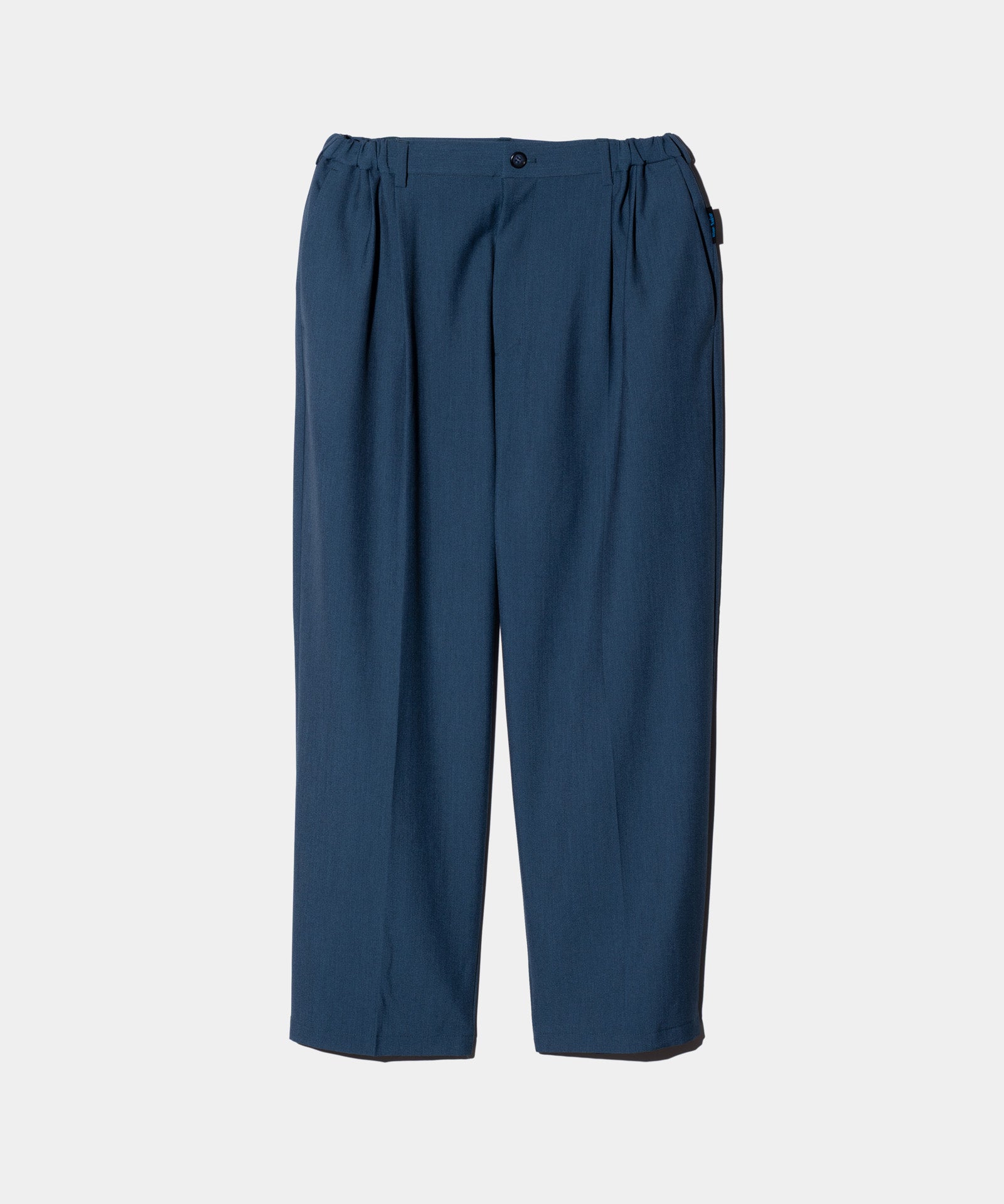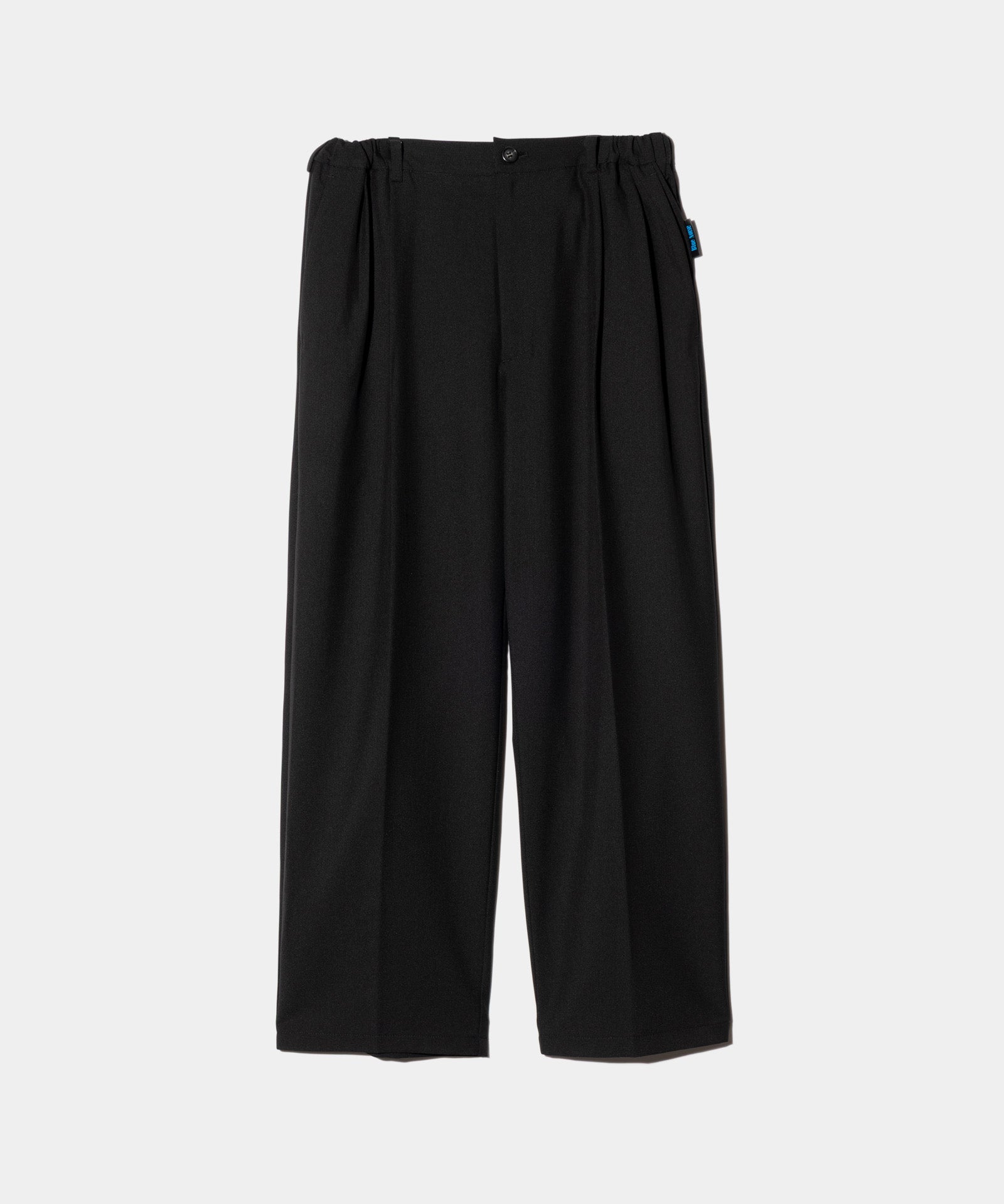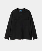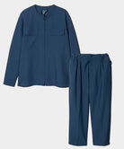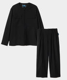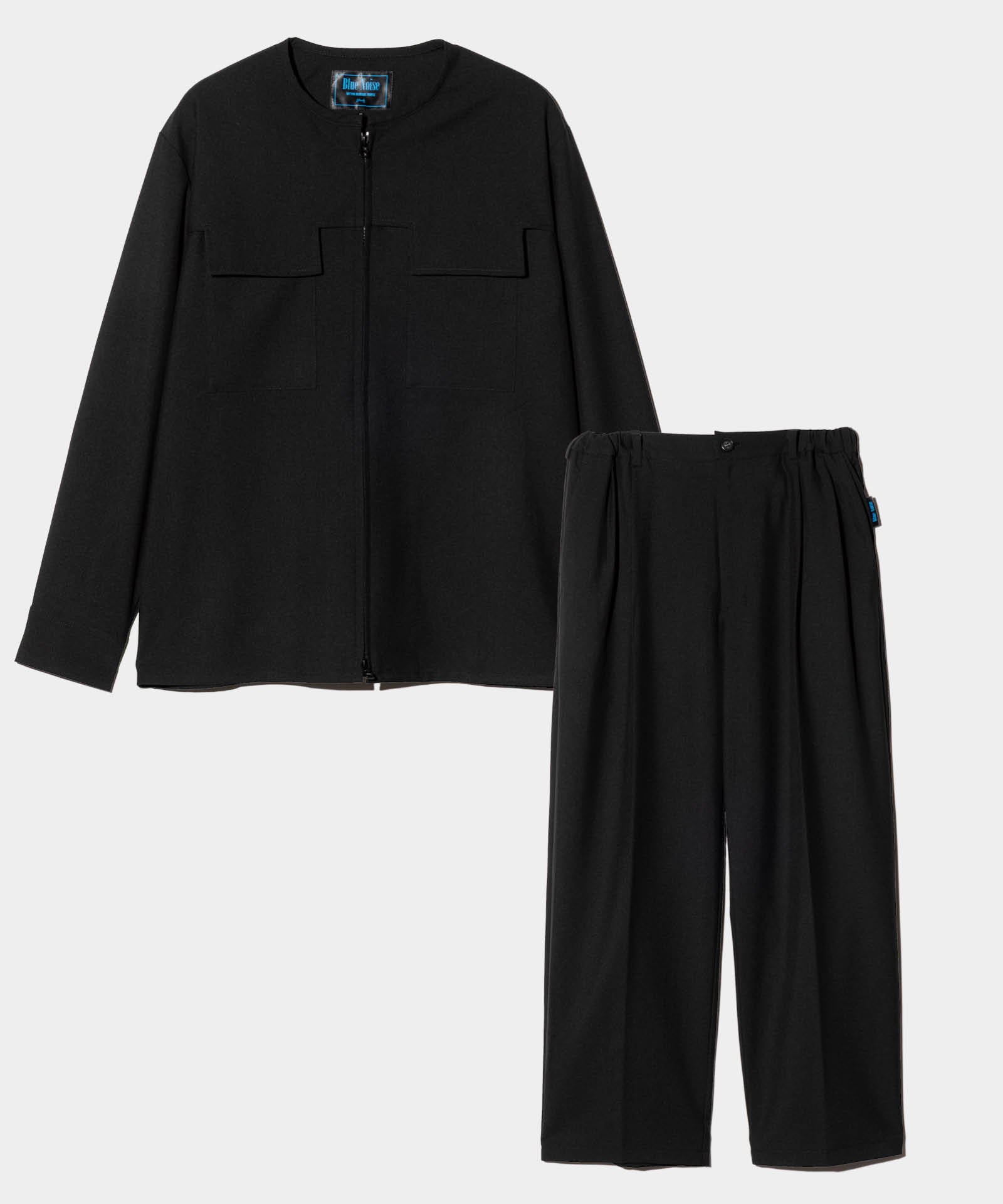 ベーシックアイテムにglambならではの自由な発想を掛け合わせ、静謐さとエッジを兼ね揃えたスタイルを提案する“Blue Noise”ライン、そのムードを素材とカッティングの両面で体現するBlue Noise Minimal Shirt Set Up。張りのあるスーツ生地を用いたボディはノーカラー仕立てのオーバーサイズシルエット。肩回りから伸びる幾何学的なパーツはポケットの位置までかかって騙し絵のような効果を演出。ボタン留めでなくダブルジップをあしらった前身の合わせもシャツかアウターかの境を曖昧にするアクセントとなっています。ボトムスは腰元に4タックを取ったエアリーなワイドテーパードシルエット。ウエストのゴム仕様はサイドのみにレイアウトしており、タックインした時に前後からの見え方をすっきりとまとめます。テキスタイルにはハリと落ち感を備えたTR生地を使用。イージーでありながらどこかドレッシーな佇まいは、オールシーズンご着用いただけます。