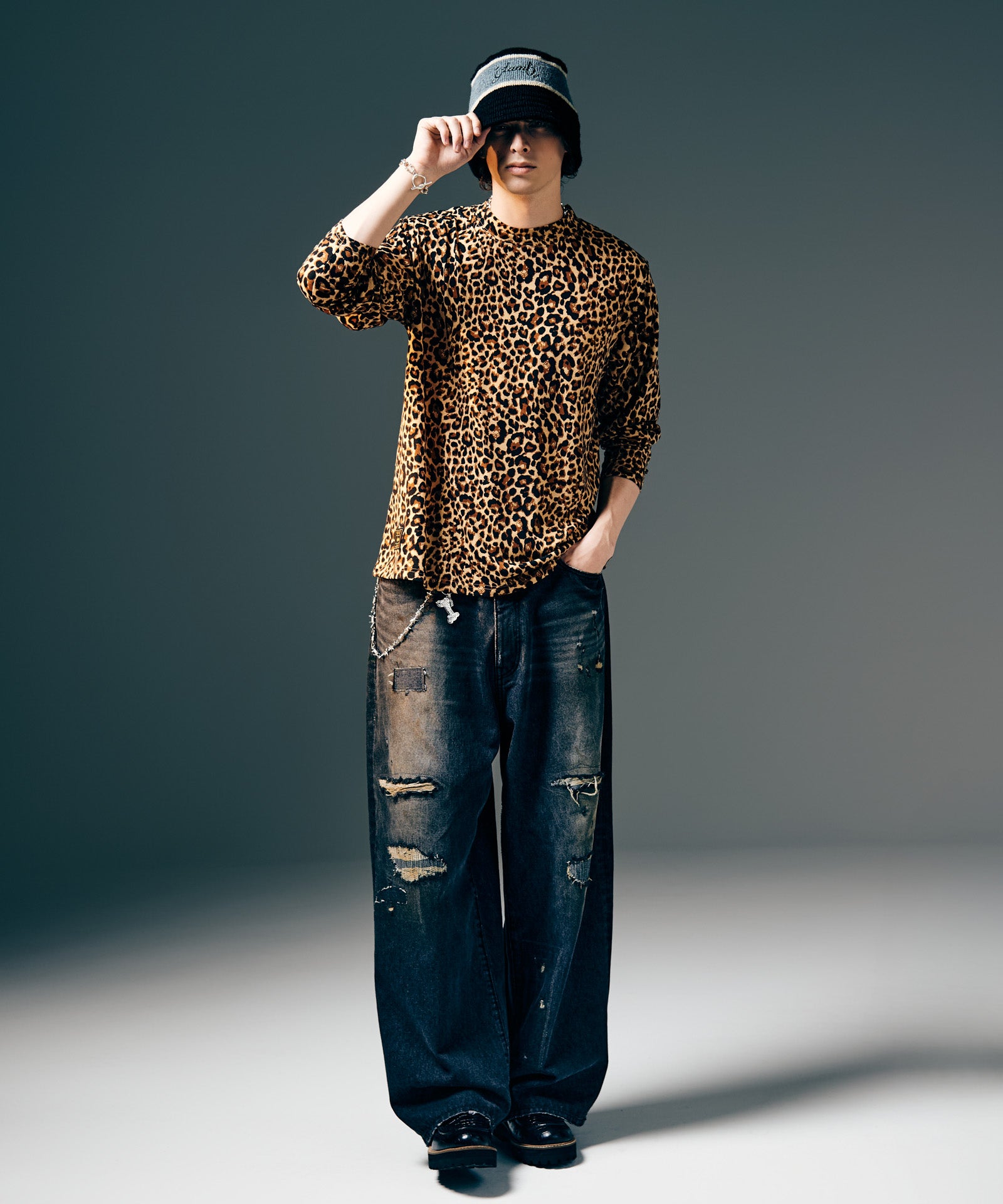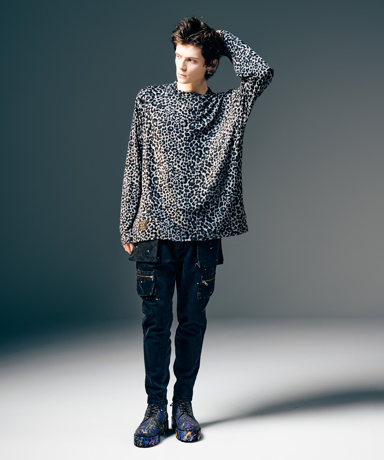 ロックスタイルのアイコンを今冬のストリートスタイルへ提案するLeopard Mock Neck Cutsew。ボディはモックネックを設けたインテリジェントある仕立てながら、それとコントラストを見せるのが大胆なレオパード総柄。単体着用でトップススタイルにエッジィなムードをまとわせる他、緻密なバランスに設計されたルーズシルエットはインナー使いした際にさり気なく柄を覗かせます。テキスタイルには通気性と保温性を兼ね備えた生地を使用、秋冬はもちろん春先までシーズンをまたいで着用いただけるスペックとなっております。