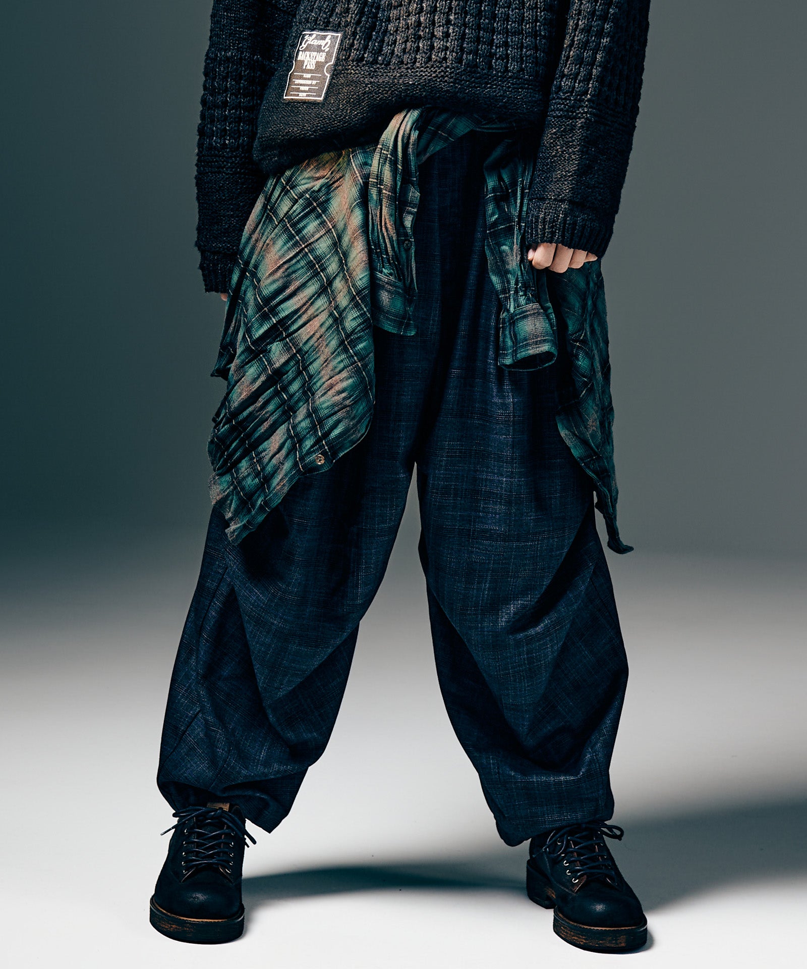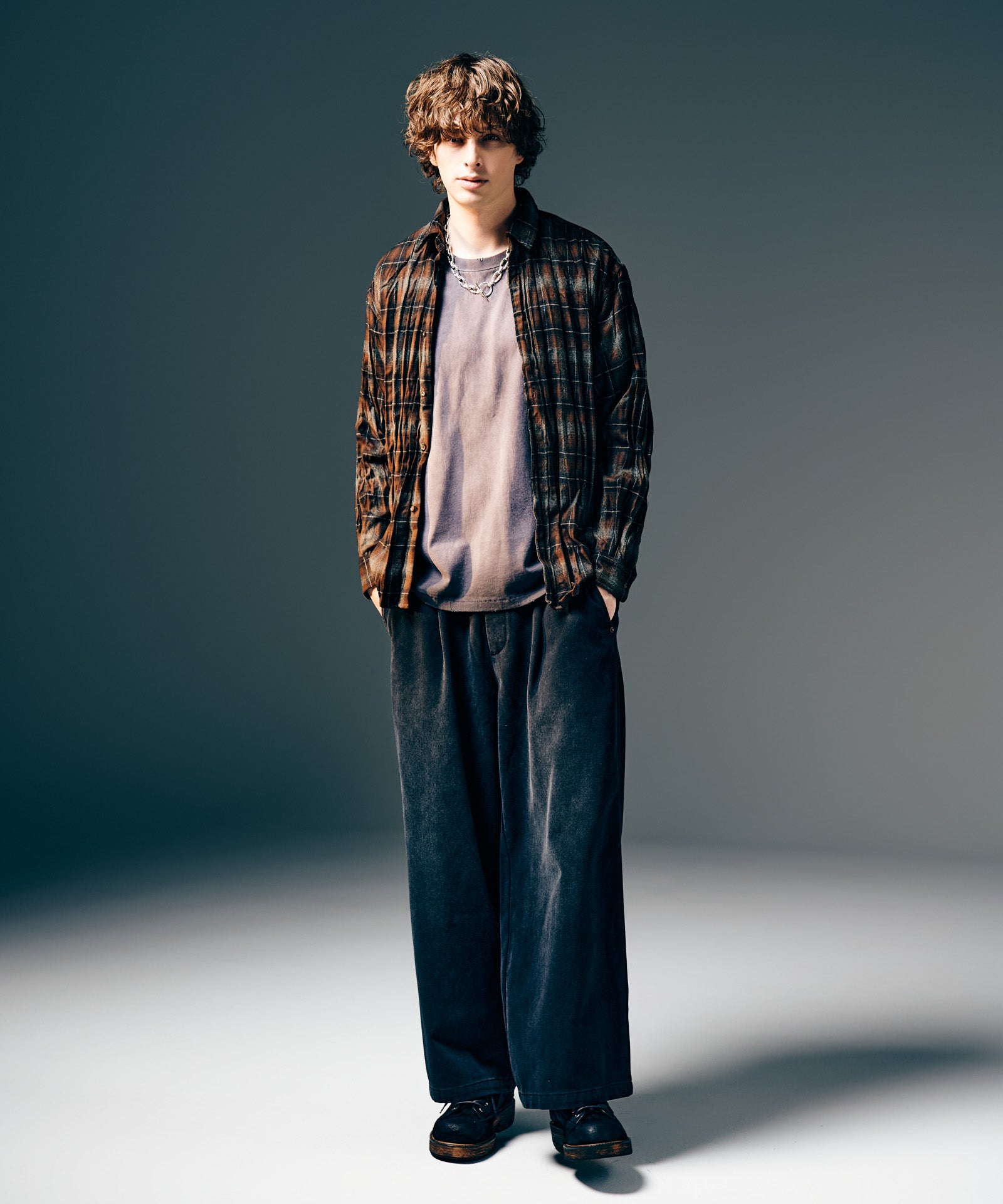 ユーズドアイテムに見られる経年変化を素材加工でデザインに昇華、glambならではのグランジルックへとまとめあげたWrinkle Flannel Shirt。フランネルシャツをベースにしながら新たなスタイリング提案を込めたのはその加工仕上げ。ボディ縫製後に溶剤に付け込んで形状記憶させた皺は、着古されたシャツの姿を寓話的に表現するとともに、アイロンフリーで着用できる手軽さも備えます。シルエットは縮みが加えられた状態でもオーバーサイズとなるようパターン段階からサイジング。春先には腰巻きなどアクセサリー感覚でスタイリングにプラスワンするのもおすすめです。