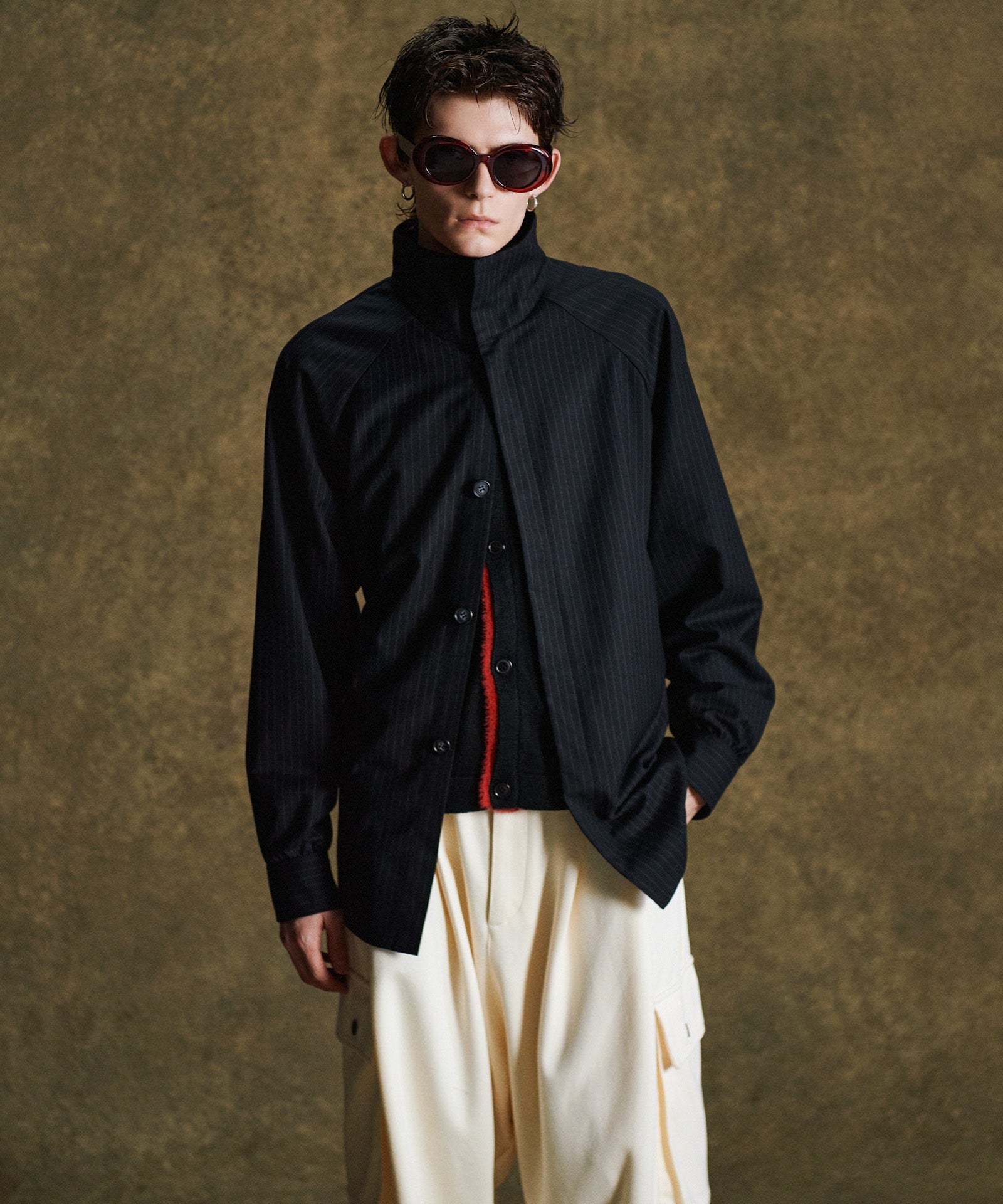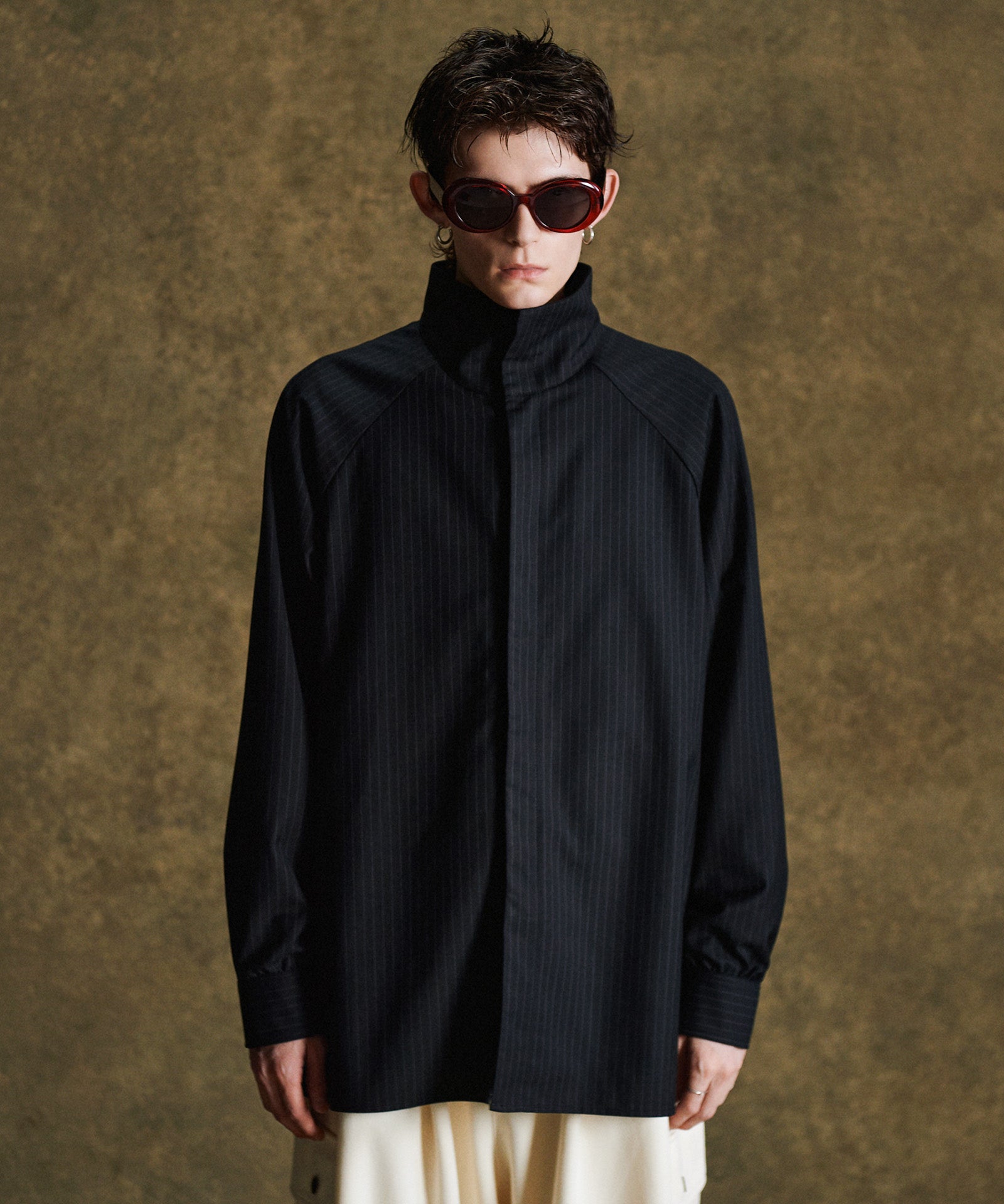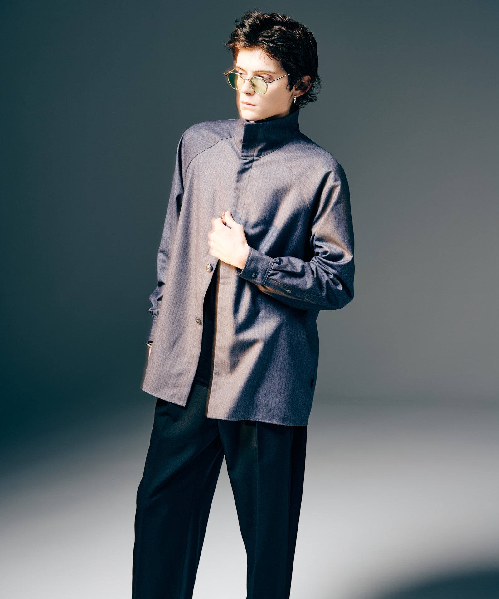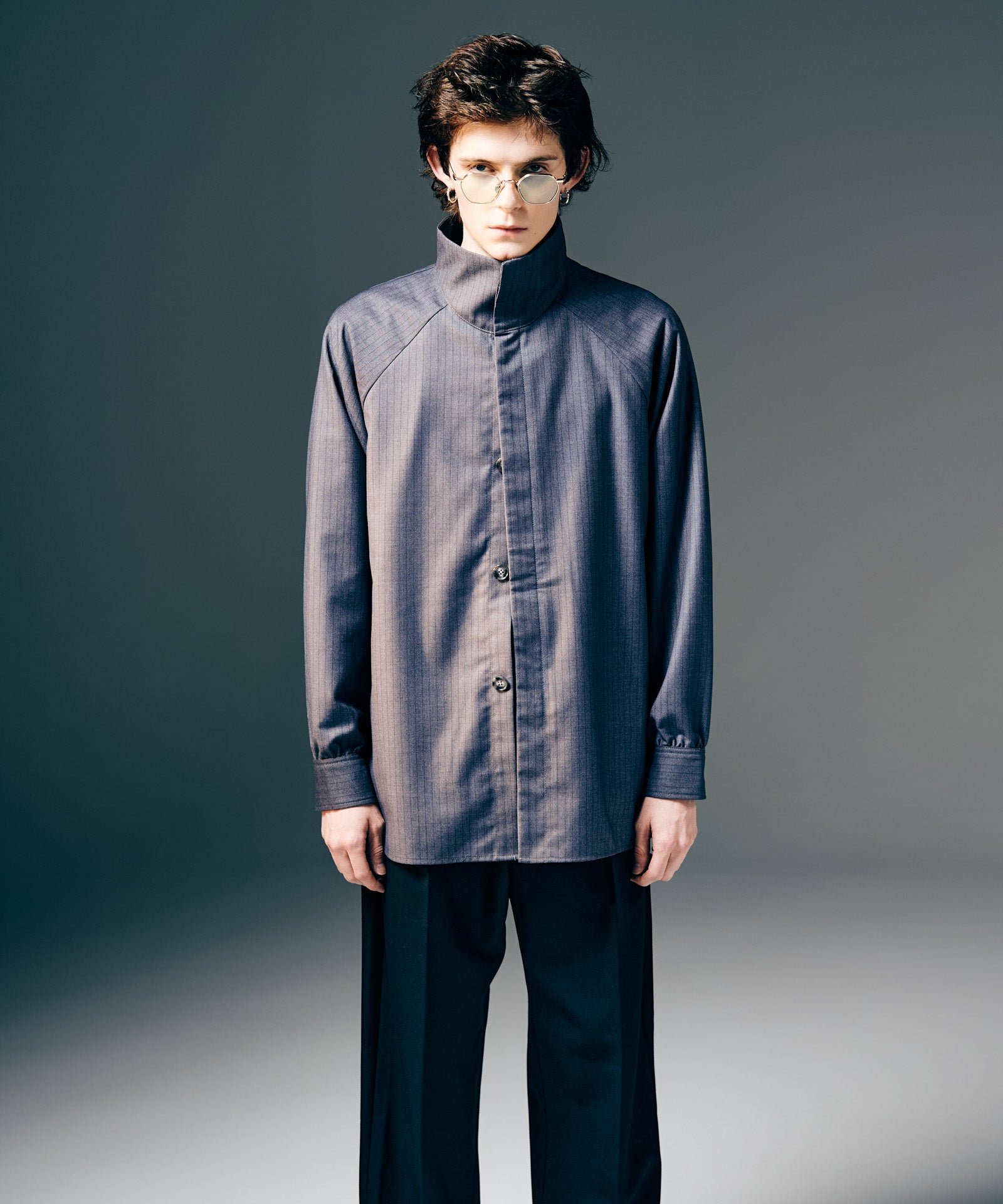 立体感のあるシルエットメイキングによって外套を思わせるミニマルな意匠を形にしたSuit Fabric High Neck Shirt。比翼を顎位置まで高く設けたハイネックのボディは、テキスタイルにストライプ生地を使用。ラグランスリーブとなった袖でストライプの流れが変化し、シンプルなヴィジュアルの中に印象的な動きをもたらします。シルエットは程よくゆとりを持たせた身幅にロング丈を組み合わせたIライン仕立て。独創的なシンプルネスが既存のトレンドに捉われない自由なスタイリングを生み出します。