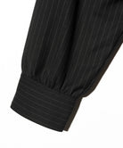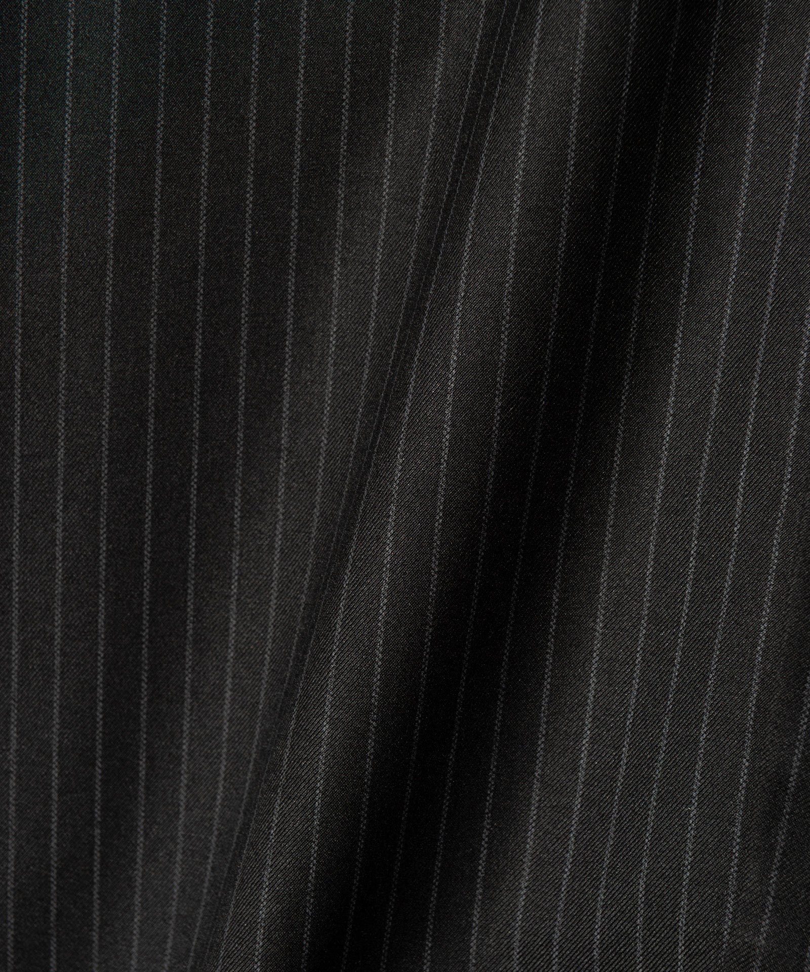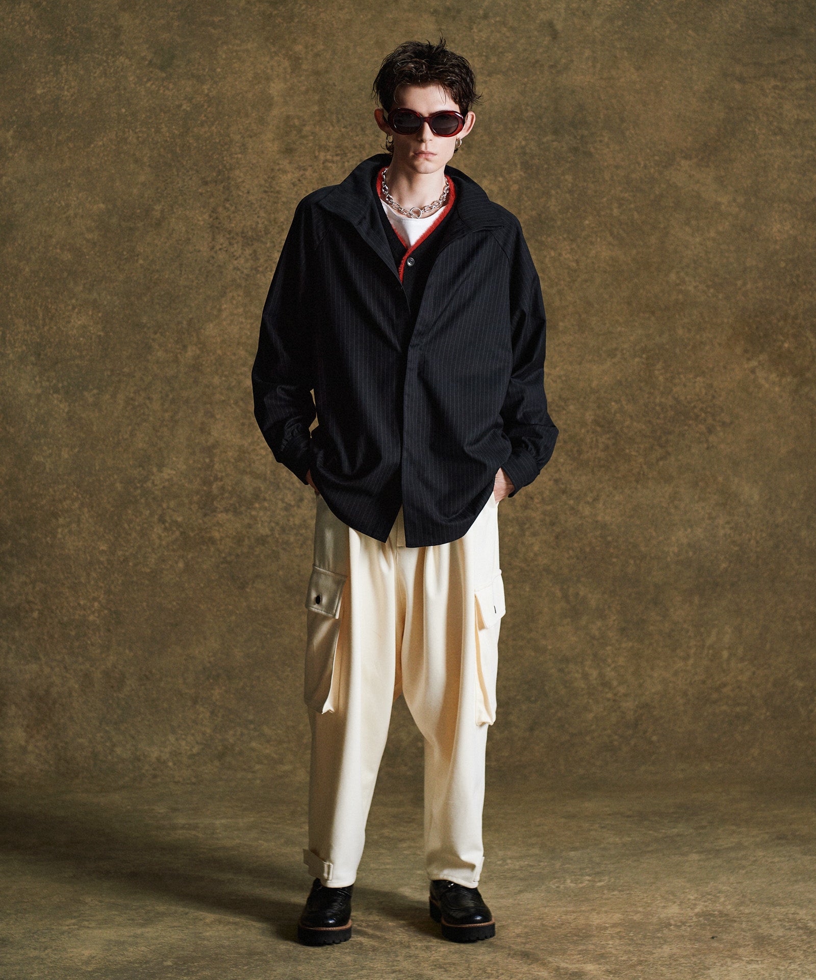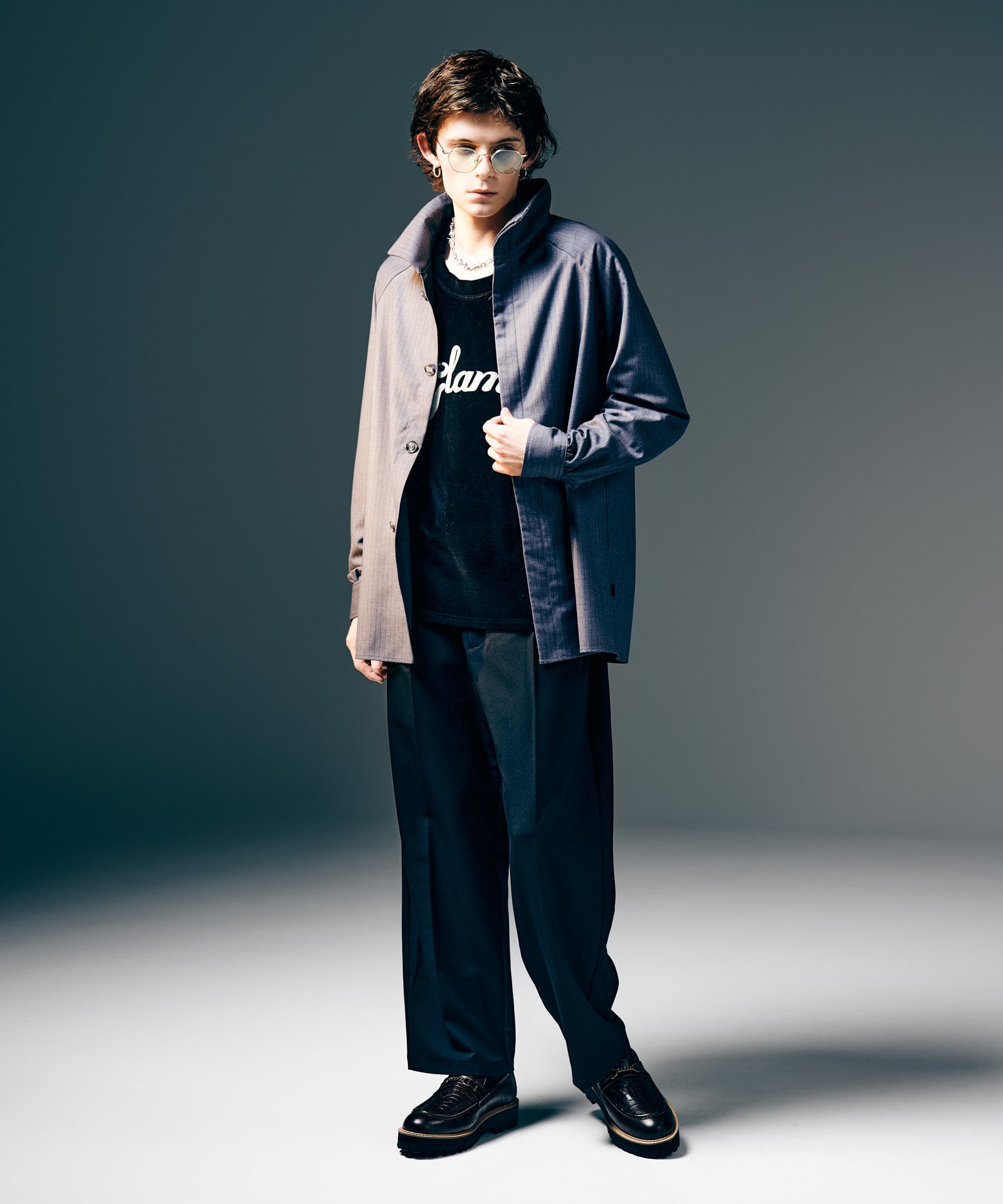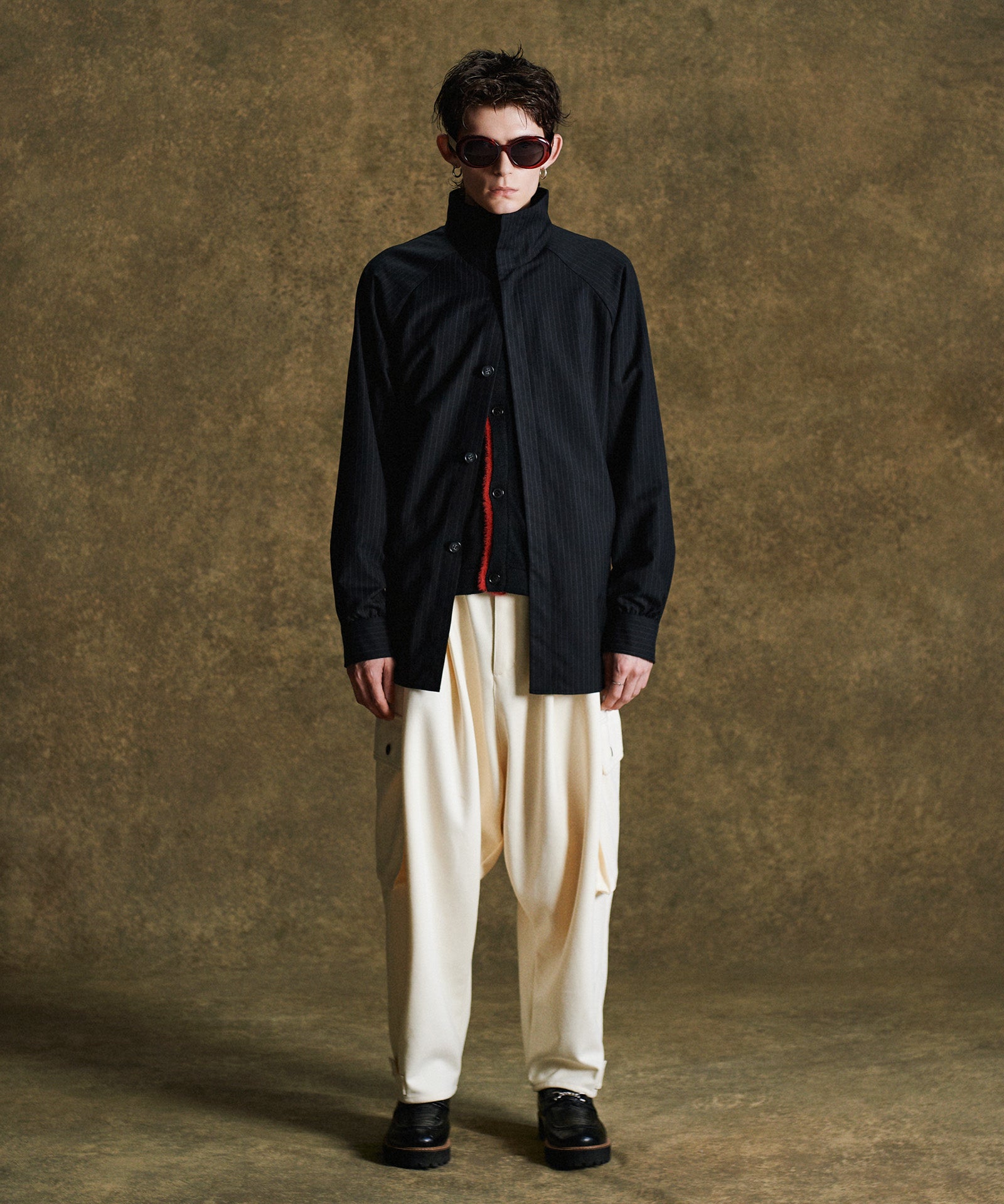 立体感のあるシルエットメイキングによって外套を思わせるミニマルな意匠を形にしたSuit Fabric High Neck Shirt。比翼を顎位置まで高く設けたハイネックのボディは、テキスタイルにストライプ生地を使用。ラグランスリーブとなった袖でストライプの流れが変化し、シンプルなヴィジュアルの中に印象的な動きをもたらします。シルエットは程よくゆとりを持たせた身幅にロング丈を組み合わせたIライン仕立て。独創的なシンプルネスが既存のトレンドに捉われない自由なスタイリングを生み出します。