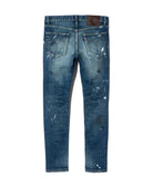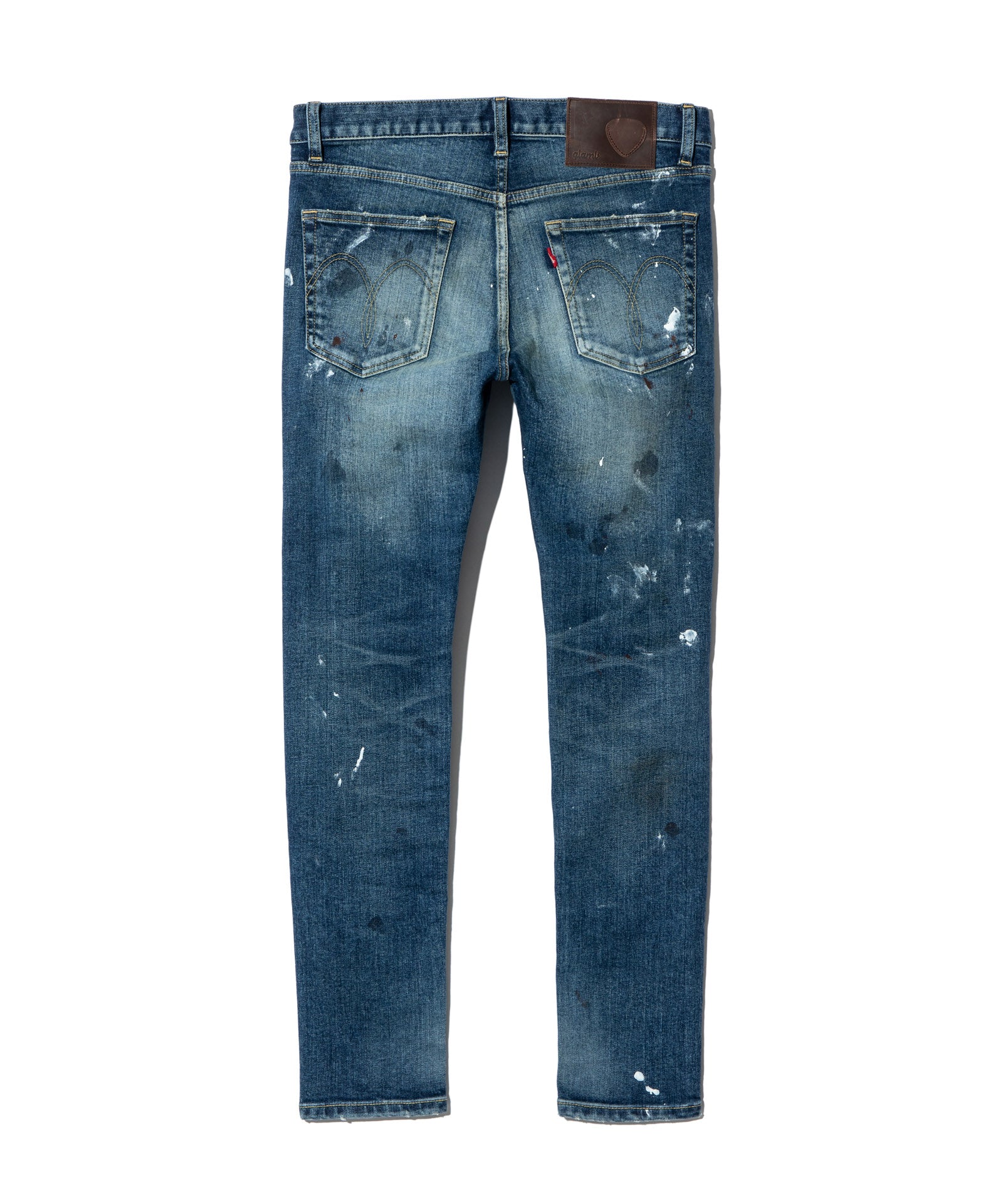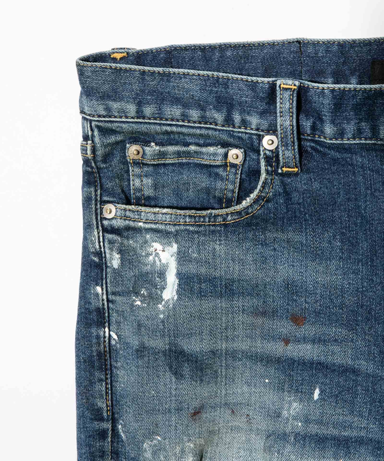 glambが創設時より掲げるグランジの世界観を、デニムの聖地・岡山児島のクラフトマンシップにより結実したHeavy Remake Stretch Denim。タイトシルエットのボディに刻まれたヒゲやハチノス、アタリは熟練の職人が1本1本手作業で削りをいれたもの。そこへクラッシュを加えた後、仕上げに濃色デニムのパッチをリペア調に縫い付け。クラッシュの穴をふさぐようにあしらって肌の露出を防いでおり、世代を問わずに着用できる面持ちとなっています。テキスタイルはストレッチ混デニムを使用。JAPAN MADEのクオリティに溢れた仕上がりは、ワードローブの定番として末永くお楽しみいただけます。
