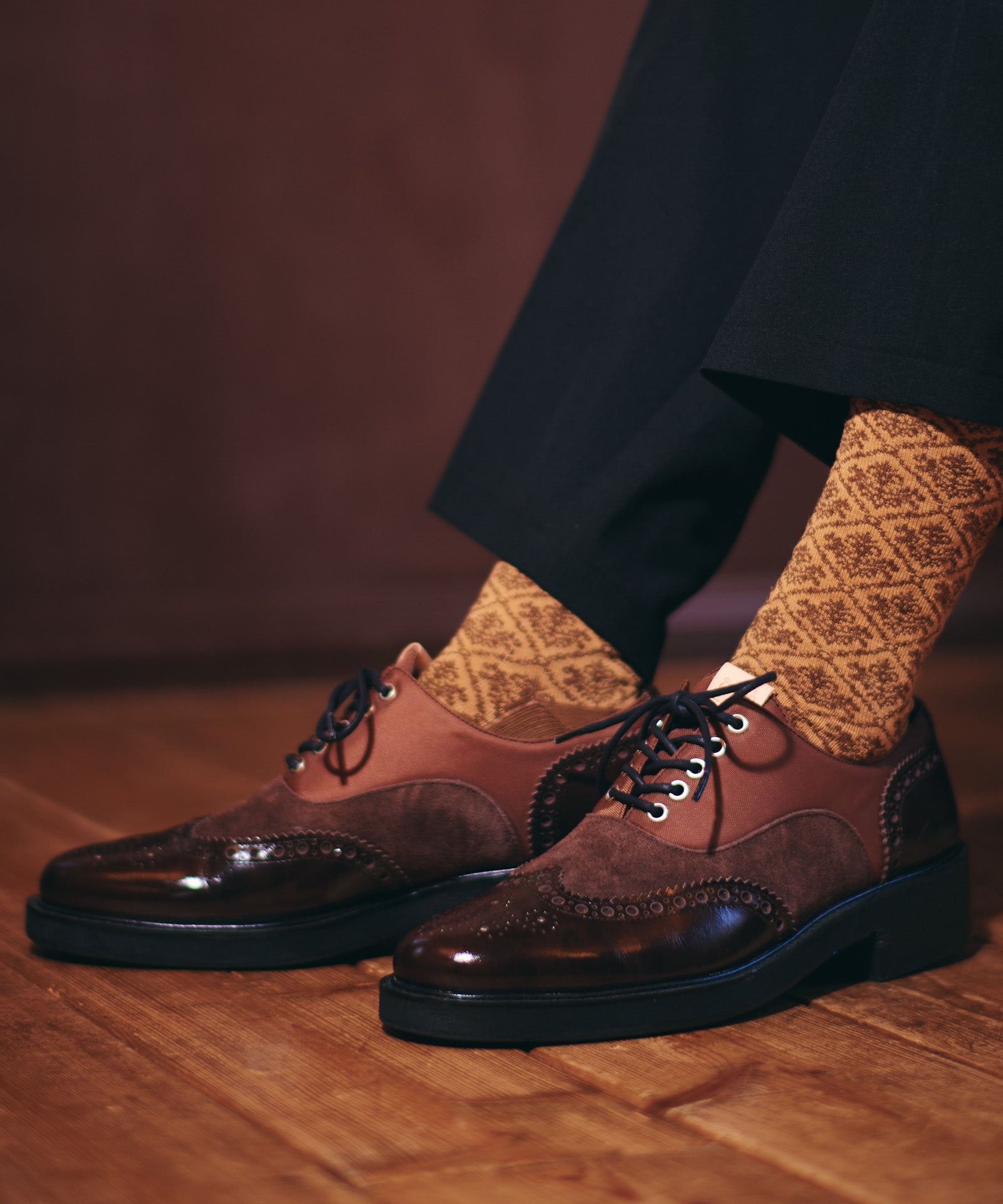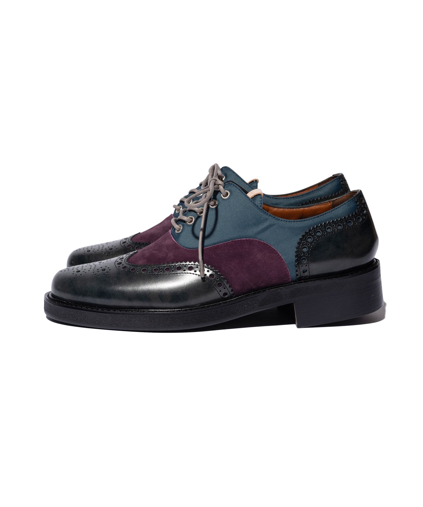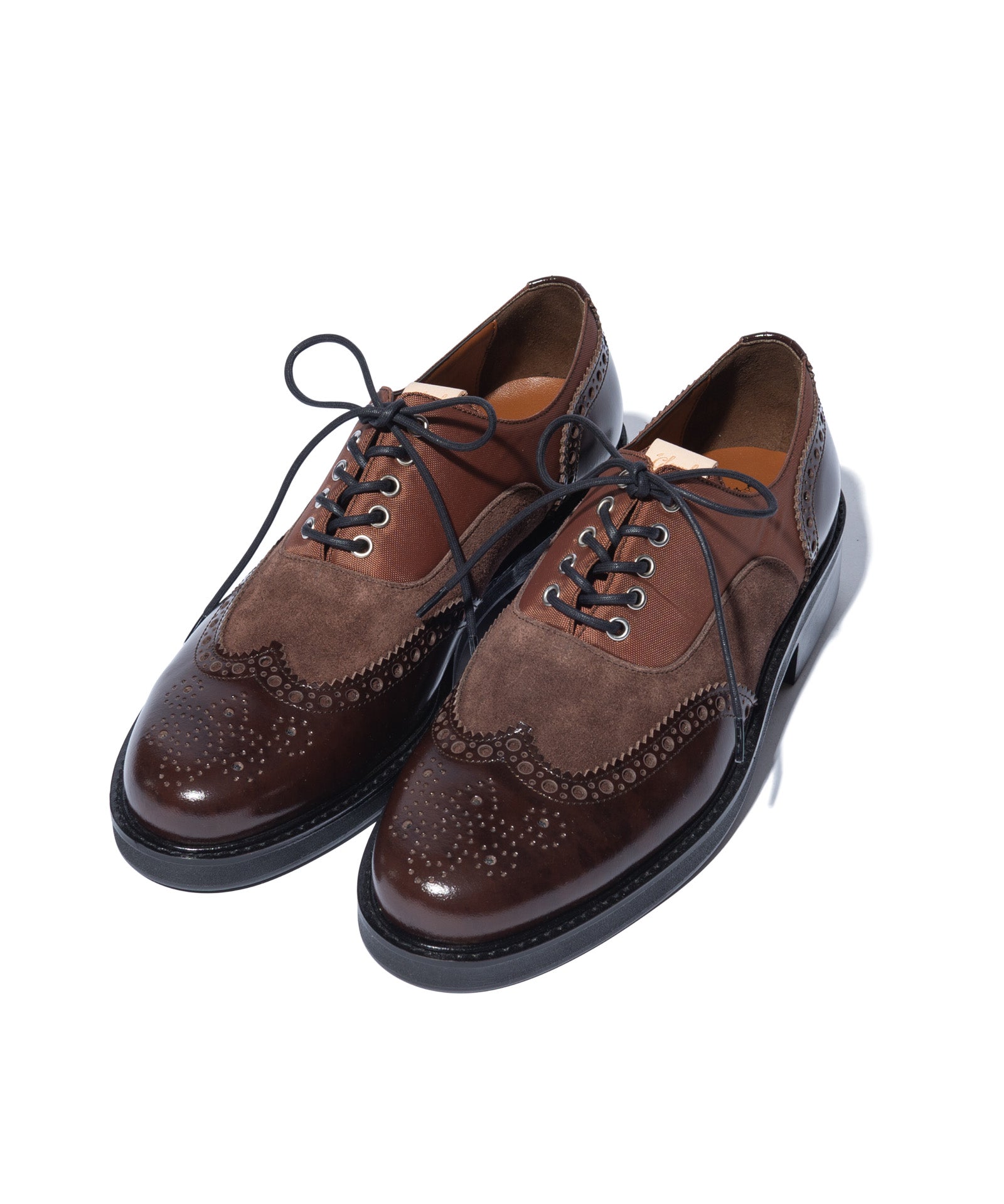ブリティッシュトラッドを象徴するカントリーシューズを異素材ミックスでアーバンに仕立てたMixture Country Shoes。ウイングチップにメダリオンやパーフォレーションを施したトゥはカラバリごとにBlackはシュリンクレザー、BrownとNavyはガラスレザーを使用。配色のシューレースもアクセントとなっております。アッパーはスエード、羽根はアウトドアギアに用いられるナイロンオックスと巧みに使い分け、アクティブでクラフトマンシップあるルックスを作り上げました。ミッドソールにはクッション性に優れるEVA素材を使用。東京にある老舗ファクトリーにて丹念に仕上げてお届けします。