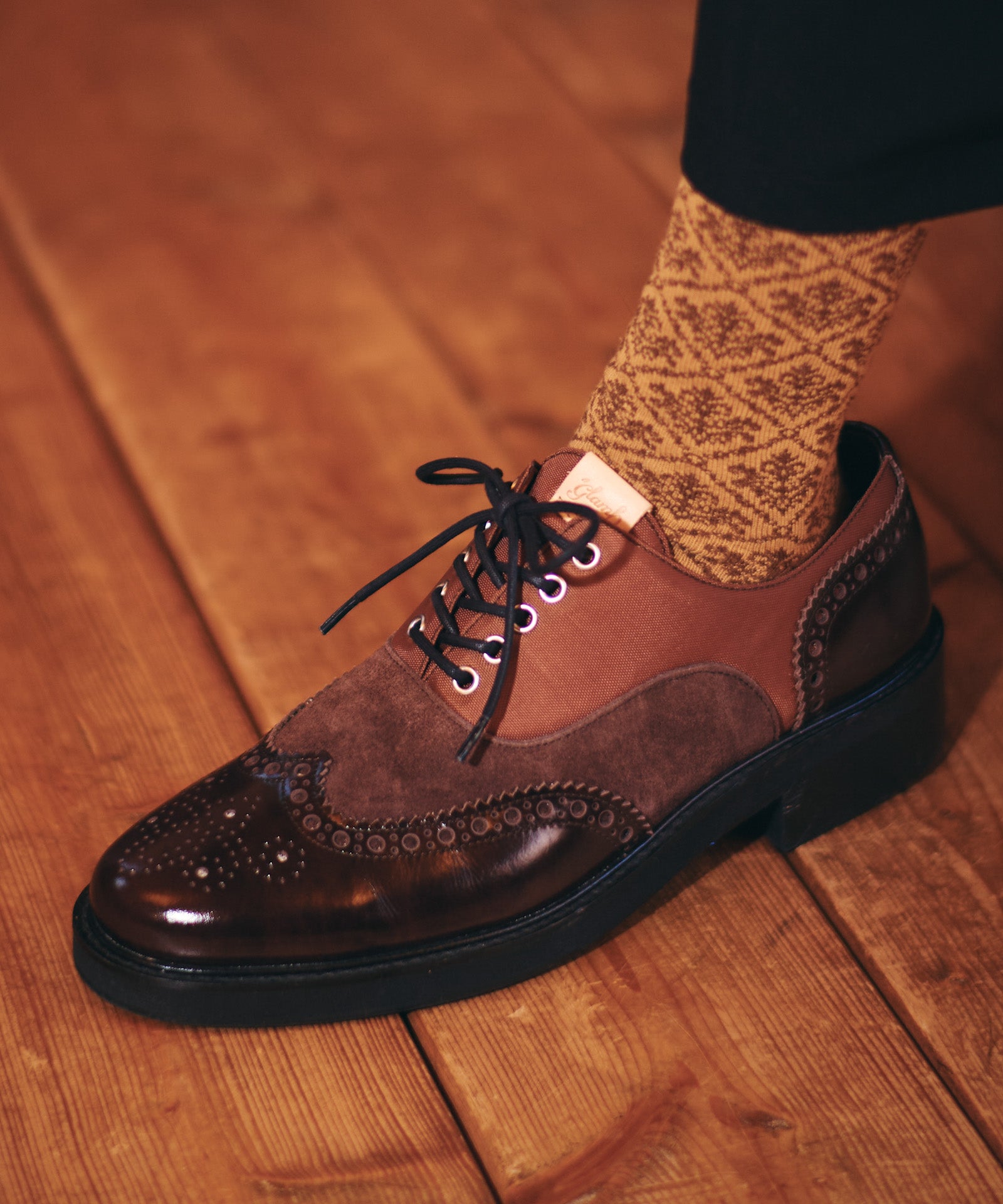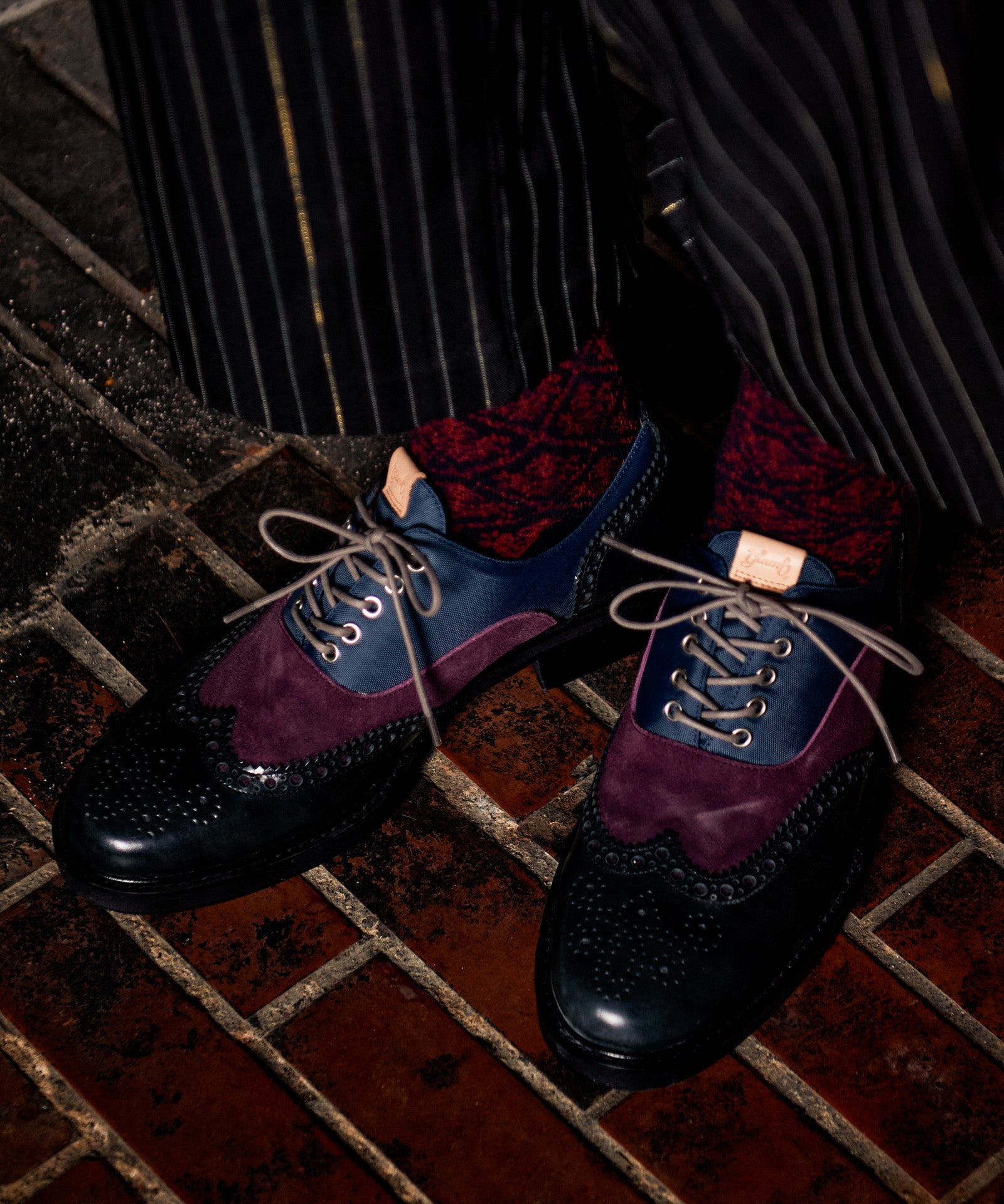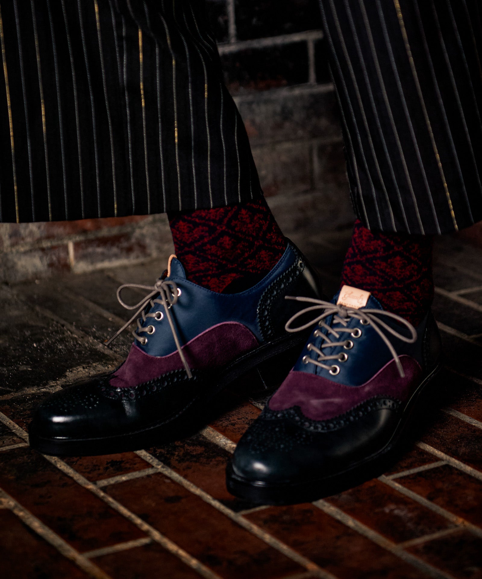 ブリティッシュトラッドを象徴するカントリーシューズを異素材ミックスでアーバンに仕立てたMixture Country Shoes。ウイングチップにメダリオンやパーフォレーションを施したトゥはカラバリごとにBlackはシュリンクレザー、BrownとNavyはガラスレザーを使用。配色のシューレースもアクセントとなっております。アッパーはスエード、羽根はアウトドアギアに用いられるナイロンオックスと巧みに使い分け、アクティブでクラフトマンシップあるルックスを作り上げました。ミッドソールにはクッション性に優れるEVA素材を使用。東京にある老舗ファクトリーにて丹念に仕上げてお届けします。