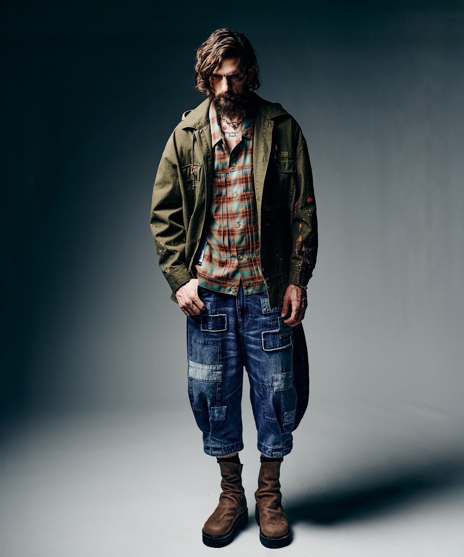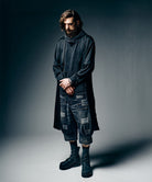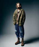 ブランドを代表するデニムクラフト“Unplugged”をデザインコンシャスなクロップドシルエットに乗せたUnplugged Cropped Denim。何より目を奪うのはヴィンテージリペアの技法をデザイン的に昇華するように随所へ施されたパッチワーク。身生地の表裏双方から当て布を施した三層のボディを縫製した後、職人が手作業によってヒゲやアタリの削りを加えた後に洗いをかけることで迫真の表情を生み出しました。クロップド丈のシルエットは、股上にバルーン状のふくらみを持たせながら、裾に2本のダーツを配して縦に絞りを加えたサルエル仕立て。立体的な輪郭とパッチワークがワークとコンフォートをシームレスに融合しました。