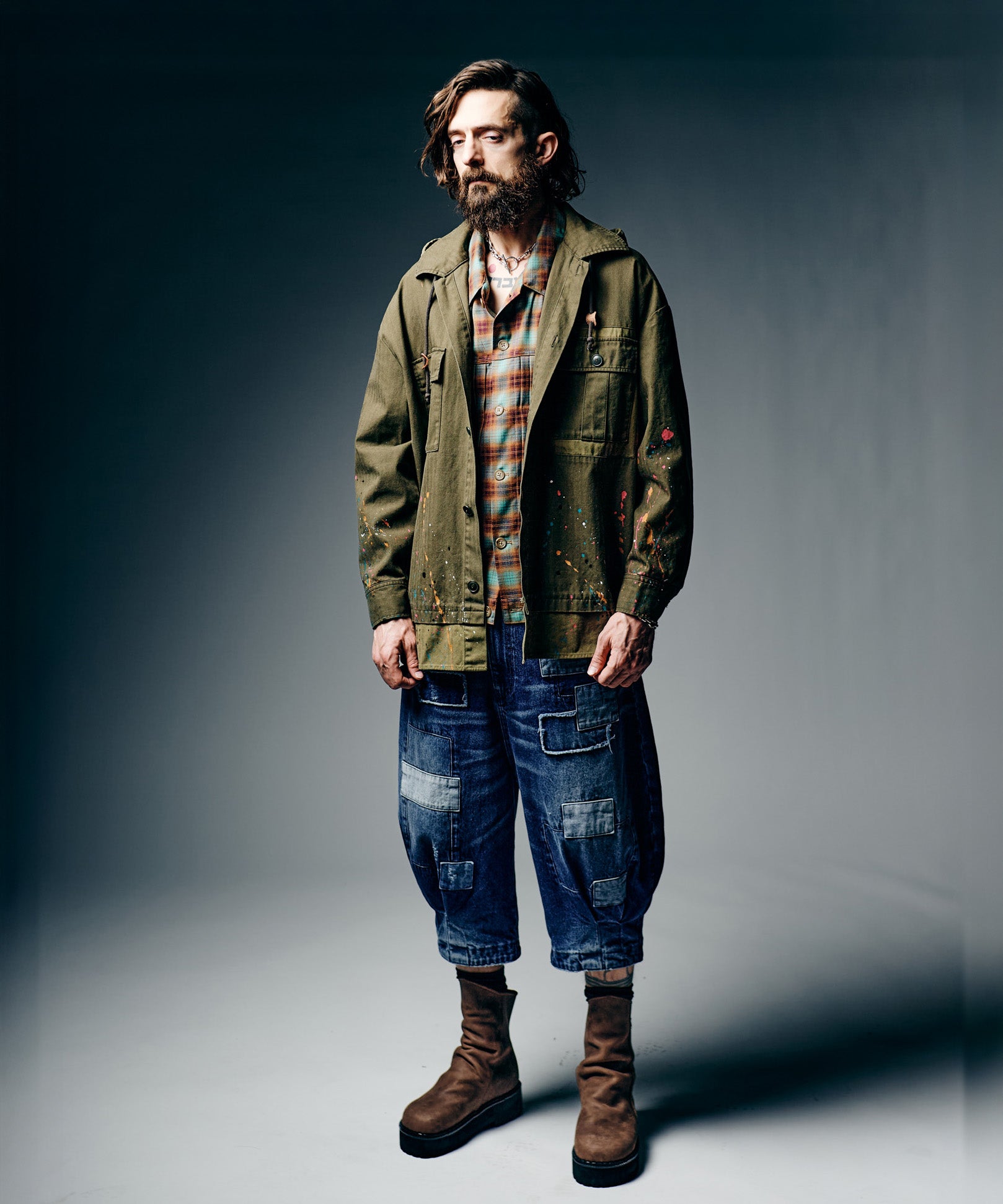 ミリタリーシャツにブランドのアヴァンギャルドなデザインワークを掛け合わせ、唯一無二のトップススタイルを形作ったRemake Hood Military Shirt。シャドーストライプ生地を用いたオーバーサイズのボディは裾に配色でフェイクレイヤードパーツをプラス。さらに身生地と異素材となる無地のツイル生地を用いて左胸にはポケット切り替え、首元には着脱可能なフードを取り付けました。身頃脇にサイズ調整用ボタン、後ろ身頃には全ての撮影を自ら行うブランドを象徴するかのフィルムポケットをあしらうなど、ディテールの追求は随所に。仕上げに裾へスプラッシュペイントを加えてアートピースのような佇まいに仕上げました。