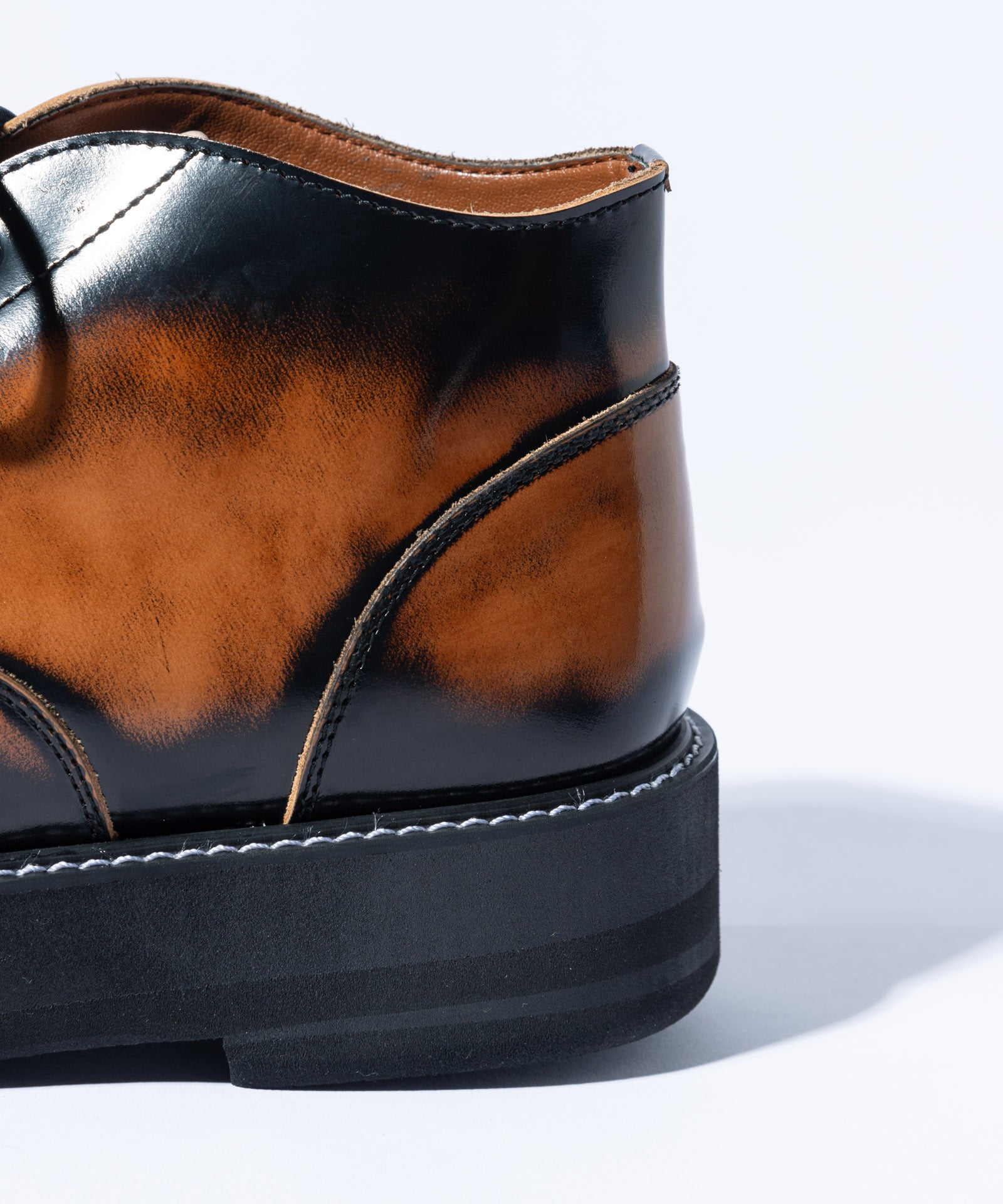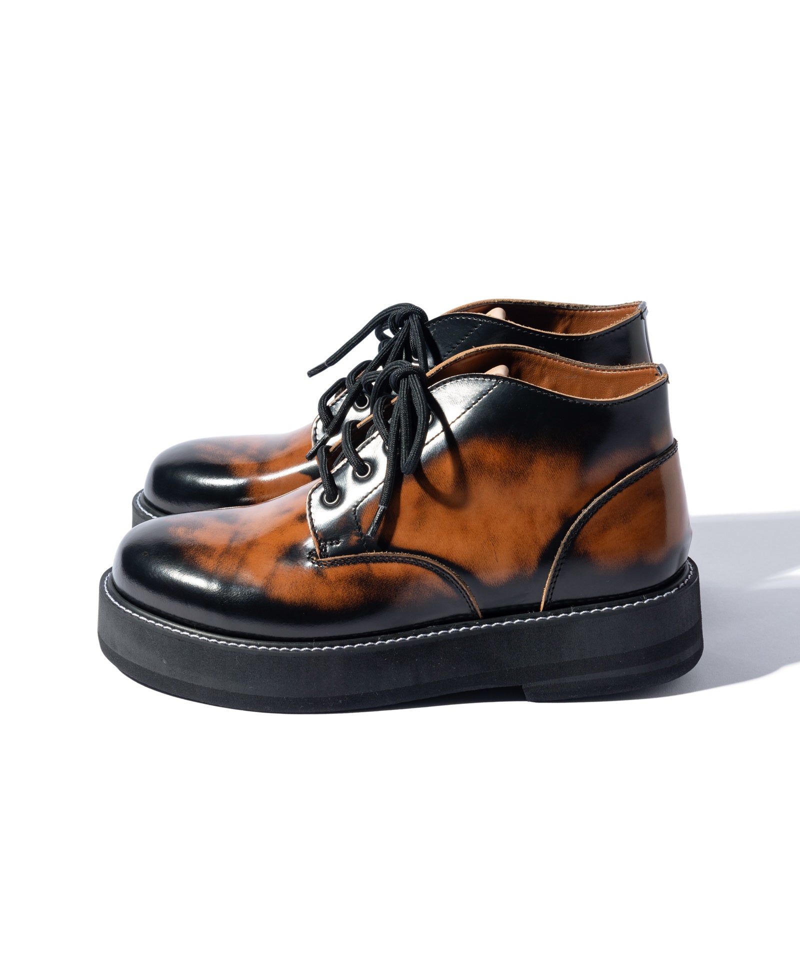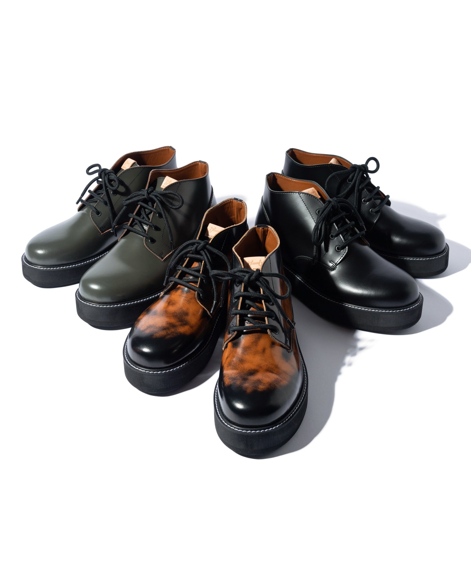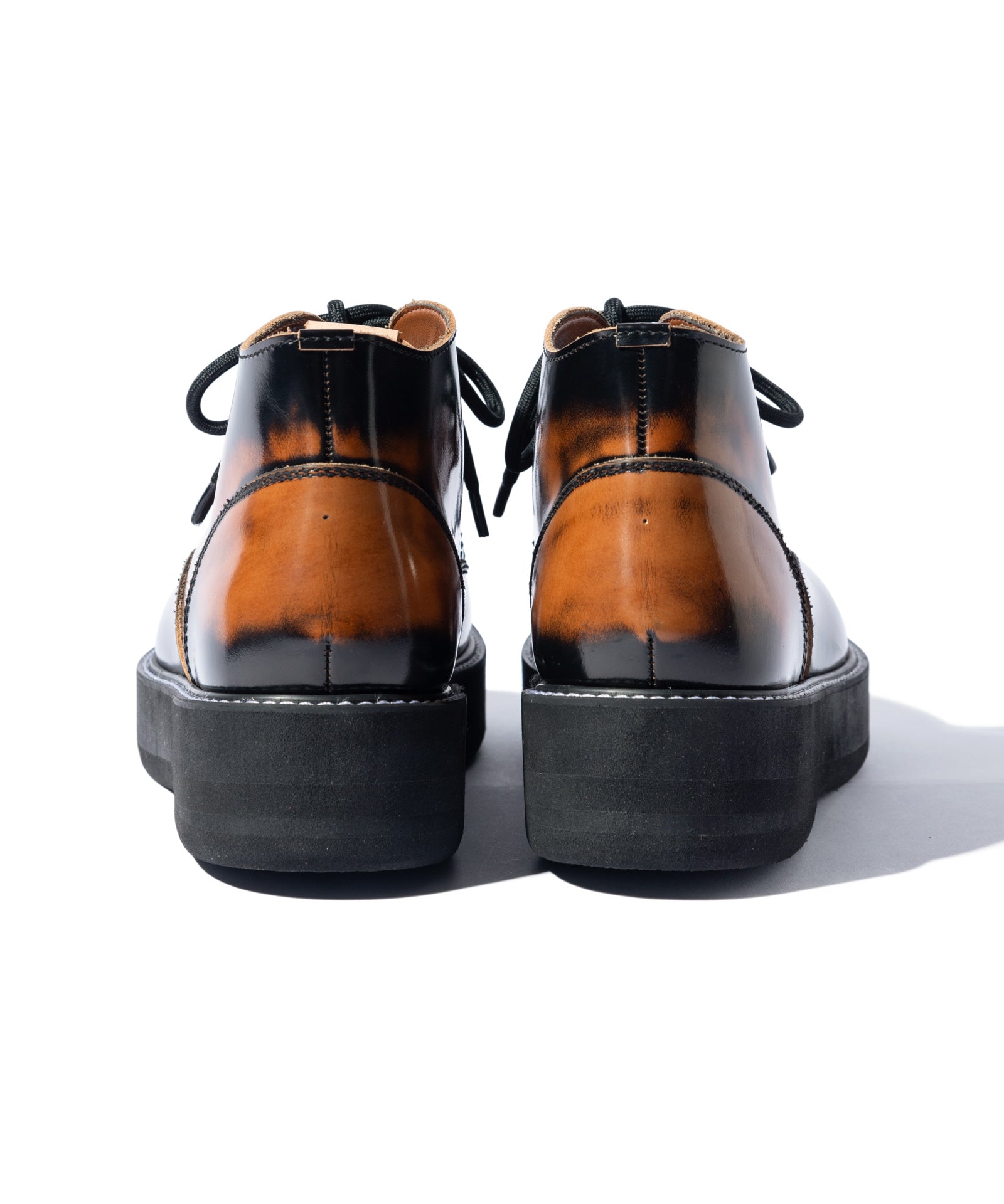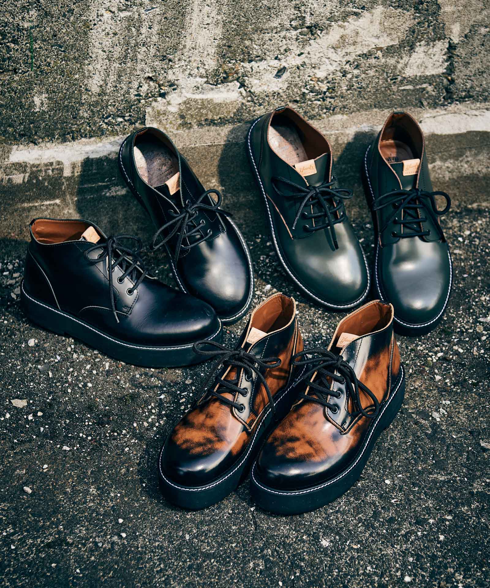 チャッカブーツにレースアップブーツを融合するというアイデアを東京のシューズファクトリーにて丹念に形にしたFour Holes Chukka Boots。2パーツの皮革による構造とラウンドトゥは踏襲しつつ、履き口を流線形にカッティング。4ホールを設けたショートブーツ仕様となっています。ソールは手作業で削りを加えて丸みを出した4.5cmの重厚なダブルソール。ボリュームあるルックスと裏腹にEVA素材により履き心地は軽やかなものとなっています。アッパーにはブランドが選び抜いたカウレザーを贅沢に使用、ワントーンのBlackとKhaki、アドバン加工でアンティークな佇まいを持つBrownの3カラーを揃えました。