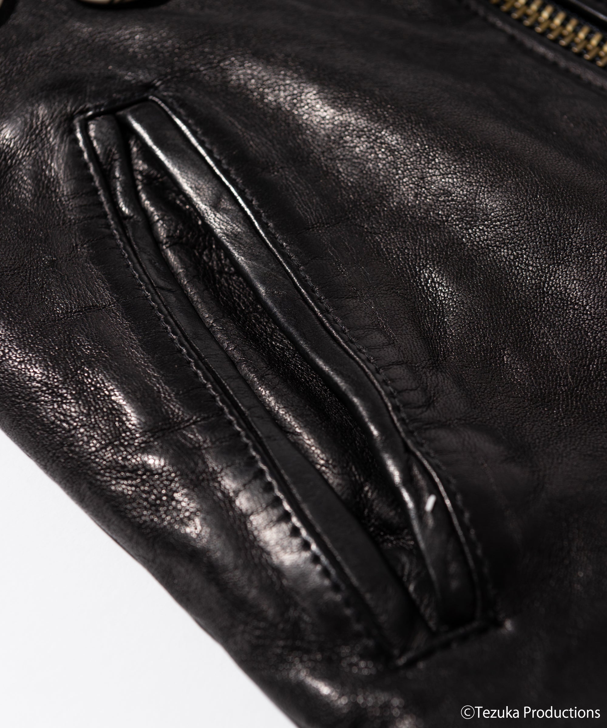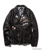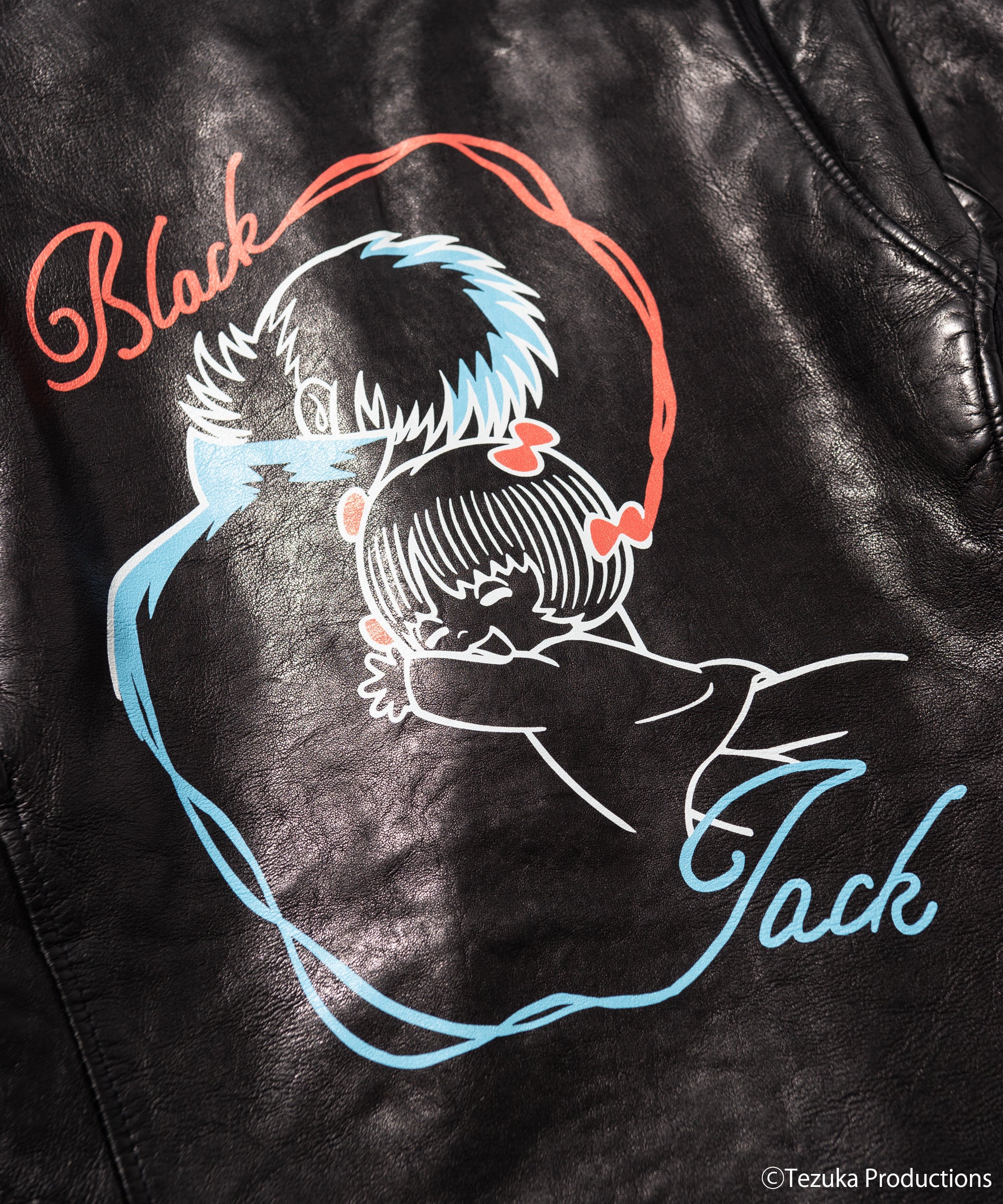 The body is made from lamb leather and is washed after sewing to shrink the leather, giving it a glossy and tough texture, which is the classic Glamb finish. Large prints on the back are portraits of Black Jack and Pinoko. The contrast between the hard leather texture and romantic artwork reflects the brand's interpretation of "Black Jack." The logo of the work is printed on the right side of the front body, and 6 original badges are included to create a rock-inspired style.