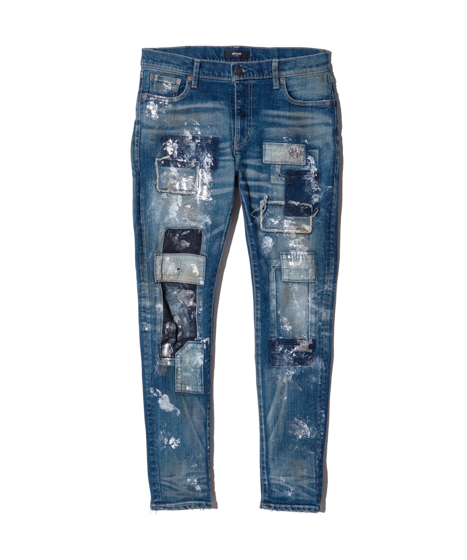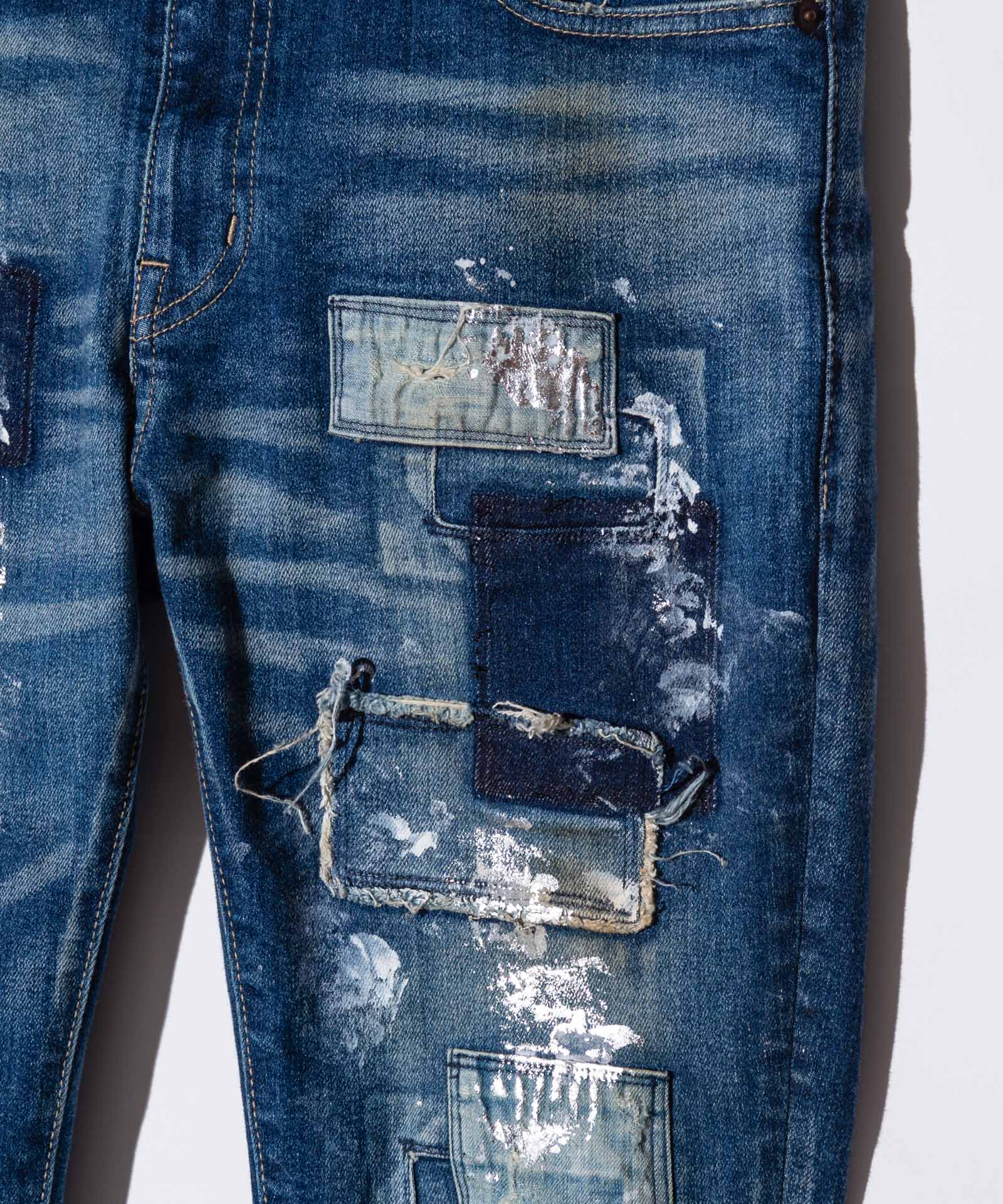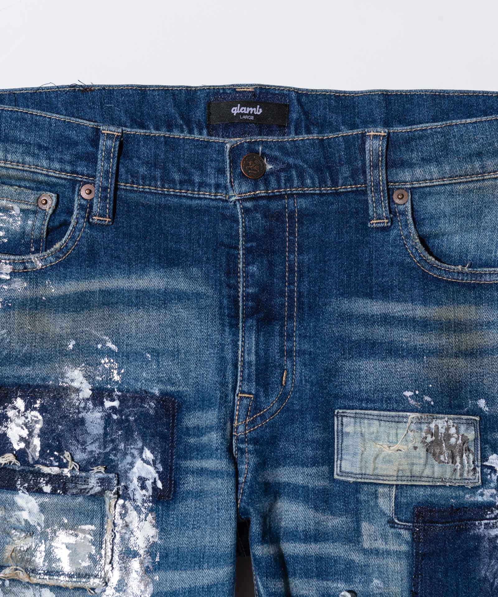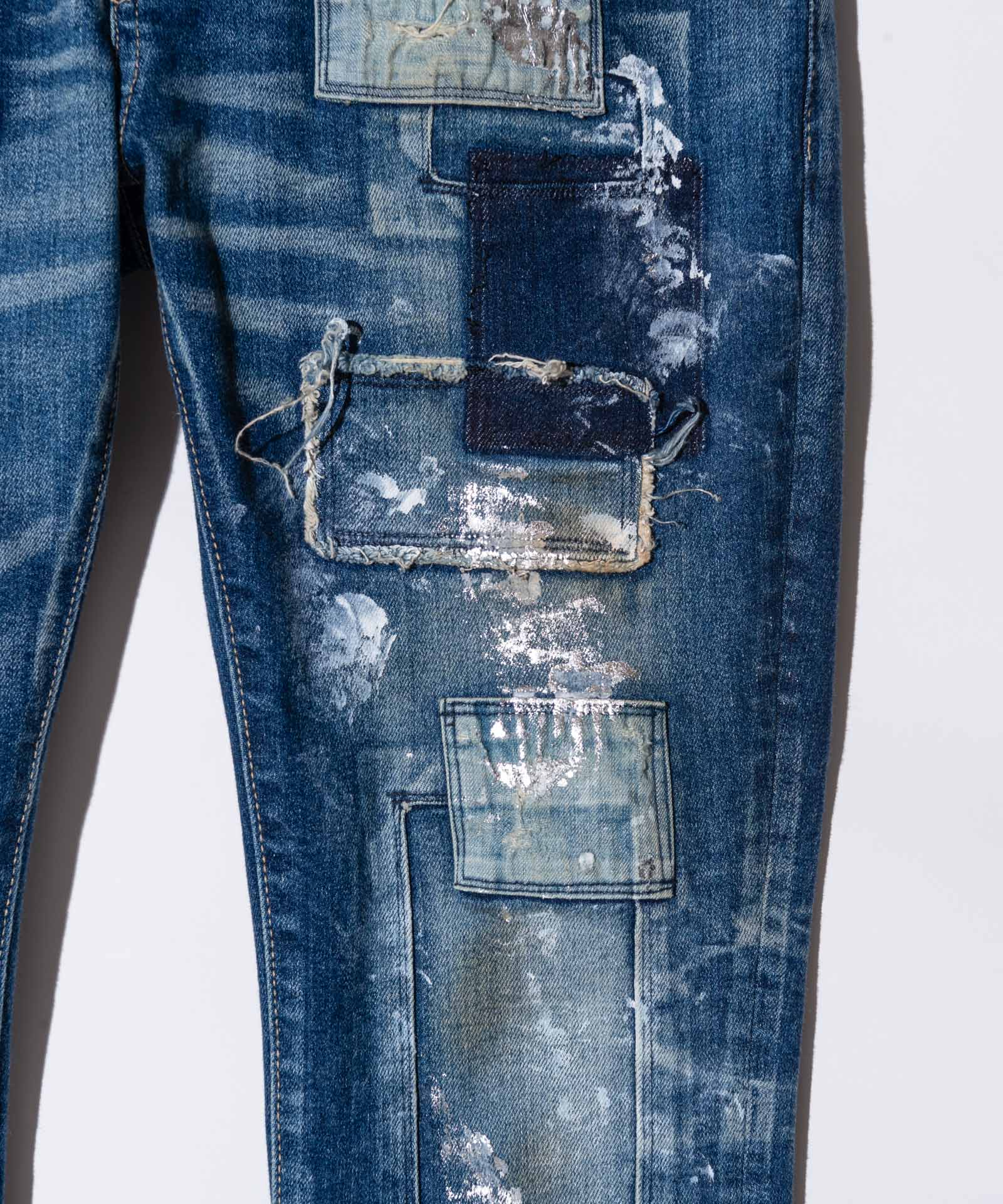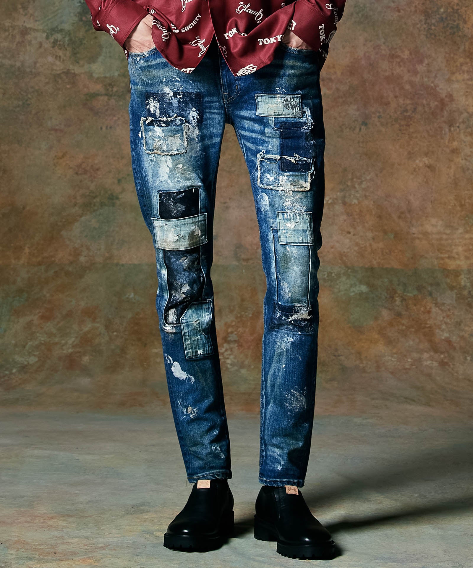 Denim craft, one of glamb's brand identity, has undergone further evolution and is back this season. The patchwork gives a strong grunge feel and is shaped with three layers of craft, with a patch fabric applied from the back as well as the front of the body fabric. The body is hand-shaved and washed by skilled craftsmen, creating an appearance that changes over time. Silver foil processing is a new light that will shed new light on this season. Apply solvent to the fabric, dry it, and then press silver foil onto it. The silver foil is left in a beautiful balance when removed after cooling, and is scattered in a sense that only skilled craftsmen can have, adding a jewelry-like texture to the rugged body. The silhouette is skinny fitting that shapes the contours that stick to the footline. The textile is made from stretch denim, which takes mobility into consideration.