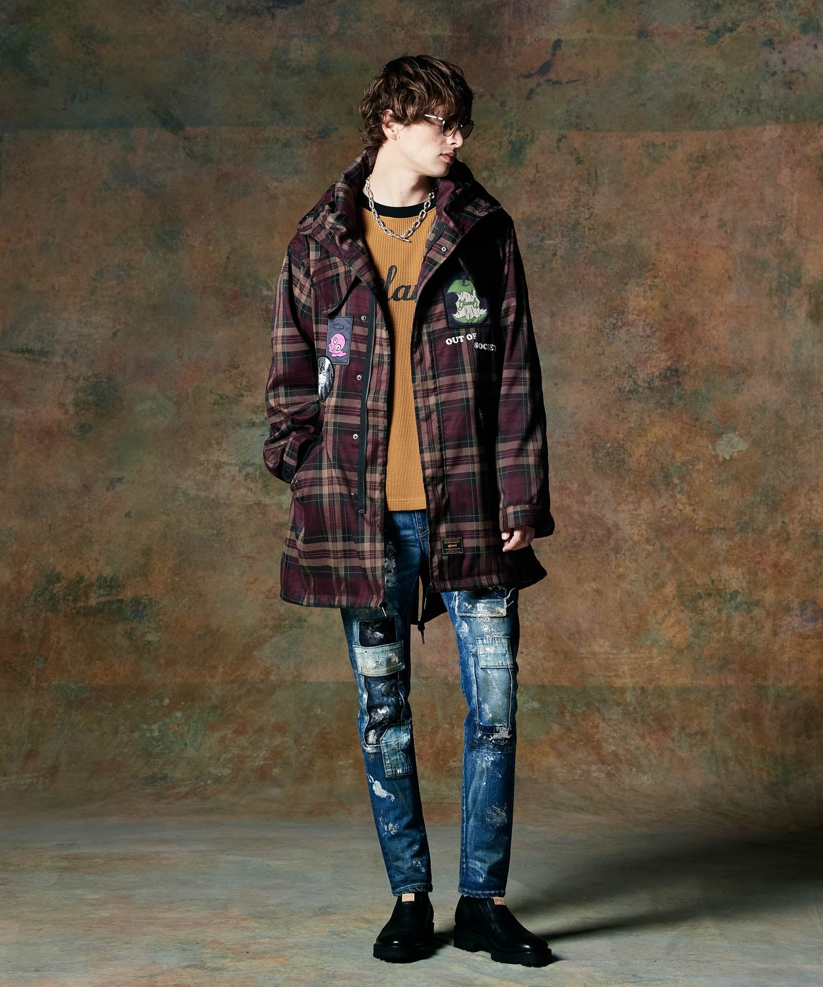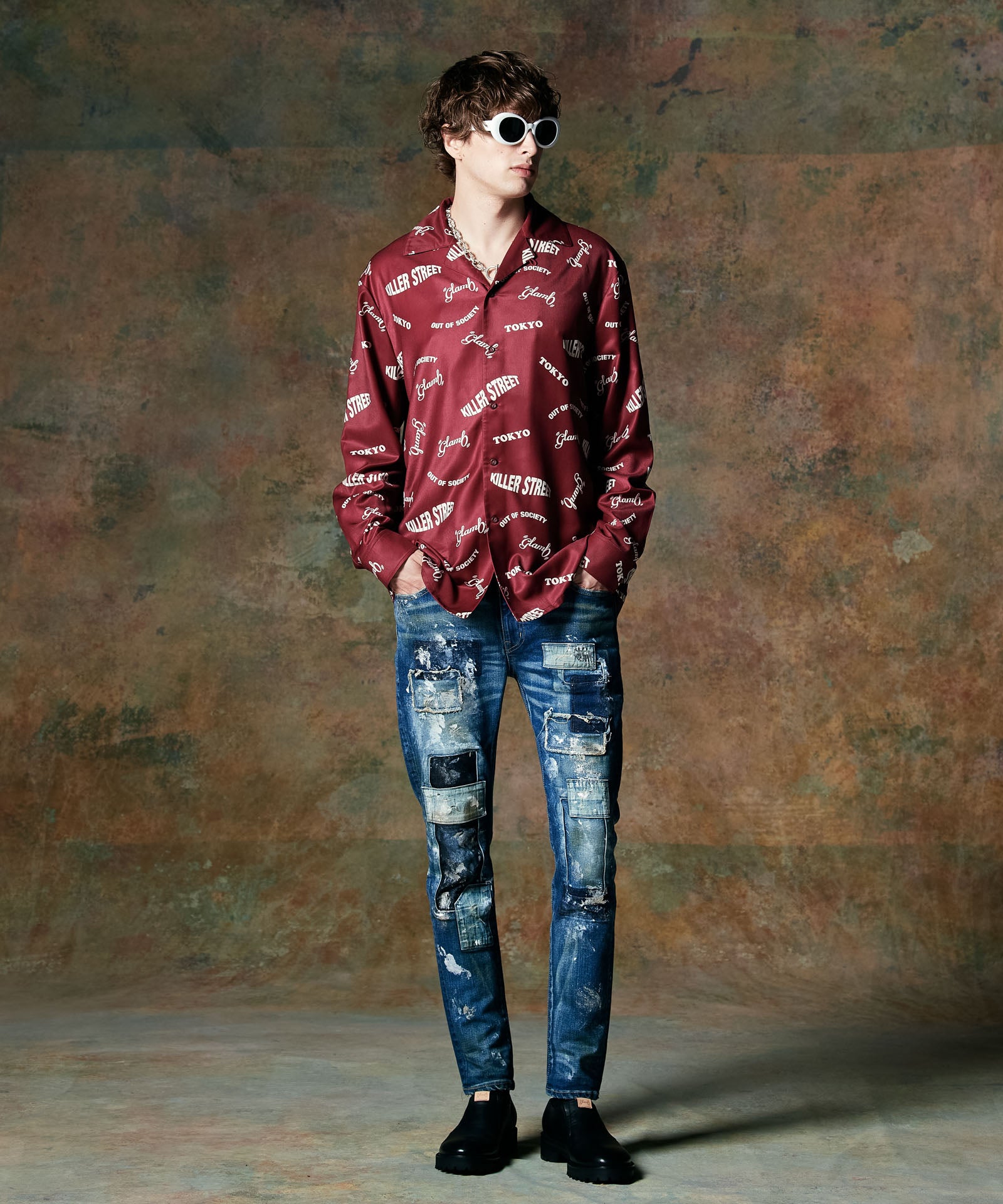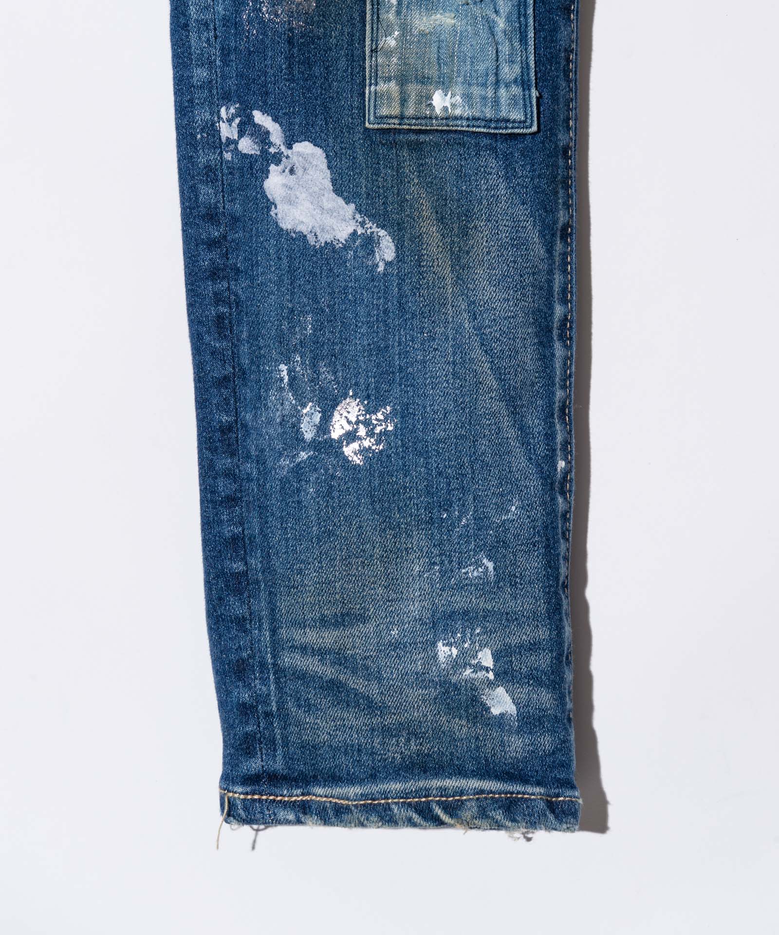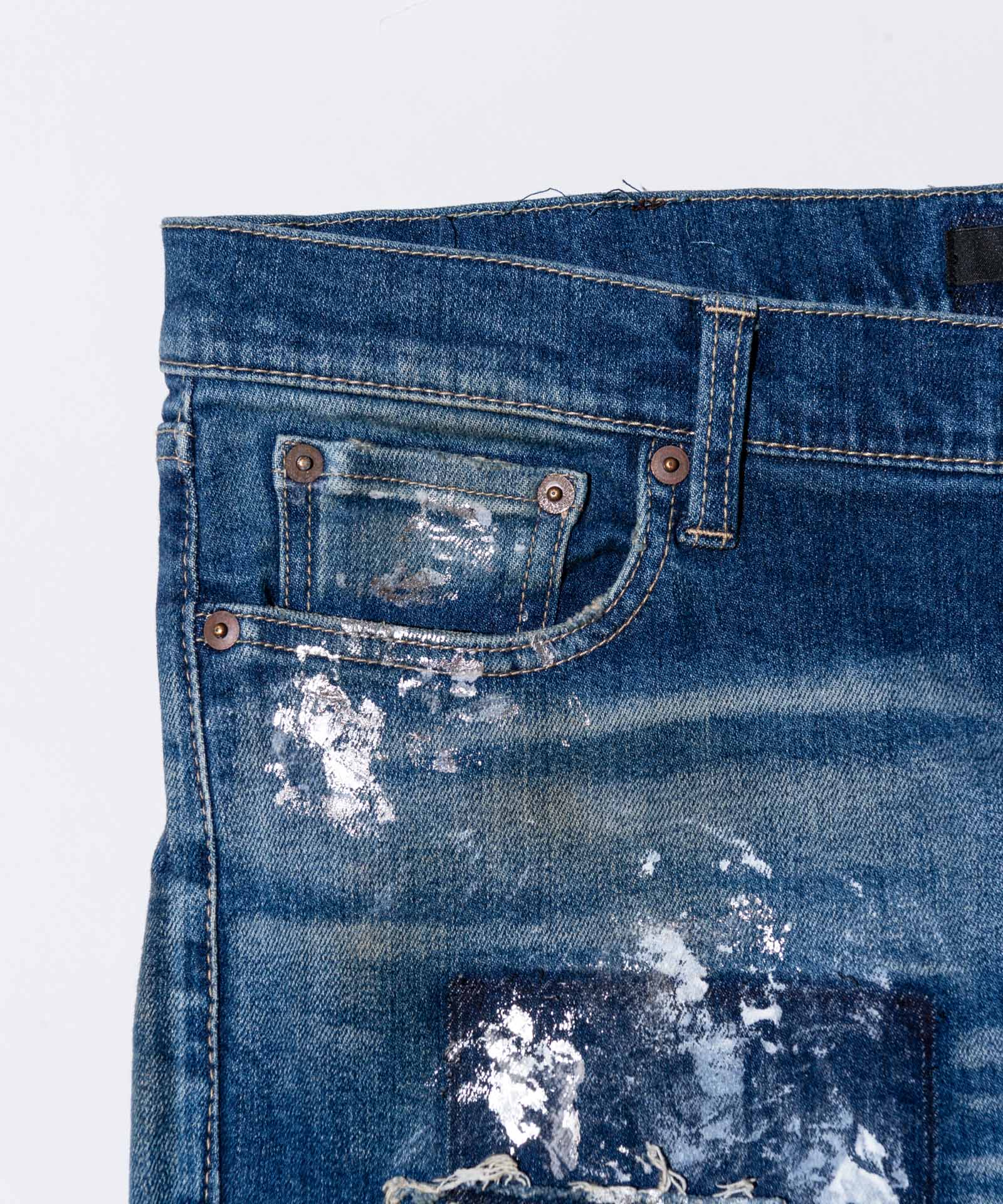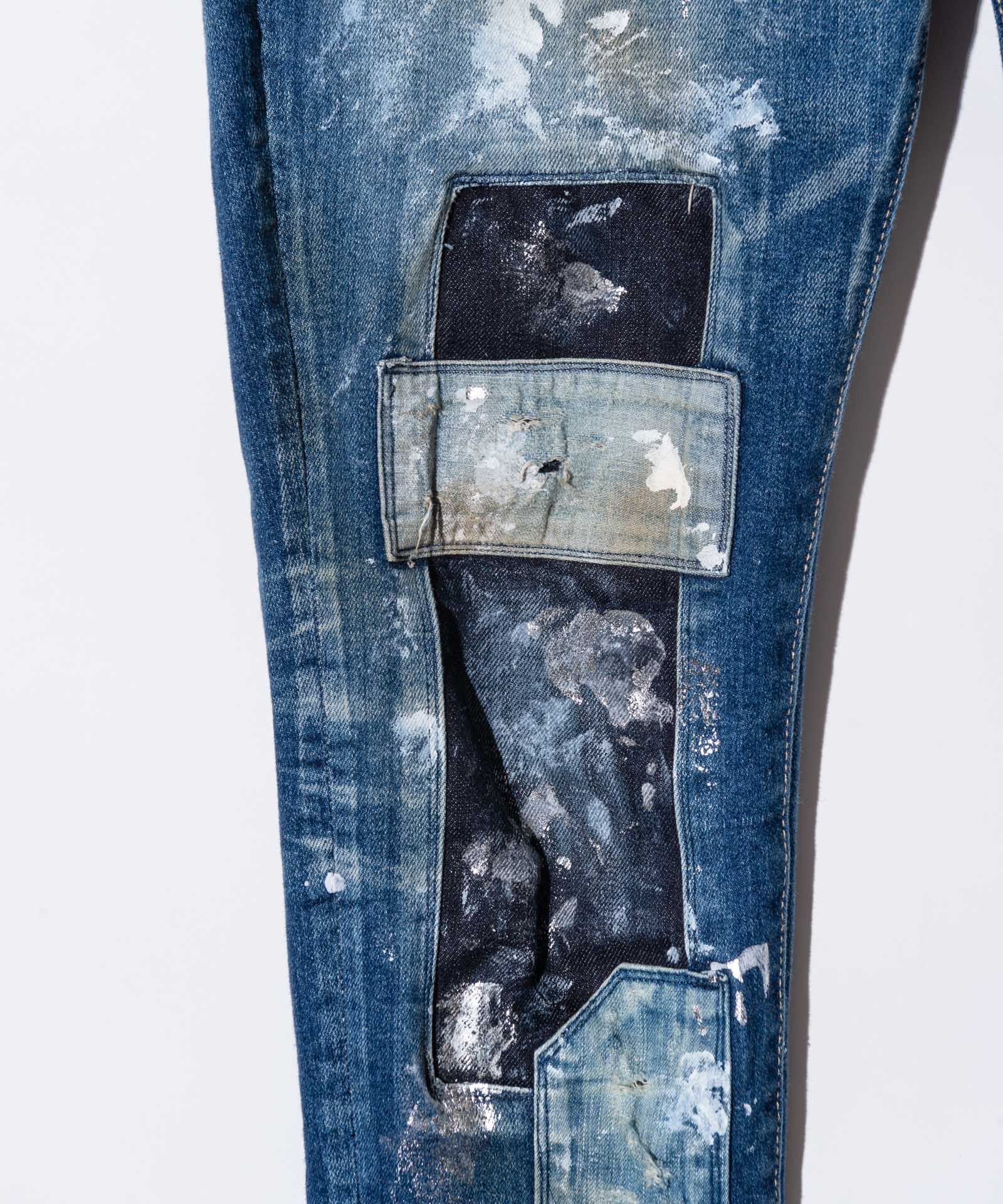 Denim craft, one of glamb's brand identity, has undergone further evolution and is back this season. The patchwork gives a strong grunge feel and is shaped with three layers of craft, with a patch fabric applied from the back as well as the front of the body fabric. The body is hand-shaved and washed by skilled craftsmen, creating an appearance that changes over time. Silver foil processing is a new light that will shed new light on this season. Apply solvent to the fabric, dry it, and then press silver foil onto it. The silver foil is left in a beautiful balance when removed after cooling, and is scattered in a sense that only skilled craftsmen can have, adding a jewelry-like texture to the rugged body. The silhouette is skinny fitting that shapes the contours that stick to the footline. The textile is made from stretch denim, which takes mobility into consideration.