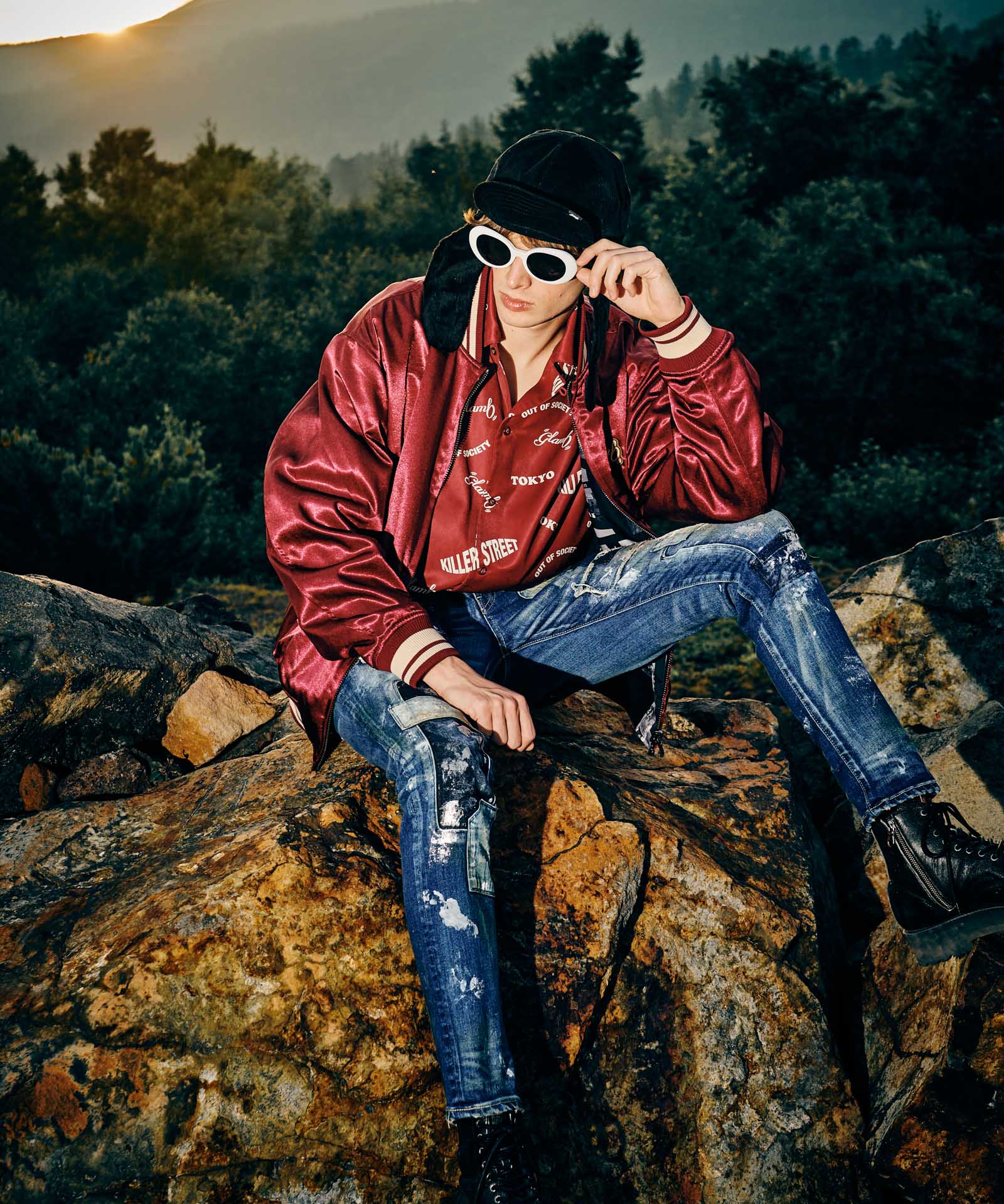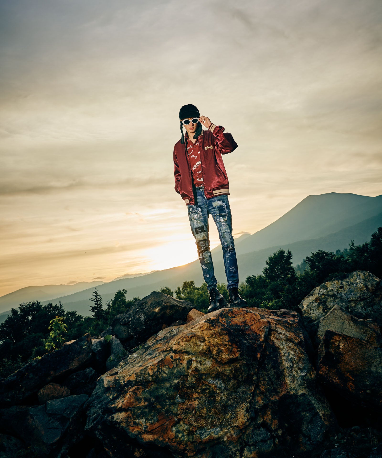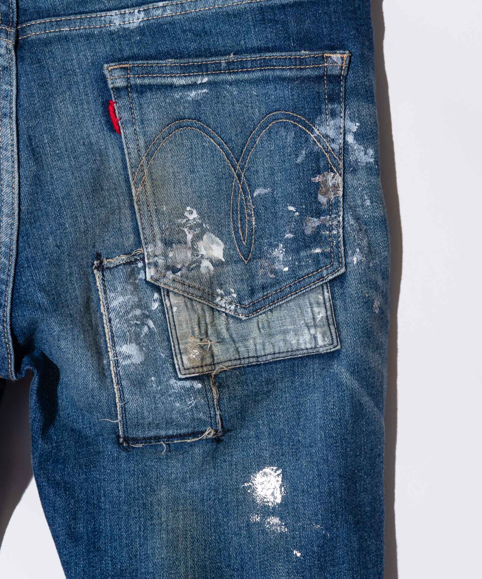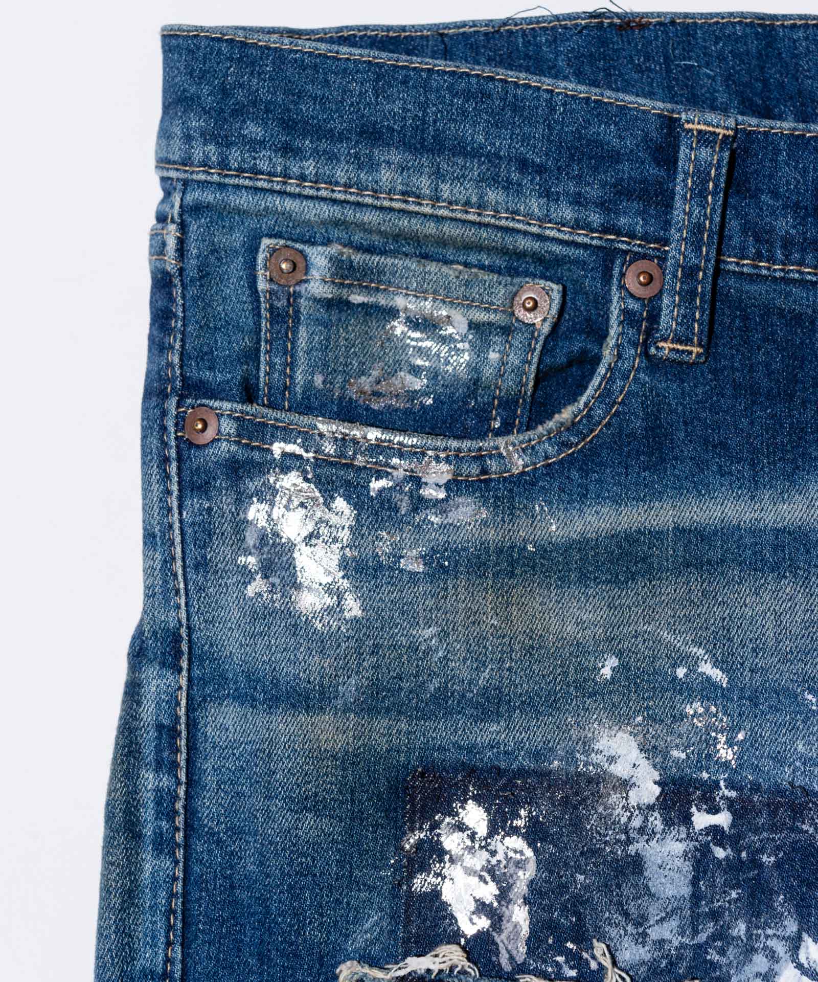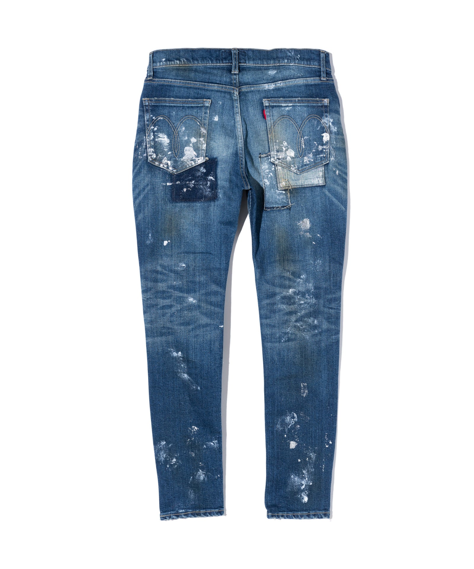Denim craft, one of glamb's brand identity, has undergone further evolution and is back this season. The patchwork gives a strong grunge feel and is shaped with three layers of craft, with a patch fabric applied from the back as well as the front of the body fabric. The body is hand-shaved and washed by skilled craftsmen, creating an appearance that changes over time. Silver foil processing is a new light that will shed new light on this season. Apply solvent to the fabric, dry it, and then press silver foil onto it. The silver foil is left in a beautiful balance when removed after cooling, and is scattered in a sense that only skilled craftsmen can have, adding a jewelry-like texture to the rugged body. The silhouette is skinny fitting that shapes the contours that stick to the footline. The textile is made from stretch denim, which takes mobility into consideration.